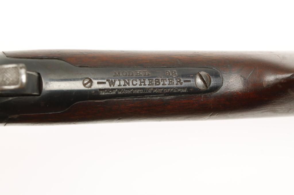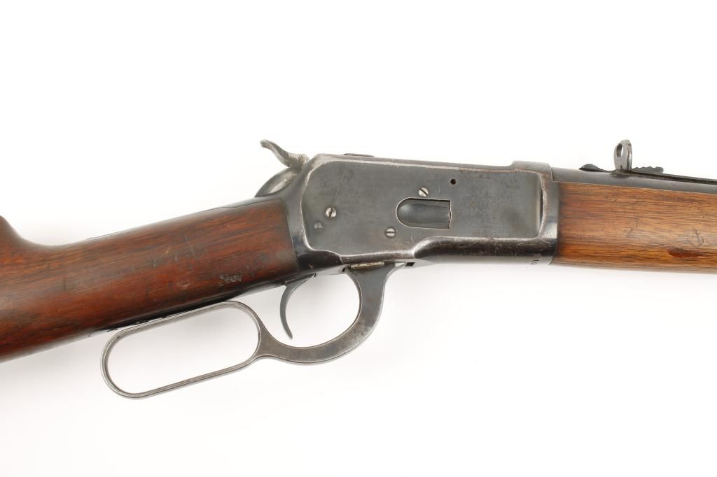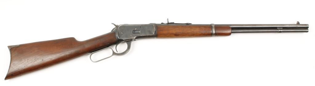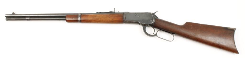 Winchester Model 1892 saddle ring carbine in .25-20 caliber with all features as standard on carbine except showing no saddle ring and rifle type stock with rifle butt. The barrel and magazine tube show 30% to 60% originalblue evenly drifting and toning with some losses at the edges and minor erosion and pinprick pitting with some scratches. The barrel address is good and the frame shows 75% to 85% original blue thinning at the high points and edges with some scratches. The wood fits well and is in good condition with normal wear and some small chips. The rear sight is an oversized Buckhorn in the correct dovetail and is unmarked but is of the typemade by Sheard, King and other Western sight makers. The front sight blade has been slightly altered and is in its original base. The action is good and the bore is very good and looks like it may clean to excellentonce the dirt is removed. An interesting 92 that may or may not letter with these features as records are intermittent in this range but it looks factory original. Est.: $1,100 -$2,200.
