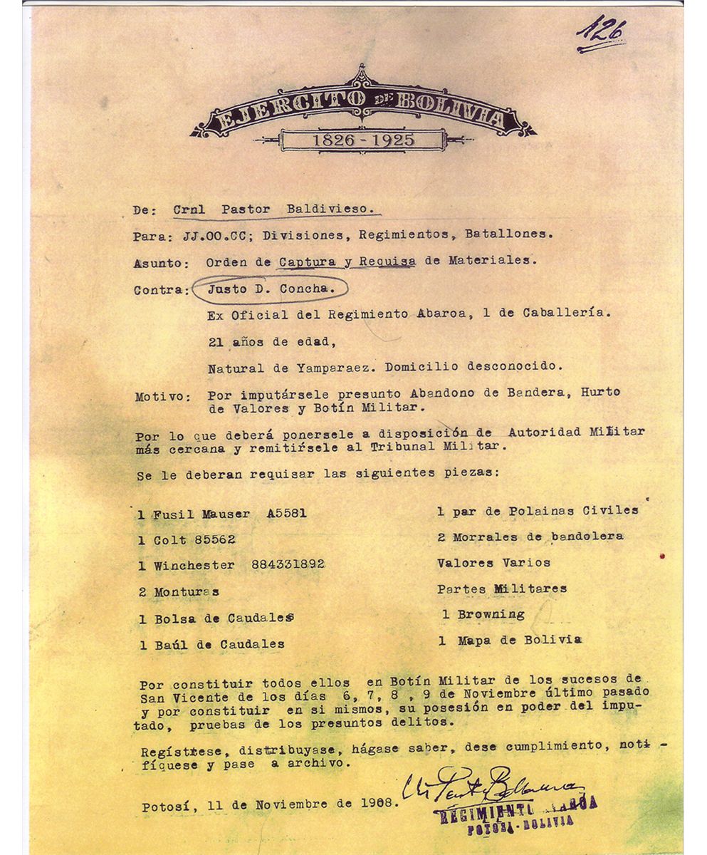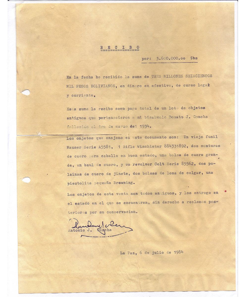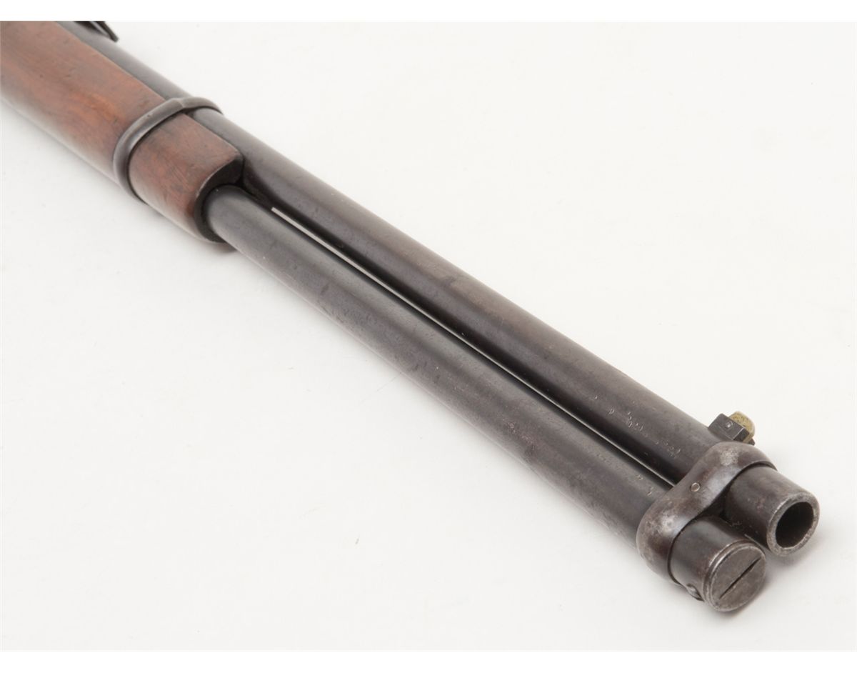 Winchester Model 1892 saddle ring carbine in .44-40 caliber, serial number 88433 for 1894 with documentation as having been used by outlaws Butch Cassidy and Harry Longabaugh aka the Sundance Kid during the climactic shootout in which bothoutlaws perished following their daring theft of the payroll from the Aramayo Mining Company payroll transport near Tupiza, Bolivia which was immortalized by the classic film showing the ferocious battle at the end of the movie. Thiscarbine retains 50%-70% original blue and is in very good original condition showing some minor scratches, mars and normal use. The stocks also are very good plus with some minor losses, light scratches and just normal aging. The markings aregood and the bore is good to very good. The documentation mentions this Winchester by serial number and the fact it was recovered by Captain Justa Concha of The Albaroa Special Force Cavalry Unit attached to the Bolivian Army. The documentsare from Concha's descendants and the a newspaper printed by the Bolivian Army and the provenance traces the Winchester from Nov. 7th, 1908 to modern times. See attachments on the website including copies of docs, photos, and more info.