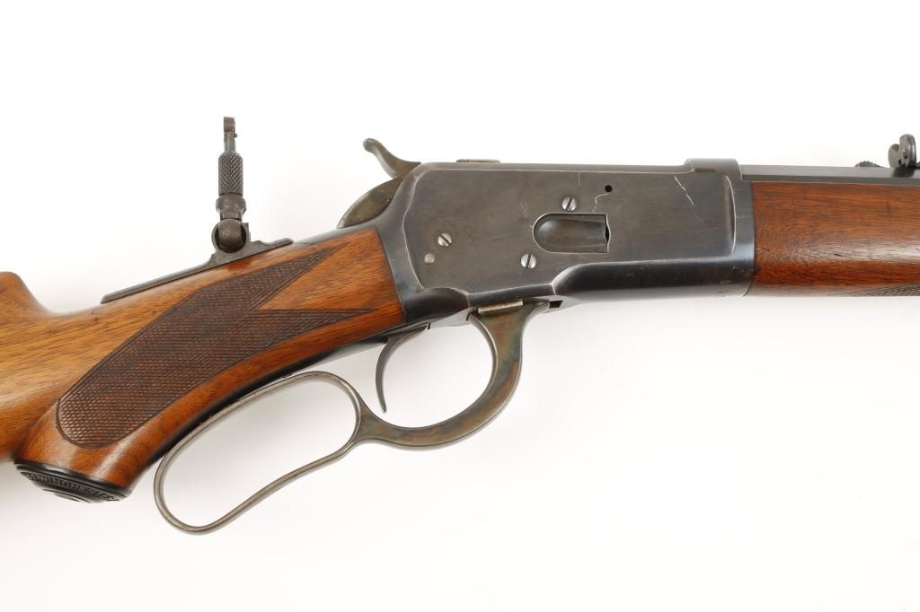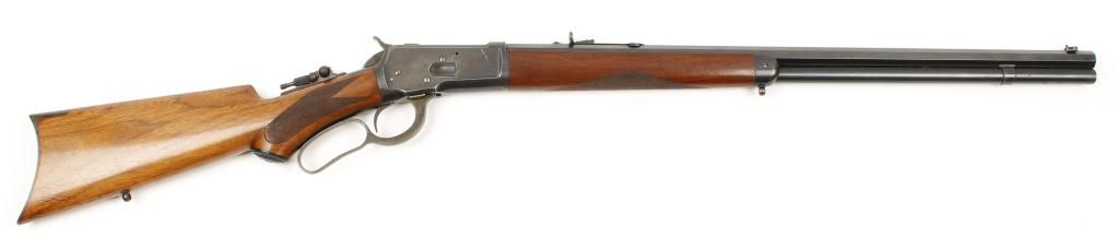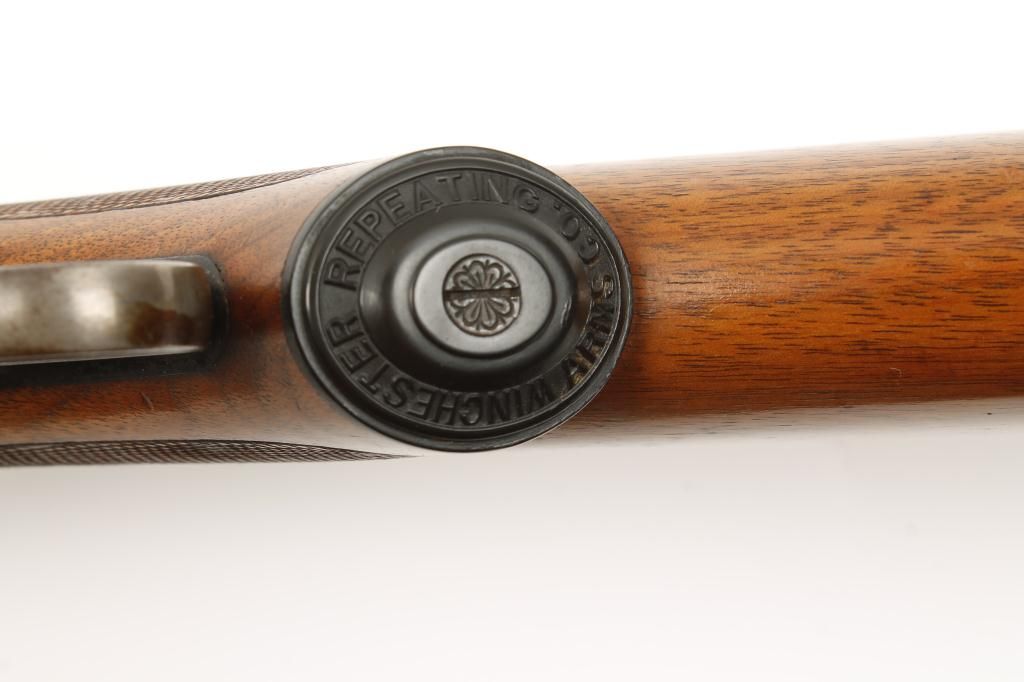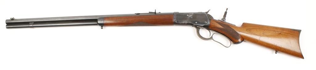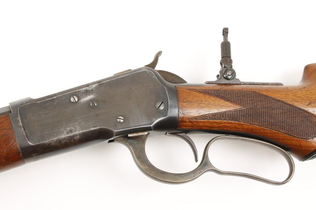 Winchester Model 1892 special order rifle in .44-40 caliber with 24” octagon barrel, full magazine, rifle butt, checkered pistol grip, standard grade stocks, sling swivel studs, Lyman tang sight and folding beech type front sight. The rifle remains in very good plus to near fine condition showing 85% to 95% original blue with some slight drifting at the edges of the barrel and a couple areas of erosion and cleaning on the left side of the frame. There is some pitting that is minor in the area that was cleaned. The front and rear sight are in the original dovetails. The stocks are very good plus with 75% to 85% original varnish and sharp checkering. Thepistol grip cap shows Winchester markings. The hammer and lever show 75% to 85% of their original case hardening just darkening slightly. The bolt and loading gate show 80% to 90% thinning original blue. The action isgood and tight and the bore is bright to near excellent condition. Serial number 97036 made about 1896-97. Est.: $3,000-$6,000.