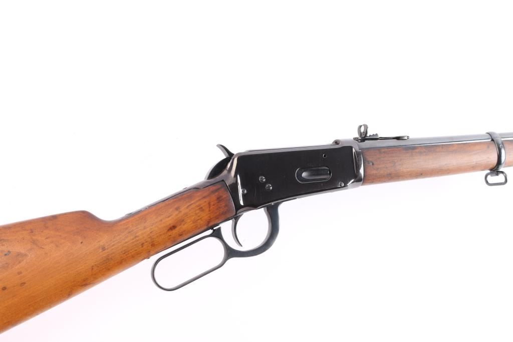 "Eastern Carbine" Antique lever action repeating rifle chambered in .30-30 Winchester manufactured in New Haven, CT circa 1894, first year of production. Features a re-blued finish, 20" round barrel, This is a smokeless powder barrel, Winchester used these barrels first in 1895, the carbine has been rebarreled at some point, possibly by the factory, full-length tube magazine, early soldered base with "Sheard" pinned blade front sight , "D.W. King" rear buckhorn sporting sight, smooth trigger, knurled hammer spur, smooth walnut forend with barrel band, and straight grip shoulder stock with crescent metal buttplate, sling swivels. Standard Winchester markings are clear. Rifle retains most of the old re-blued finish with some very minor rubs/scratches. Action is sound, the bore is overall good with strong rifling, scattered very light pitting and the walnut stocks are good, have been lightly sanded. There is a 3" hairline crack on the left wrist.