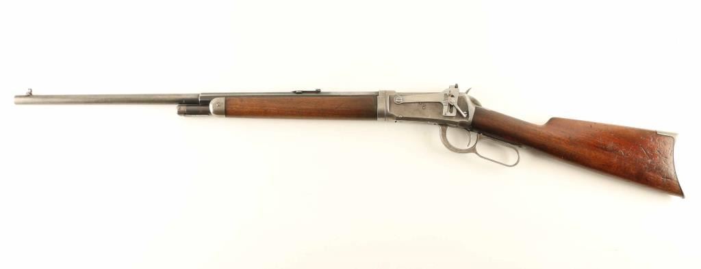 Takedown rifle manufactured circa 1902. Features 24" 1/2 round - 1/2 octagon barrel, half length magazine tube, takedown lever at magazine cap, beach combination front sight, folding rear sight (marked "MARBLE") in barrel dovetail, Lyman receiver mounted rear peep sight with quick throw lever for elevation adjustment, straight grip, steel crescent buttplate. Bore is fair condition, frosted with dark grooves, strong rifling. Barrel & magazine tube retain 20% blued finish, thinning or showing gray colored bare metal at edges of flats, round portion of barrel, places on mag tube. Rear sight displays even coverage of pitting, cleaned to bare metal. Action is mostly dull silver colored bare metal, some traces of dark gray color in protected areas, scratches to receiver, pitting on finger lever. Lyman sight is bare metal, no markings remain. Screw slots are generally good. Forend is good condition, dented & scratched, visible wood loss at left rear. Butt is good or better condition with creases and dents, fair fit to buttplate due to wood loss at toe. Markings are generally sharp and readable. Action operates smoothly. Includes letter from Cody Firearms Museum / Buffalo Bill Historical Center listing manufacturer's data for this rifle as shipped from the factory. Letter specifies "Sporting Rear Sight" which appears replaced by the current folding Marbles sight. Condition is NRA Good *** C&R Firearm ***
