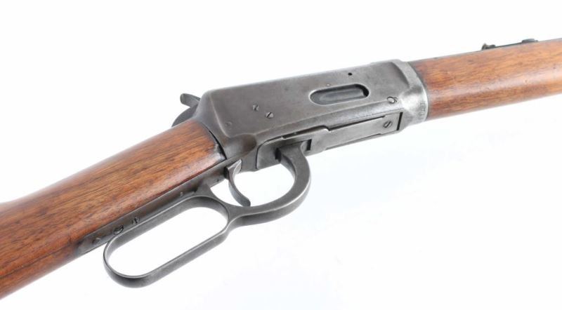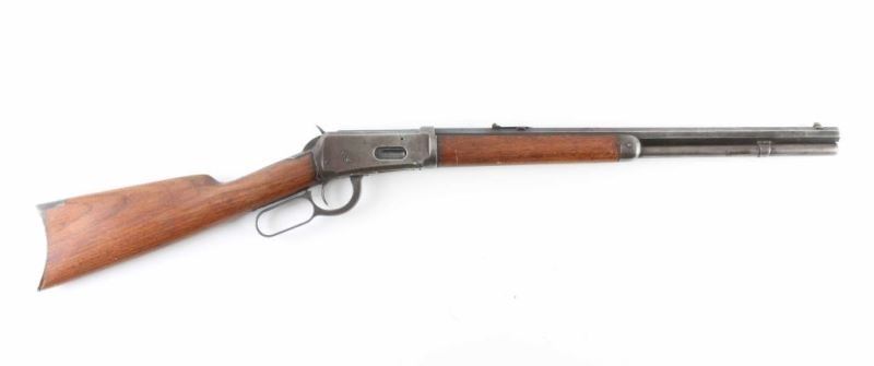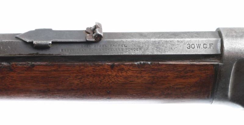 Rifle. Lever Action. Manufactured 1900. Octagonal barrel has been shortened to 19 3/4" Full magazine. Rear v-notch sight has been welded. Bolt is a newer replacement. Winchester/Patent markings present. There is a rub on the tang witch obscures some of the markings. Walnut stock, and forearm are very good with minor chips/scratches. Steel fore cap, and crescent steel butt plate, Wood was probably re-finished at some point. Action is crisp/tight. Bore is ok, with rifling present, but somewhat pitted. Blued metal finish has turned a gray patina, except for the replaced bolt. NRA Condition-Good. Modern Firearm.