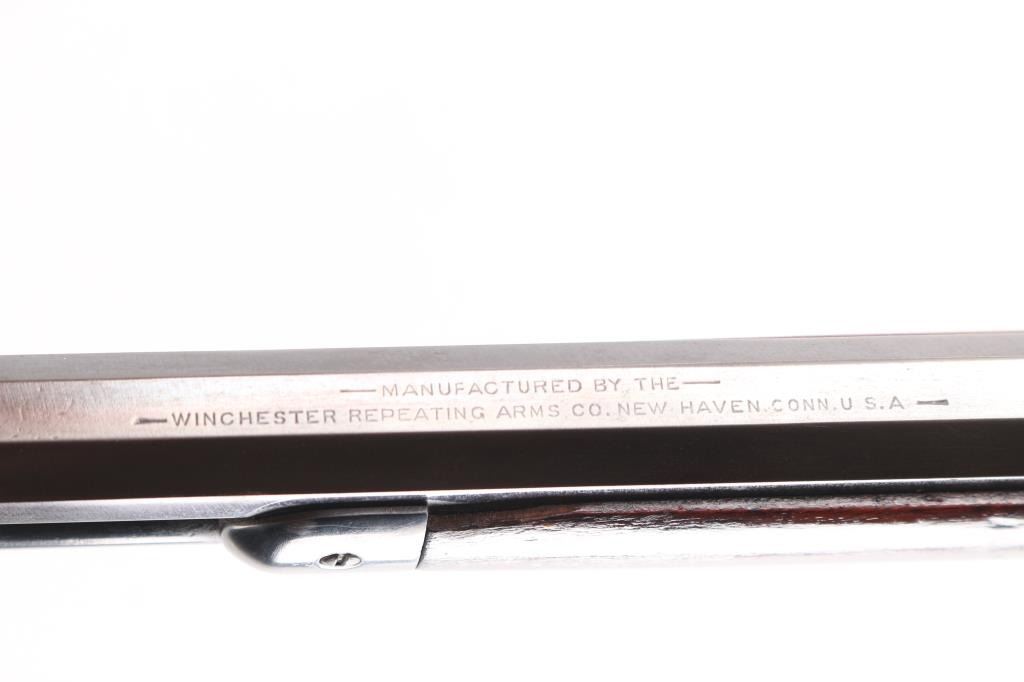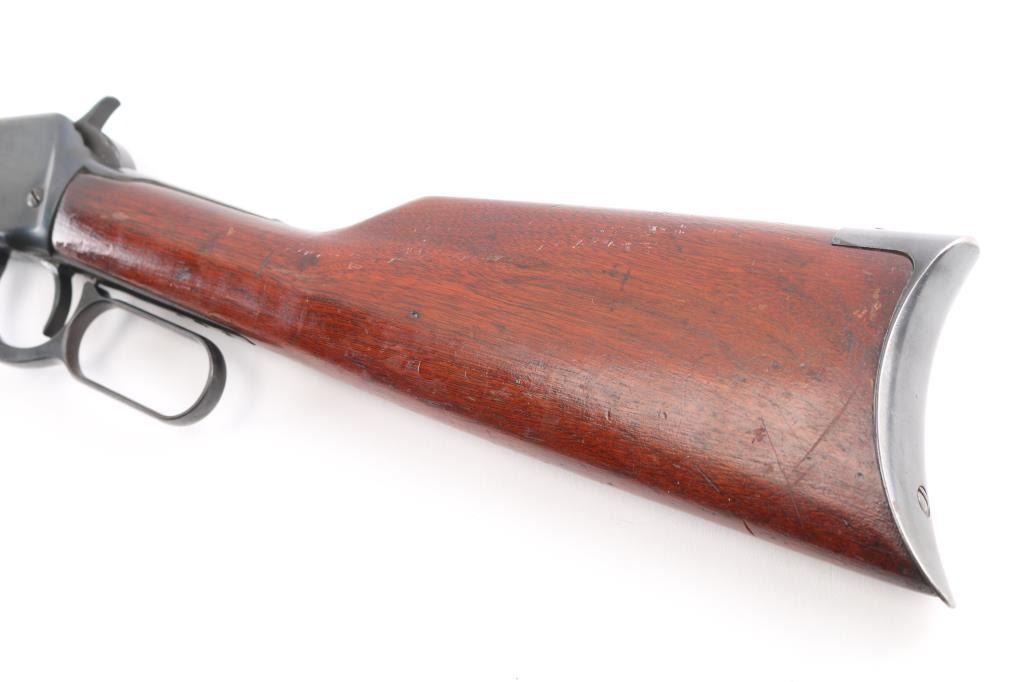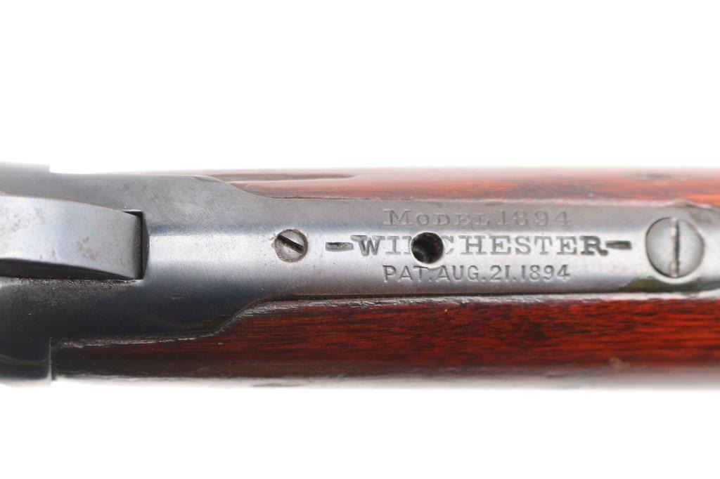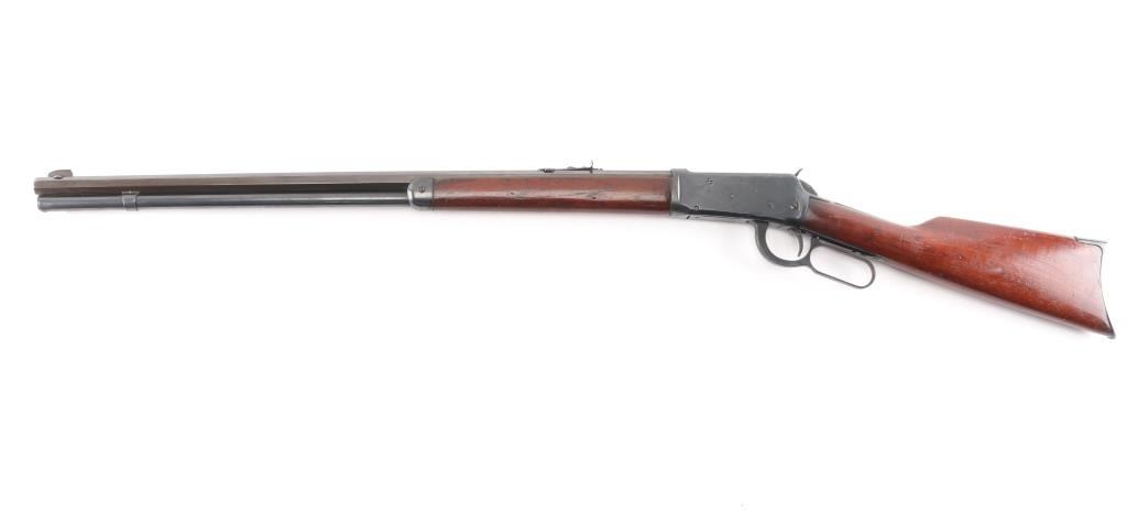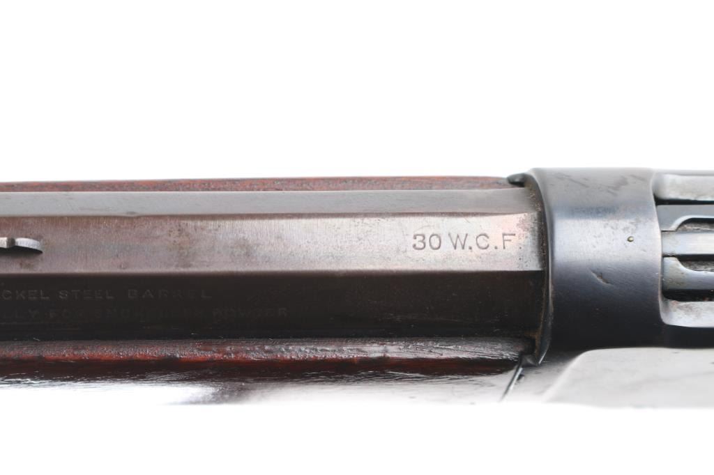 Antique lever action repeating rifle chambered in .30-30 Winchester manufactured in New Haven, CT circa 1895, second year of production. Features a re-blued finish, 26" octagonal barrel, full-length tube magazine, dovetailed Marble blade front sight , elevation adjustable semi buckhorn rear sporting sight, smooth trigger, knurled hammer spur, smooth walnut forend with metal cap, and straight grip shoulder stock with crescent metal buttplate. Standard Winchester markings are clear. Rifle retains most of the old re-blued finish with some rubs/scratches, mostly on the left receiver, there is some scattered light pitting showing under the re-blued finish. Action is sound, the bore is fair, rifling with scattered pitting throughout, and the walnut stocks are good, have been refinished. There is a hole drilled about midway in the upper tang for a peep sight.
