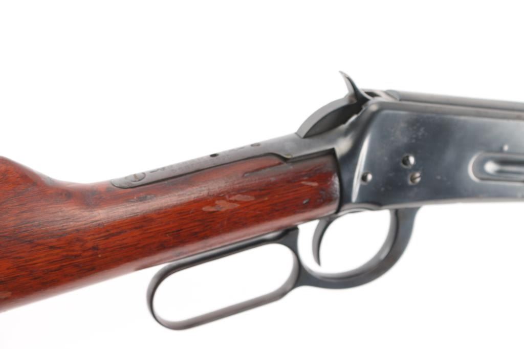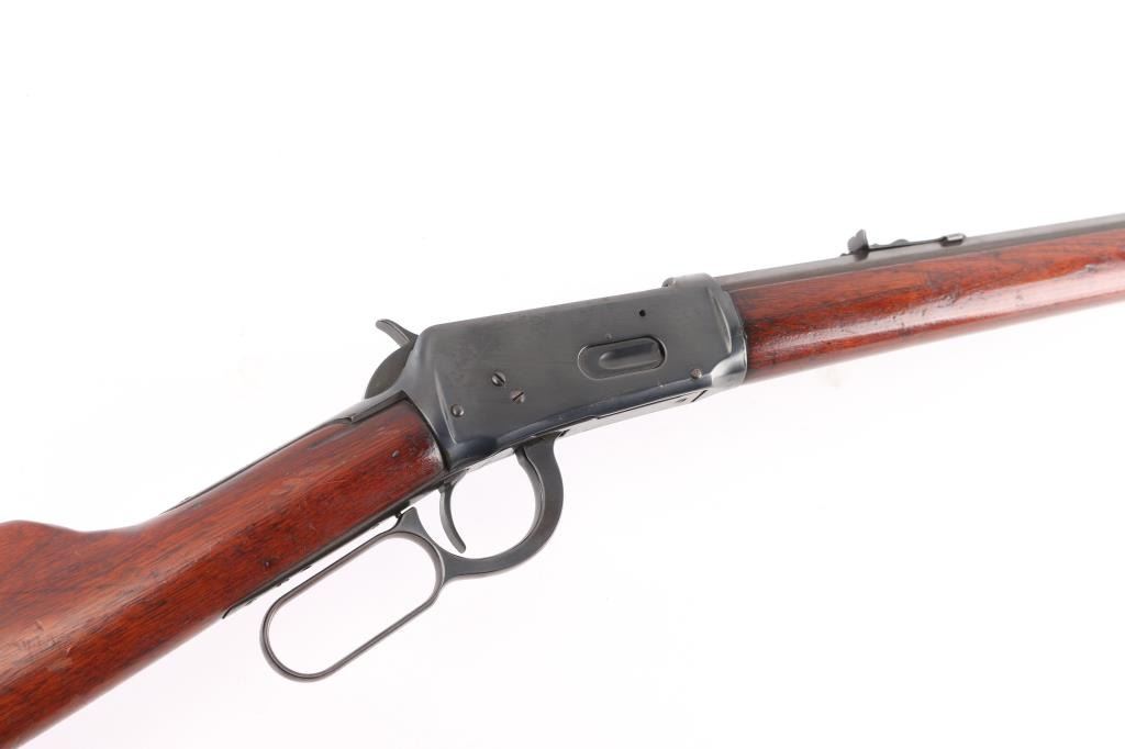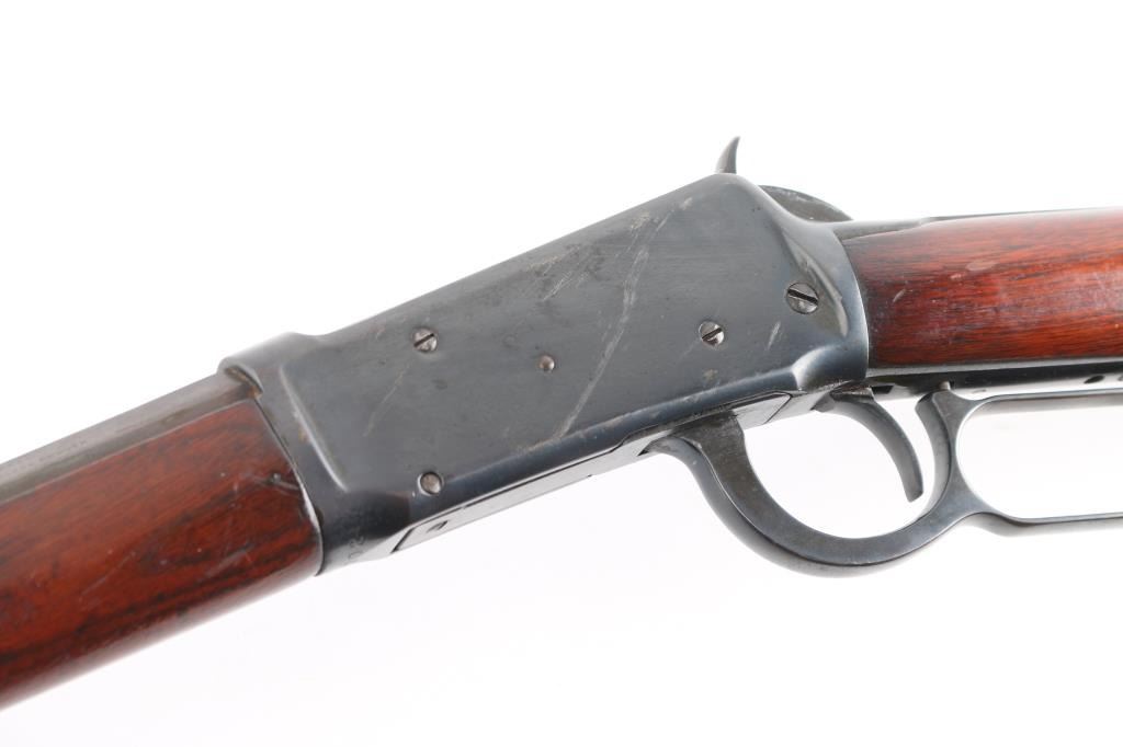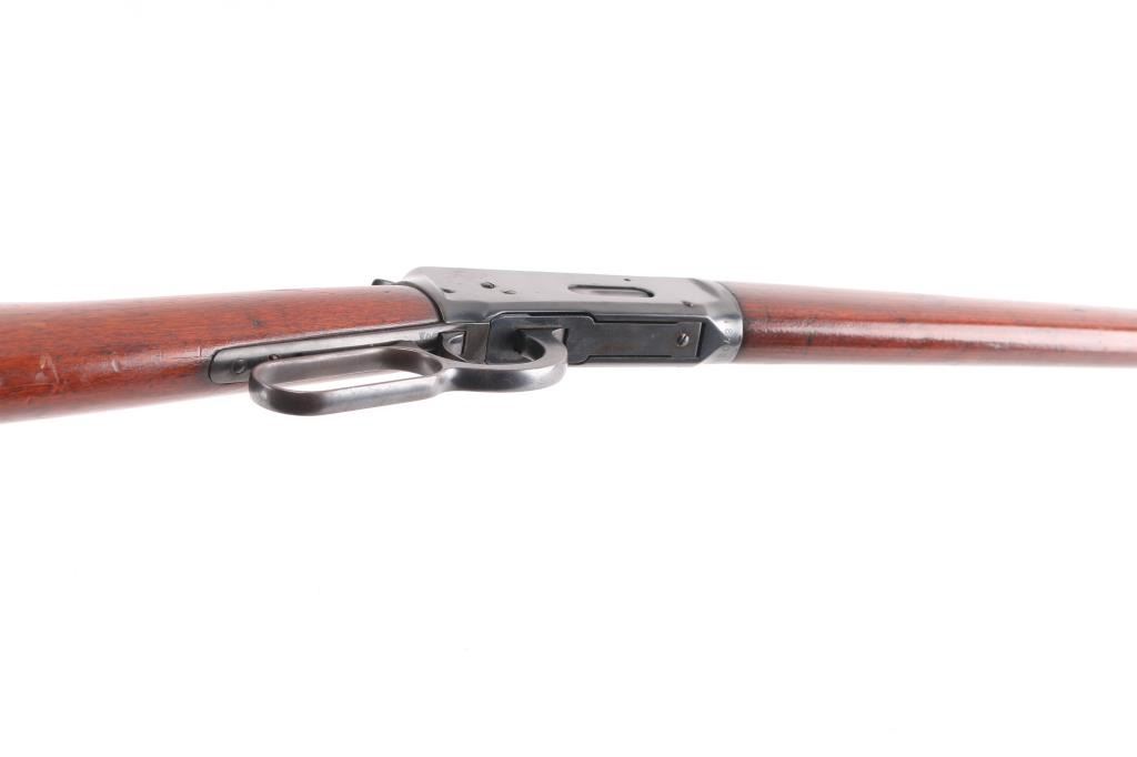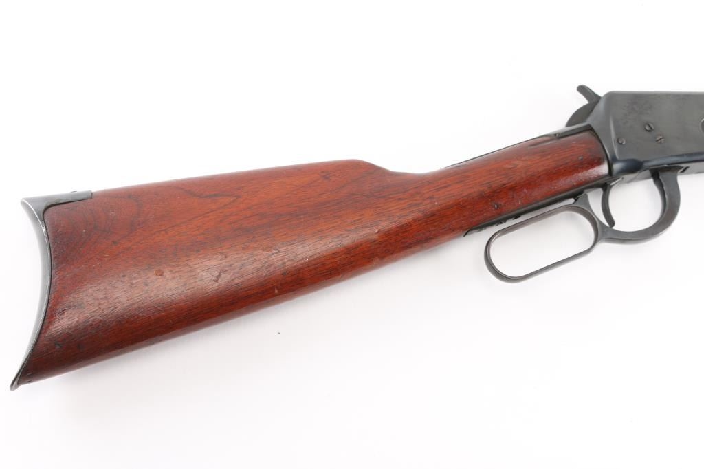 Antique lever action repeating rifle chambered in .30-30 Winchester manufactured in New Haven, CT circa 1895, second year of production. Features a re-blued finish, 26" octagonal barrel, full-length tube magazine, dovetailed Marble blade front sight , elevation adjustable semi buckhorn rear sporting sight, smooth trigger, knurled hammer spur, smooth walnut forend with metal cap, and straight grip shoulder stock with crescent metal buttplate. Standard Winchester markings are clear. Rifle retains most of the old re-blued finish with some rubs/scratches, mostly on the left receiver, there is some scattered light pitting showing under the re-blued finish. Action is sound, the bore is fair, rifling with scattered pitting throughout, and the walnut stocks are good, have been refinished. There is a hole drilled about midway in the upper tang for a peep sight.