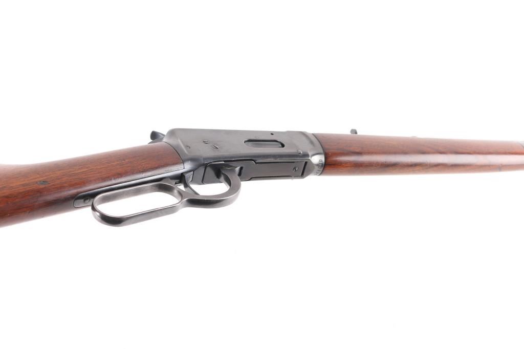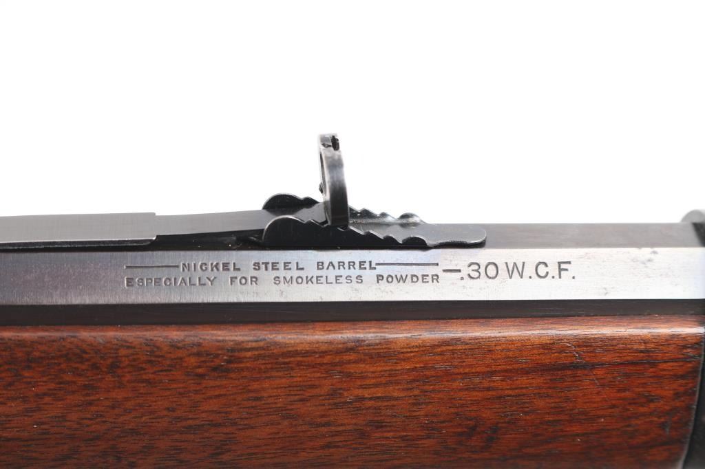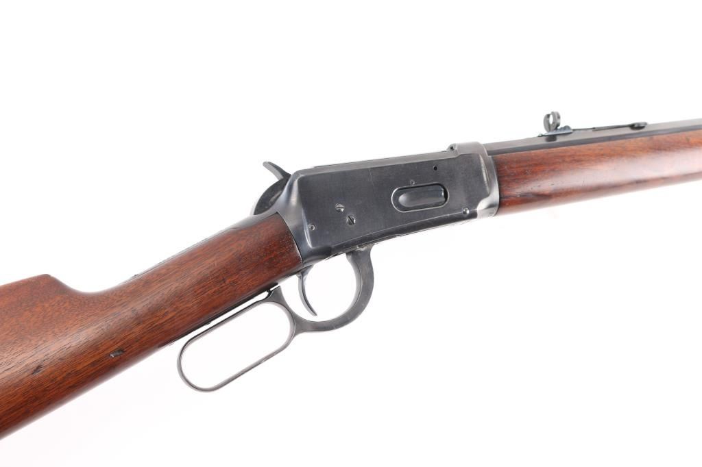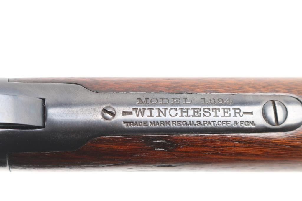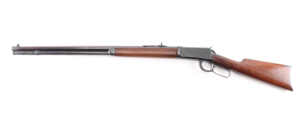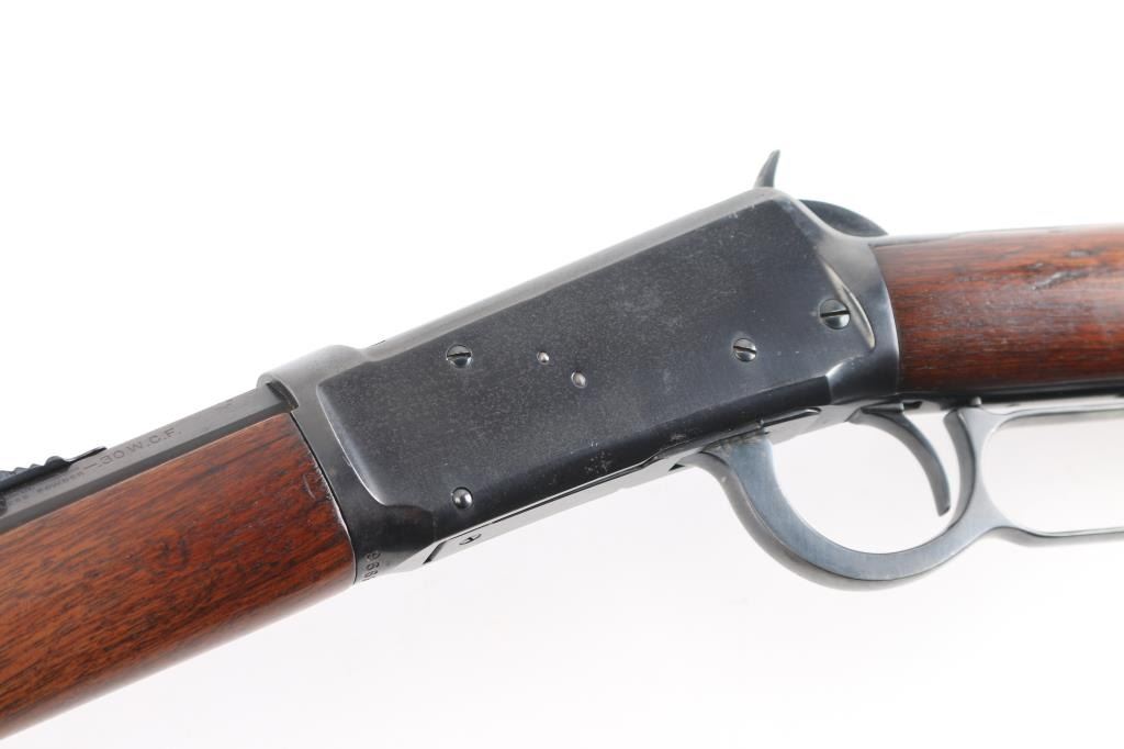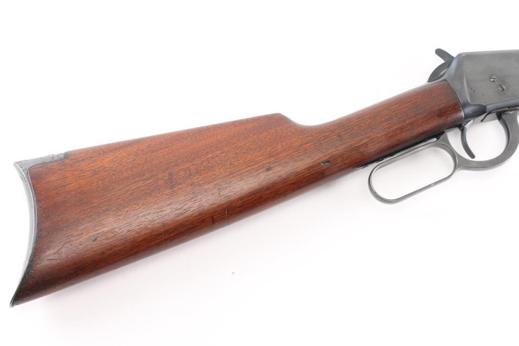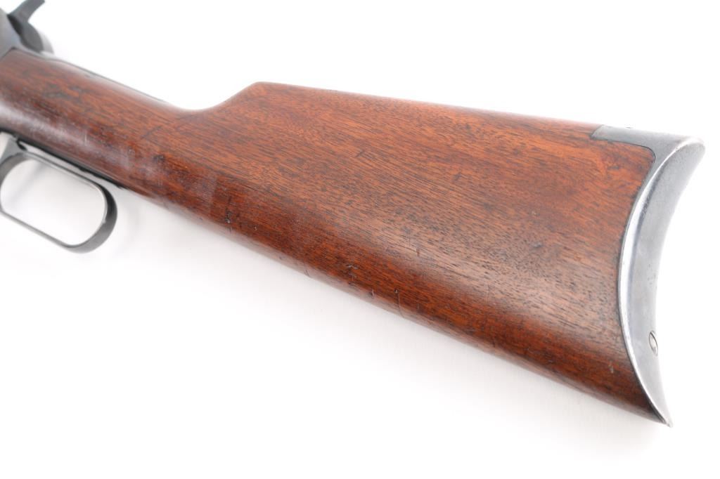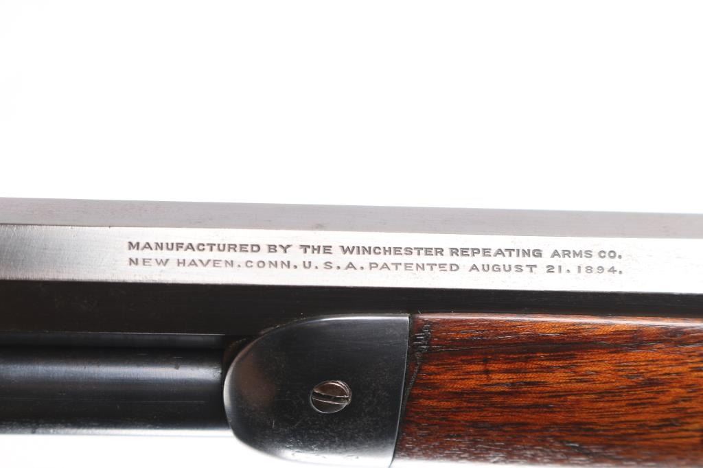 Antique lever action repeating rifle chambered in .30-30 Winchester manufactured in New Haven, CT circa 1917. Features a re-blued finish, 26" octagonal barrel, full-length tube magazine, dovetailed bead/blade front sight , elevation adjustable buckhorn rear sporting sight, smooth trigger, knurled hammer spur, smooth walnut forend with metal cap, and straight grip shoulder stock with crescent metal buttplate. Standard Winchester markings are clear. Rifle retains most of the old re-blued finish with some rubs/scratches, pitting on the buttplate, there is some scattered light pitting showing under the re-blued finish. Action is sound, the bore is fair, rifling with scattered pitting throughout, and the walnut stocks are good, have been refinished.