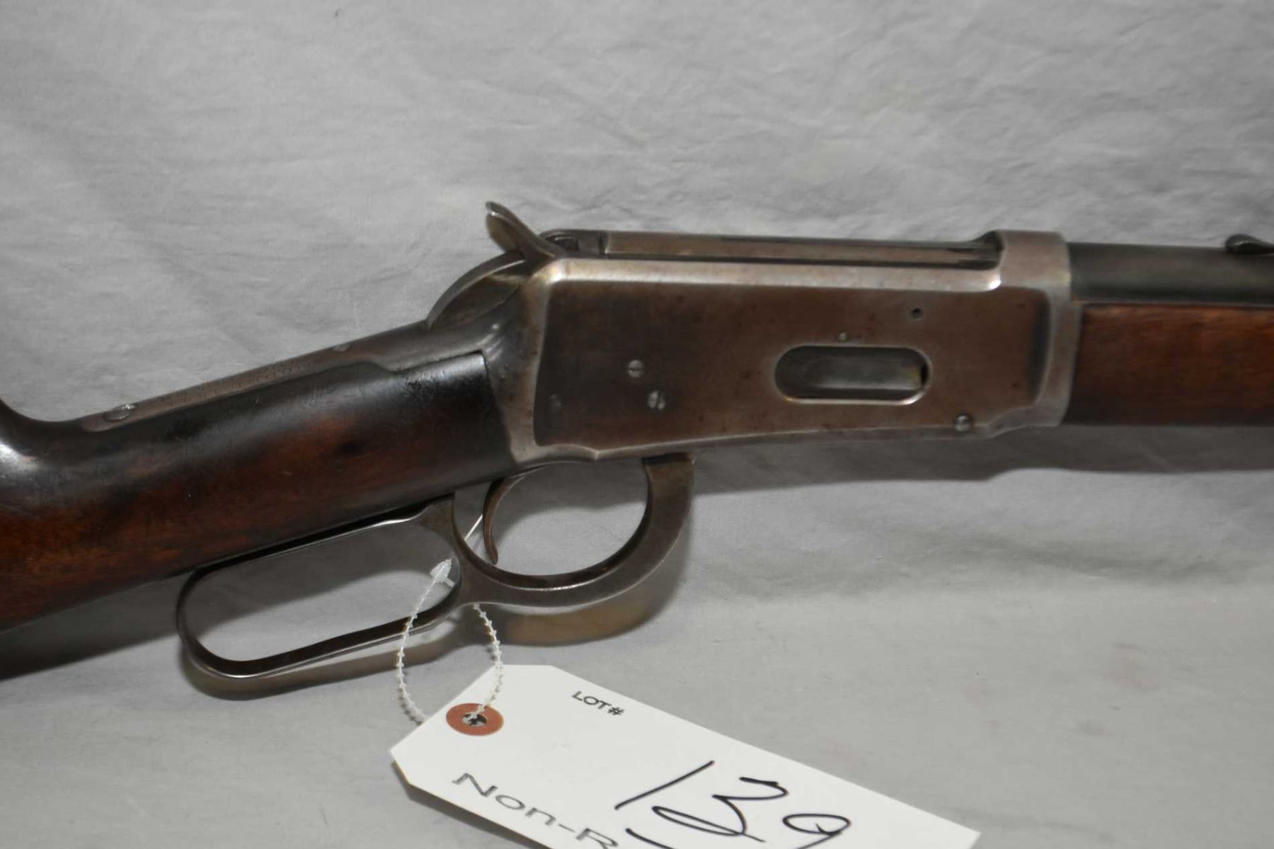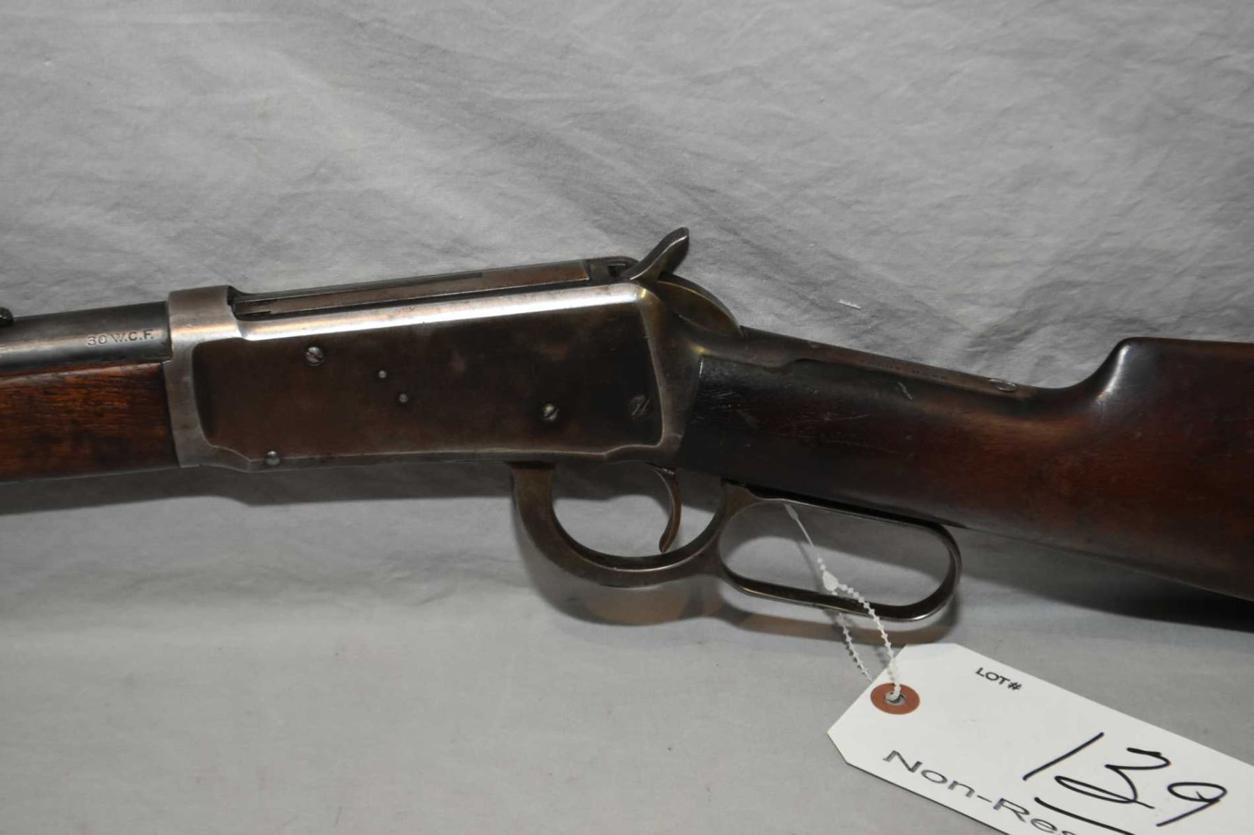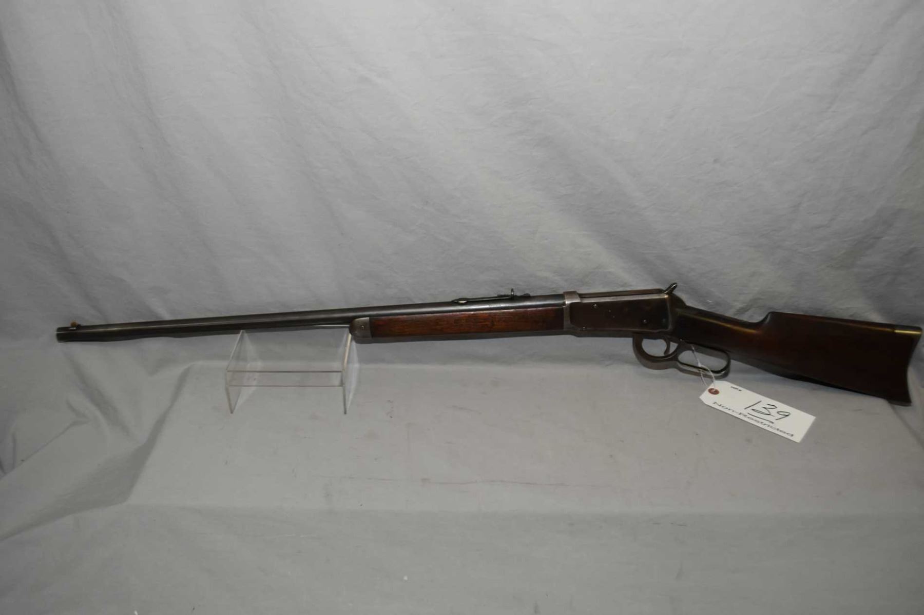 Winchester Model 1894 .30 WCF Cal Lever Action Rifle w/ 26" round barrel [ fading blue finish, turning brown in some areas, barrel sights, button mag, good wood, with some marks, with metal crescent butt plate with trap, Circa 1907 ] Ser # 407857