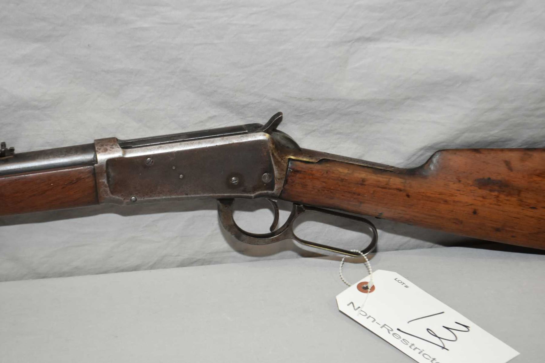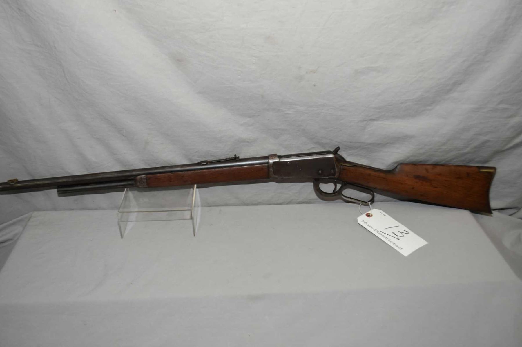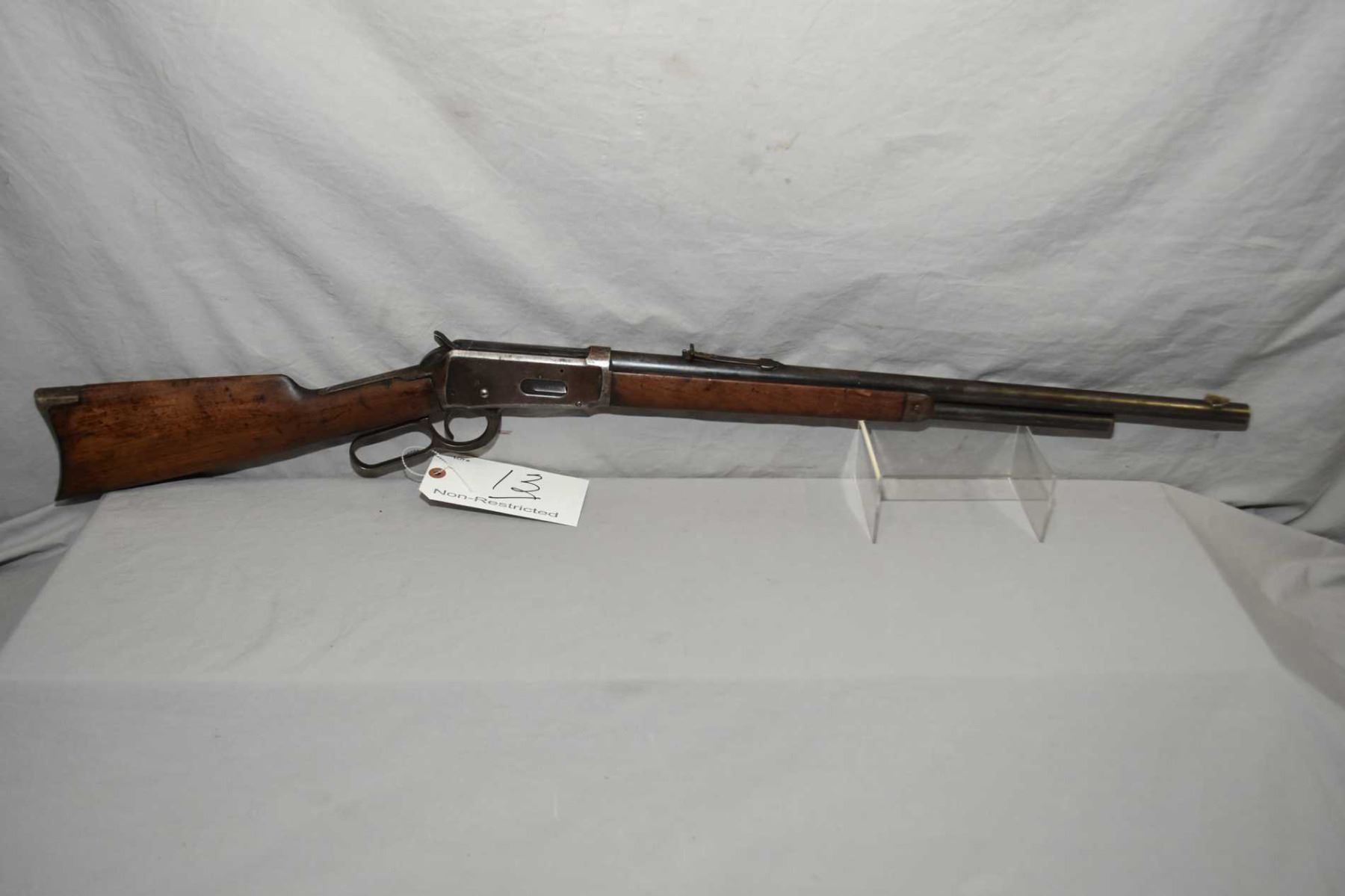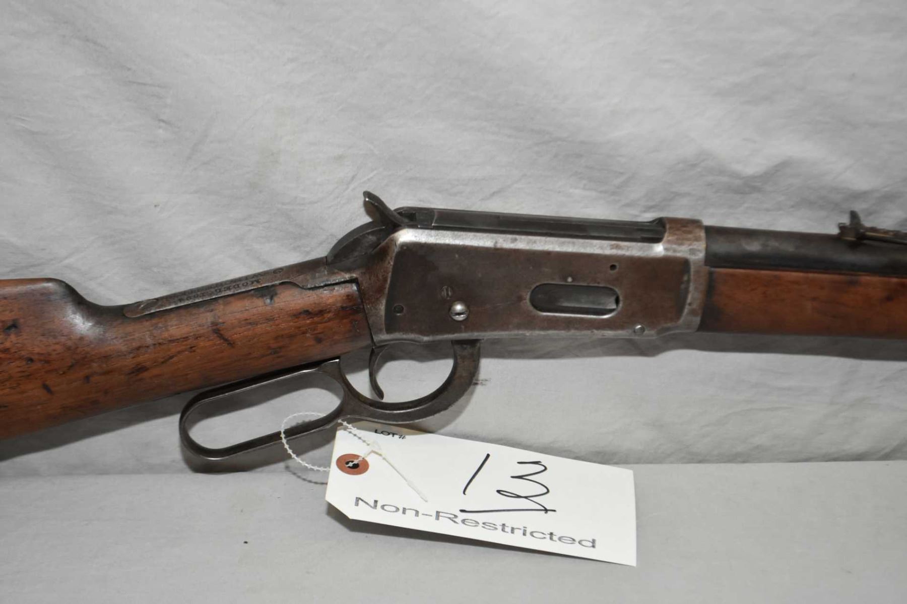 Winchester Model 1894 .30 WCF Cal Lever Action Rifle w/ barrel cut down to 21 3/4" approx. 3/4 mag [ fading blue finish turning brown with marks, forewood has some marks and two slight chips, butt stock is dry with slight age cracks behind receiver, three nails by toe, metal crescent butt plate, Circa 1905 ] Ser # 322093