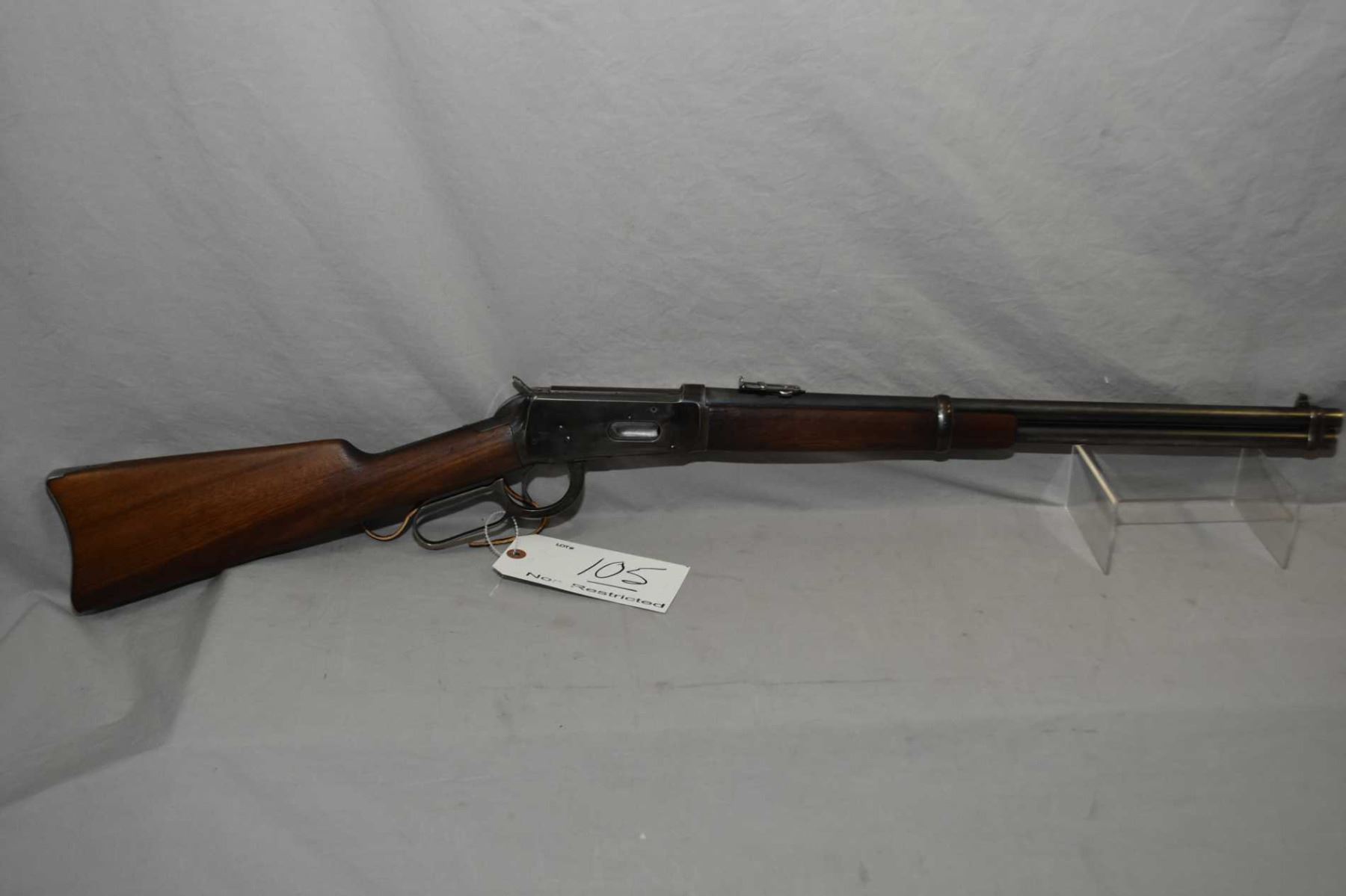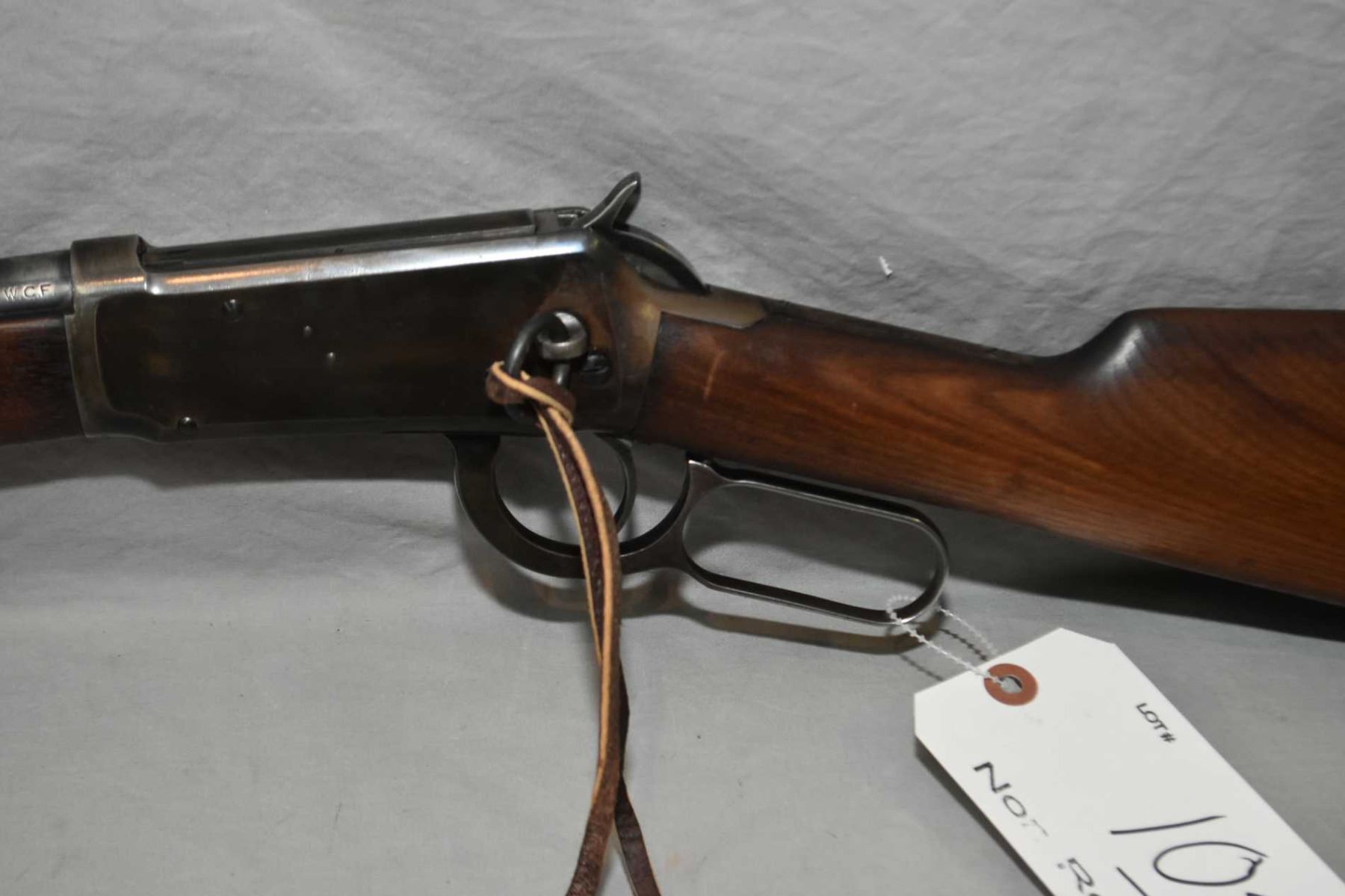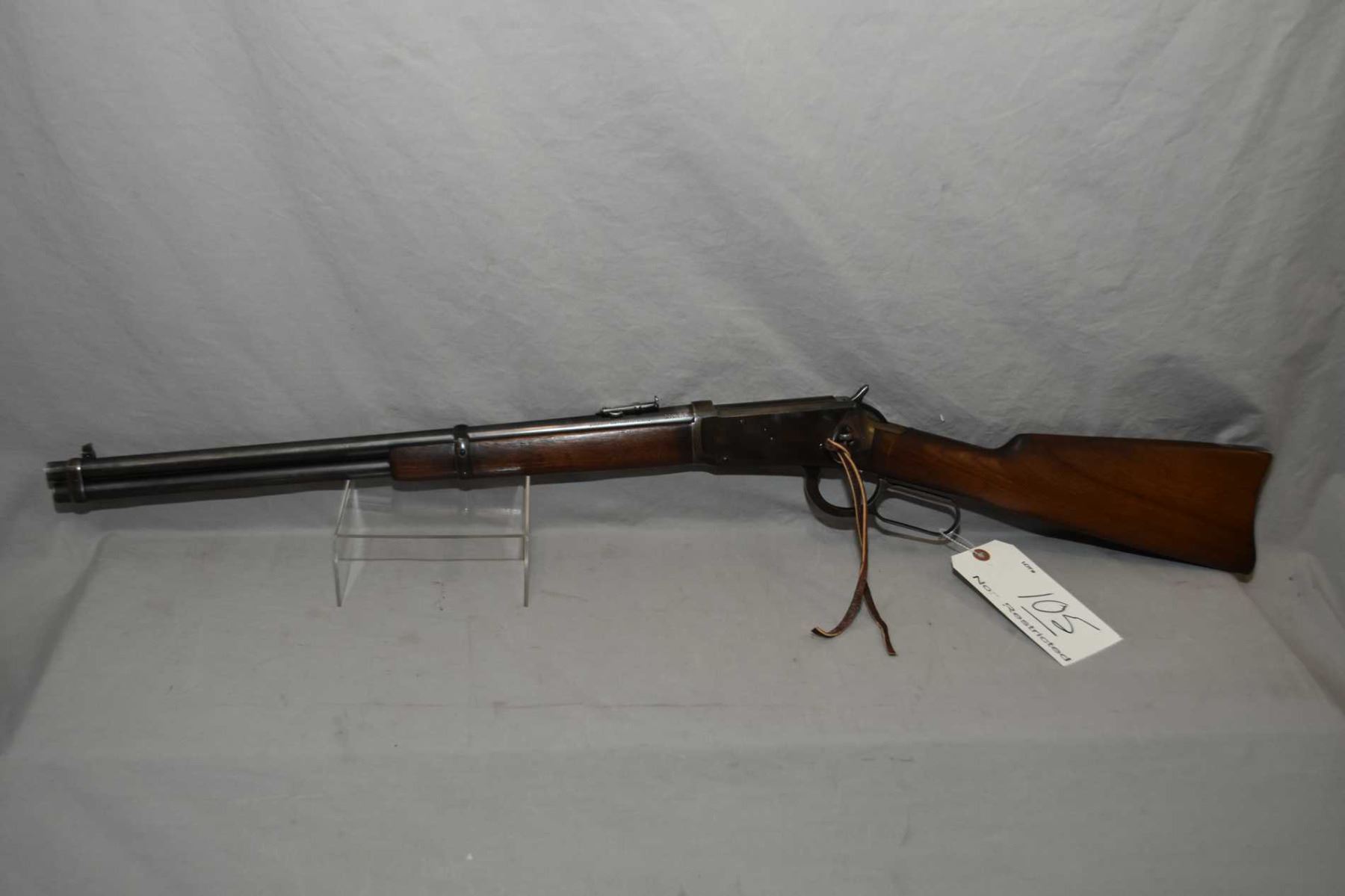 Winchester Model 1894 .30 WCF Cal Lever Action Saddle Ring Carbine w/ 20" bbl [ blued finish starting to fade, carbine sights, good wood, with metal carbine butt plate, British Proof Marks DOC on top of barrel, Purported to has saw service as British WWI Rifle, Circa 1914 ] Ser # 735555