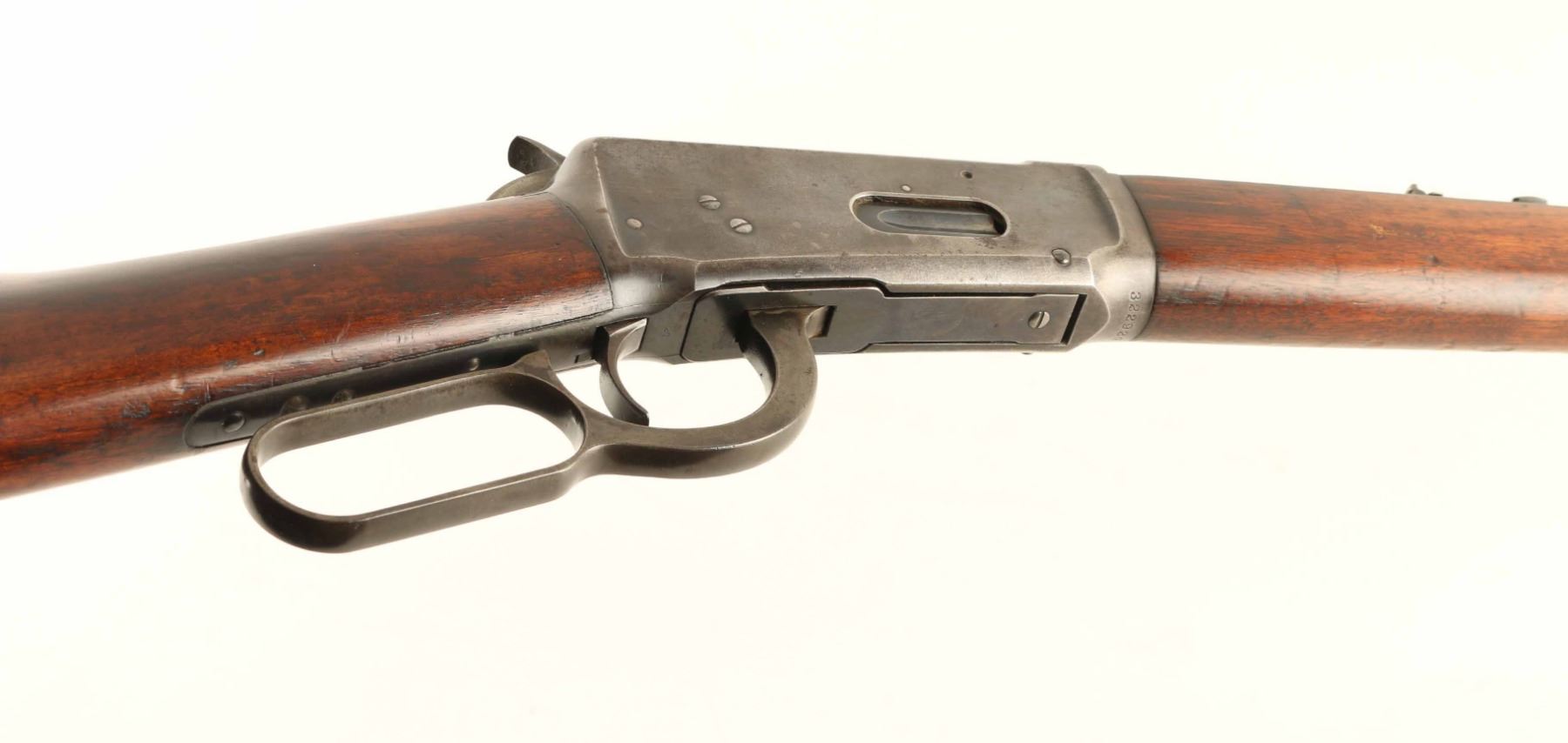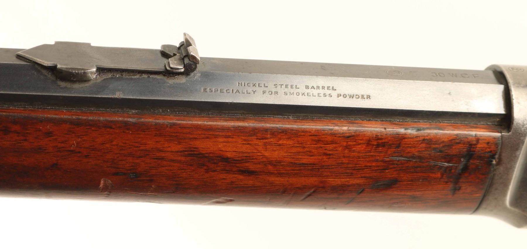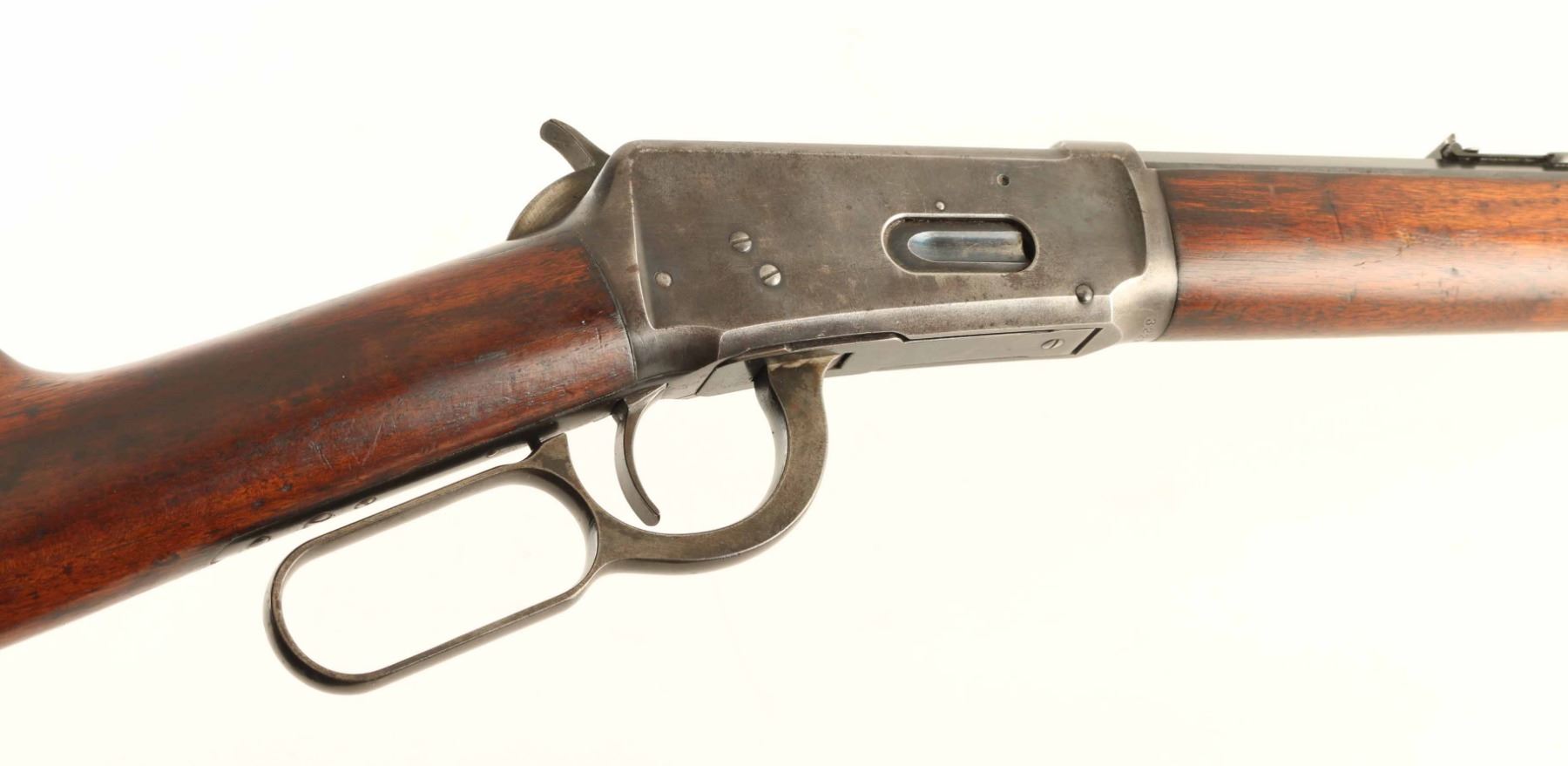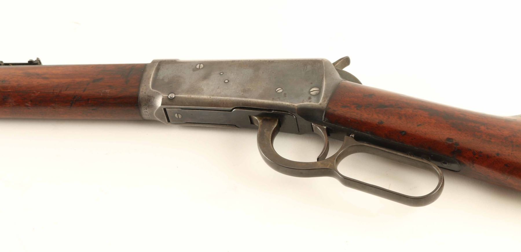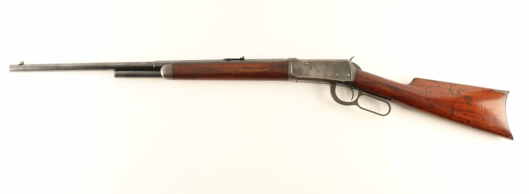 Lever action rifle manufactured circa 1905. Features blued finish, plain wood forend & stock, crescent butt plate, 24" half round - half octagon barrel, half length magazine tube, blade front sight, notch rear sight with folding leaves (hard to fold, part of one leaf broken off). Bore is fair condition with strong rifling, frosted & lightly pitted throughout. Retains 50% blued finish with scattered losses showing thinning finish or bare metal, mostly on edges and on forward part of barrel. Sides of receiver show some light patina and a few small areas of pitting. Edges of barrel flats are sharp, and markings are crisp. Wood is good condition, dented with varnish added (appears older), sharp corners retained and tight fit to metal.