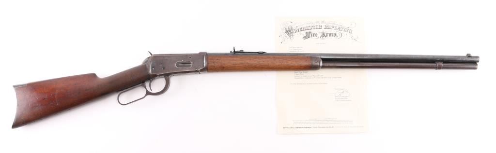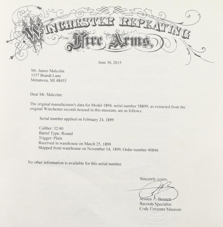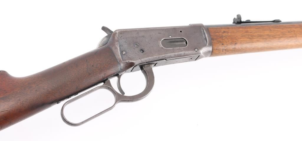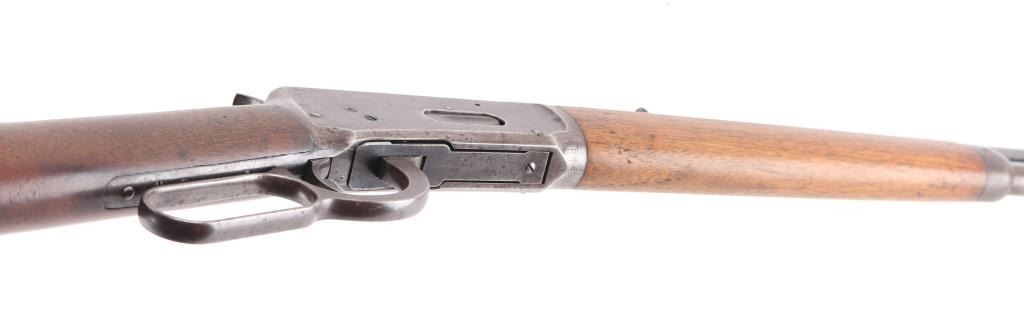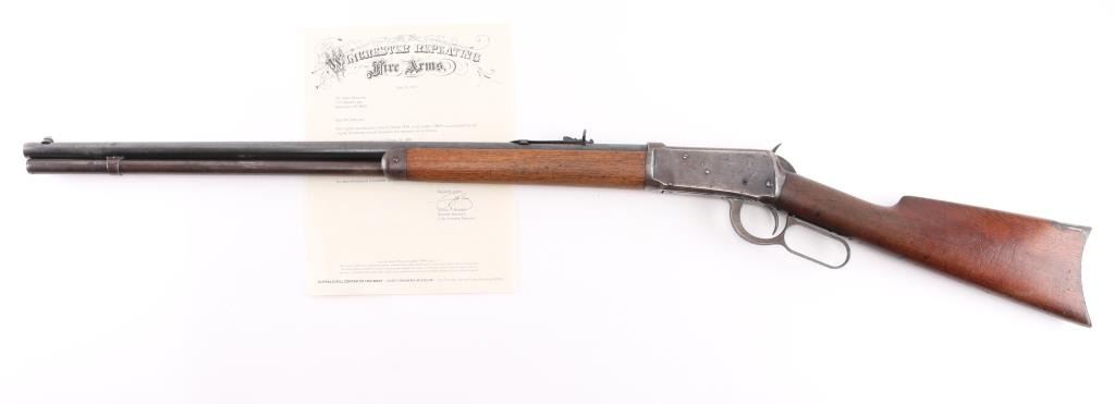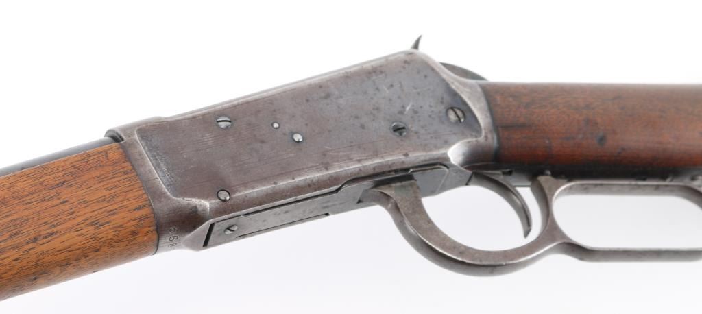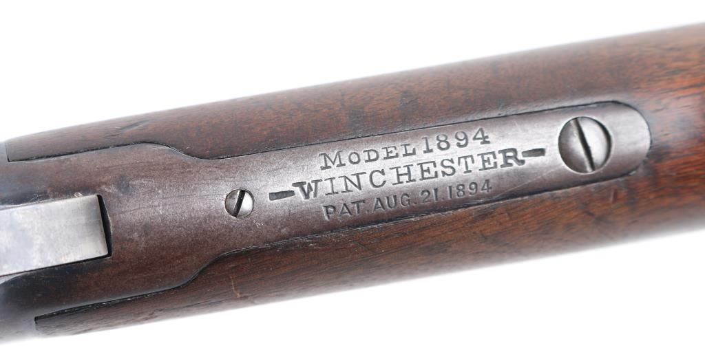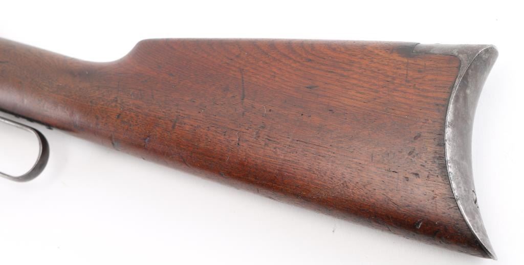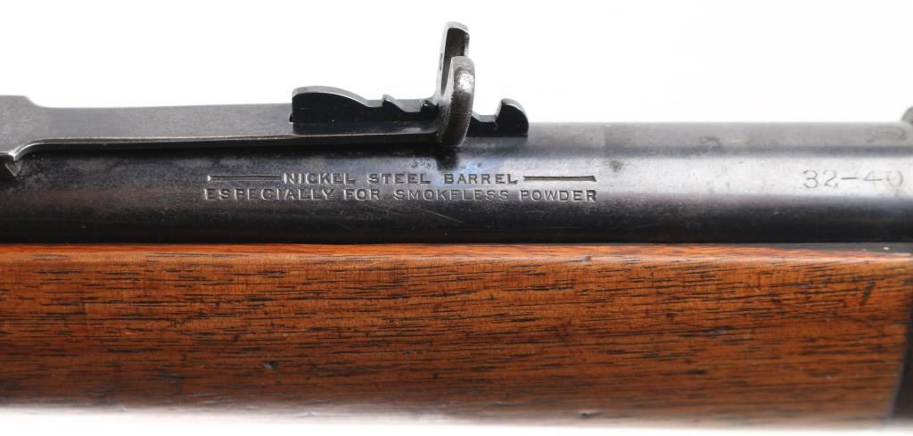 Early lever action repeating rifle chambered in .32-40 Winchester Center Fire, circa 1895. Features a blued 26" round barrel, full tube magazine,German silver blade front sight, adjustable semi-buckhorn rear sight, smooth trigger, checkered hammer spur, metal forend cap, plain walnut forend and straight grip shoulder stock with crescent buttplate. Finish retains 80% thin original bluing on barrel. The receiver, tube, lever, forearm cap, and buttplate have turned a brown patina . Stocks are good/sound with some scratches/dings. Forearm is a lighter color than the buttstock from handling. Markings are crisp. Action is smooth and bore is fair, strong rifling, scattered very light pitting. Comes with Winchester factory letter stating this rifle was shipped from the factory on November 14, 1899 NRA Condition-Very Good. Antique Firearm.