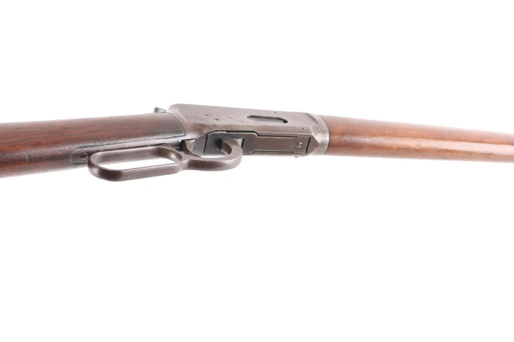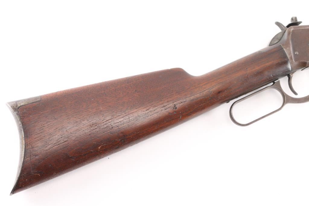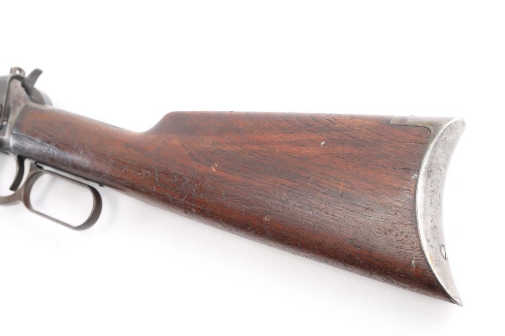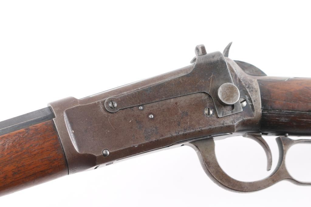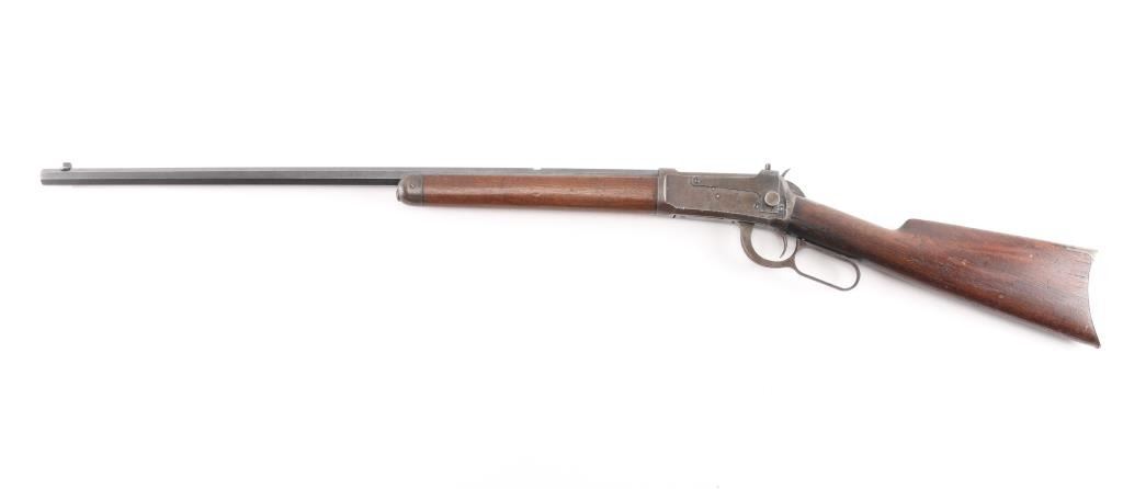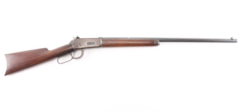 Vintage lever action rifle manufactured circa 1903. Features 26' octagon barrel, blade/bead front sight, rear sight removed, empty dovetail, elevation adjustable peep sight installed on the left receiver, unmarked, adjusts by loosening a screw, half length "button" magazine, plain trigger, crescent butt with smooth steel buttplate. Bore is good condition, lightly frosted with dark grooves, strong rifling. Barrel retains good coverage of bluing, thinning to bare metal on edges of flats & muzzle. Action shows less finish remaining, with a brown/gray appearance and some darker color in protected areas. Several small areas of thin patina. Wood is good/sound condition, lightly varnished, with small scratches & dents throughout. Markings are generally sharp and even depth.