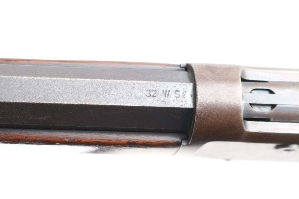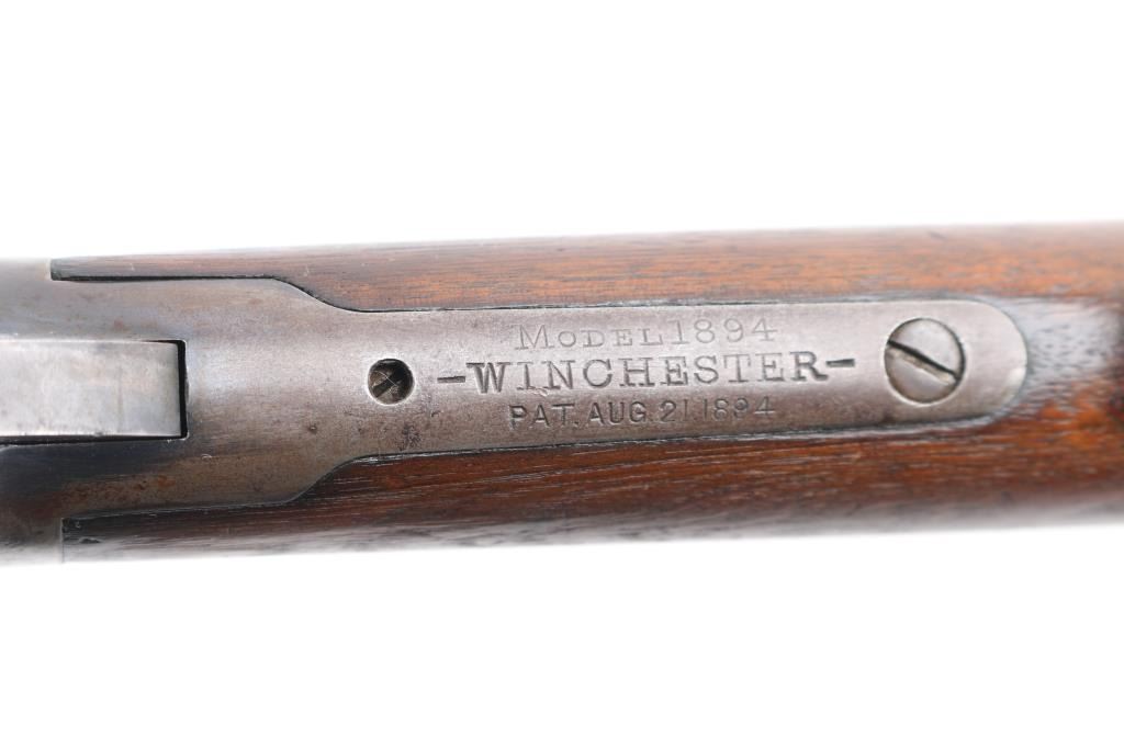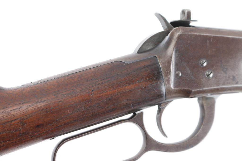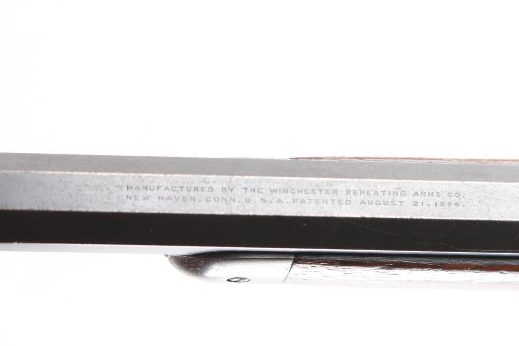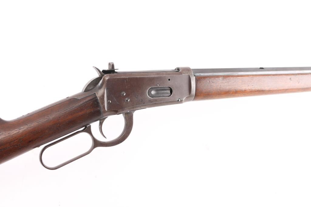 Vintage lever action rifle manufactured circa 1903. Features 26' octagon barrel, blade/bead front sight, rear sight removed, empty dovetail, elevation adjustable peep sight installed on the left receiver, unmarked, adjusts by loosening a screw, half length "button" magazine, plain trigger, crescent butt with smooth steel buttplate. Bore is good condition, lightly frosted with dark grooves, strong rifling. Barrel retains good coverage of bluing, thinning to bare metal on edges of flats & muzzle. Action shows less finish remaining, with a brown/gray appearance and some darker color in protected areas. Several small areas of thin patina. Wood is good/sound condition, lightly varnished, with small scratches & dents throughout. Markings are generally sharp and even depth.
