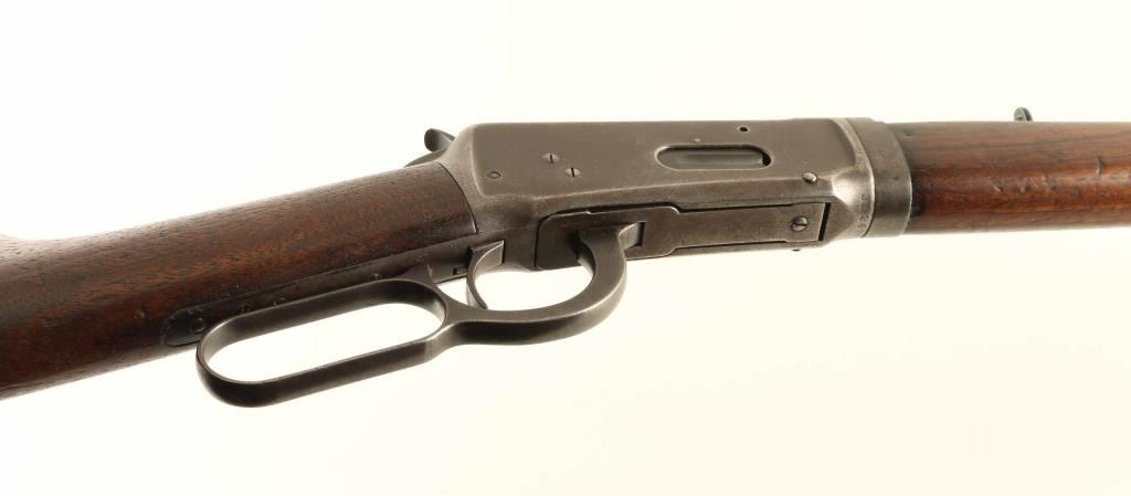 Takedown 'Sporting Rifle' manufactured 1907. Features 26" octagon barrel, full length magazine tube, takedown lever at magazine cap, buckhorn sights, straight grip, steel crescent buttplate. Bore is fair to good condition, frosted with strong rifling. Metal surfaces retain 50% finish overall. Barrel retains strong blue on flats, thinning to bare metal at edges. Mag tube is mostly patina brown color, with bare metal where tube rubs when moved for take down. Receiver is patina brown with bare metal at edges, pitting at top edges, scratches to sides and next to screw heads. Buttplate is mostly smooth bare metal, with light pitting at top cap. Screw slots typically fair condition with some marring. Forend is fair to good condition, some dents & scratches, good fit to metal. Butt is good condition with creases and dents, mostly good fit to metal, very little shrinkage noted, some erosion or loss at toe. Wood appears to have varnish applied over previous wear. Markings are mostly deep and clear, with even depth. Action operates smoothly. Includes letter from Cody Firearms Museum / Buffalo Bill Historical Center listing manufacturer's data for this rifle as shipped from the factory. Condition is NRA Good *** C&R Firearm ***