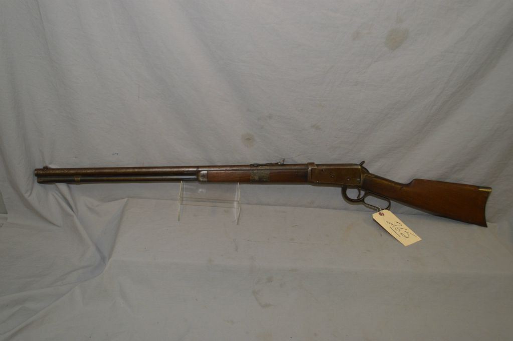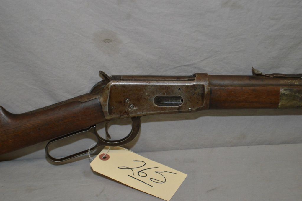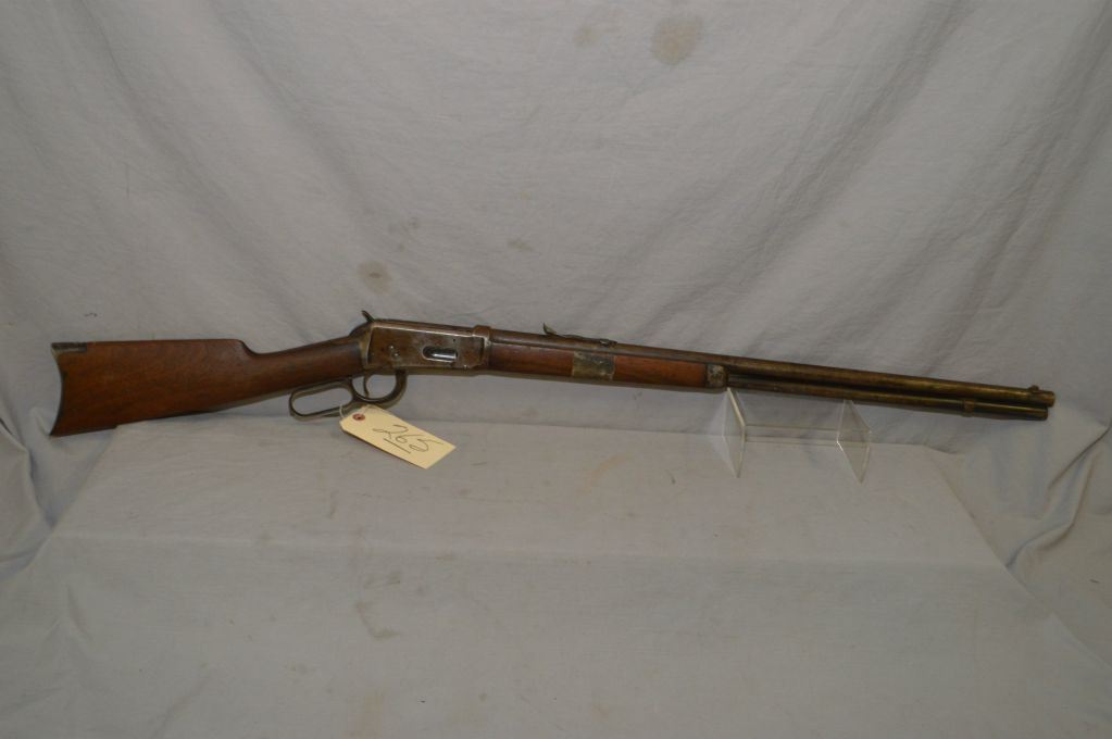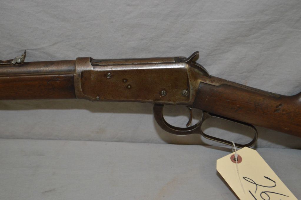 Winchester Model 1894 .38 - 55 Cal Lever Action Rifle w/ 26" rnd bbl full mag [ fading patchy blue finish turning brown, broken & welded back barrel sight, good wood with crescent metal butt plate, tape around forewood appears to have been used to hold the sight on, Circa 1906 ] Ser #376246