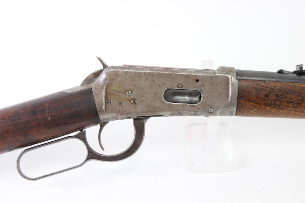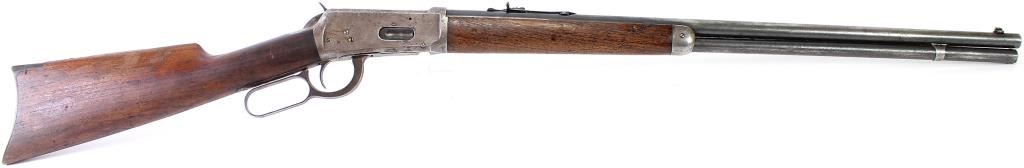 Winchester Model 1894 38-55 cal. SN 567672 gun in overall good condition, 26" barrel, original rear sight, front sight changed to white bead, metal overall gray patina showing blue on mag tube, wood solid with NO cracks, chips or repairs only usual handgun in overall good condition, 26" barrel, original rear sight, front sight changed to white bead, metal overall gray patina showing blue on mag tube, wood solid with NO cracks, chips or repairs only usual handling marks,