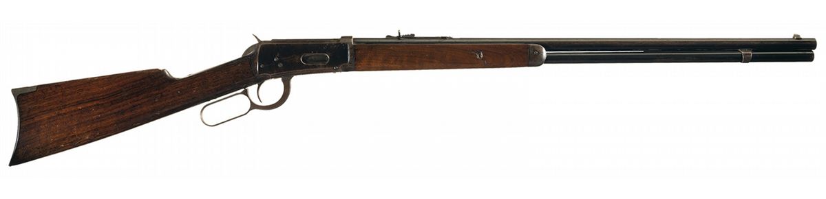 Manufactured in 1900. Full length magazine tube, brass blade front sight and elevation adjustable buckhorn rear sight. The top of the barrel has the two line address ahead of the rear sight and "38-55" at the breech. The upper tang is marked with the three line model/marker 1894 patent date and the serial number is marked on the underside of the receiver. Blue finish with casehardened hammer, lever, forend cap and buttplate. Mounted with a smooth walnut forearm and straight grip stock with a crescent buttplate.