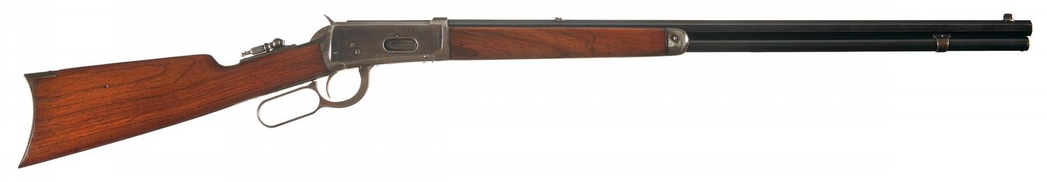 Manufactured in 1902. The top barrel flat is marked with the two line address/ 1894 patent date ahead of the rear sight and "38-55" at the breech end and the serial number is marked on the bottom of the frame. Dovetailed blade front sight, single folding leaf rear sight, and a short range tang mounted peep sight. All blue finish with casehardened hammer and lever, and mounted with a smooth walnut forearm and straight grip stock with a steel crescent buttplate.