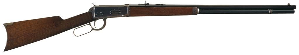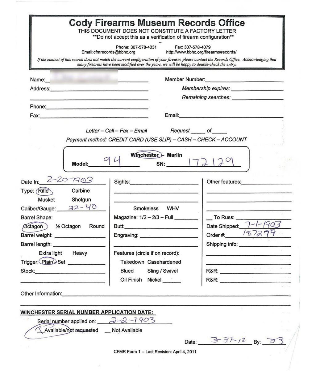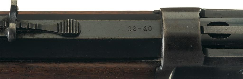 The top barrel flat ahead of the rear sight is marked with the two line address/1894 patent date and "32-40" at the breech. The upper tang is marked "MODEL 1894/WINCHESTER/PAT. AUG. 21, 1894" and the serial number is on the front underside of the receiver. Dovetailed blade front and adjustable buck horn rear sights. Full length magazine tube, blue finish with casehardened hammer, lever, forend cap and buttplate. Mounted with a smooth walnut forearm and straight grip stock with a crescent buttplate. The accompanying Cody Firearms Museum Records Office sheet verifies the rifle configuration, caliber, octagon barrel, plain trigger, the serial number was applied on 2-2-1903 and the rifle was shipped to order number 187279 on July 1, 1903.