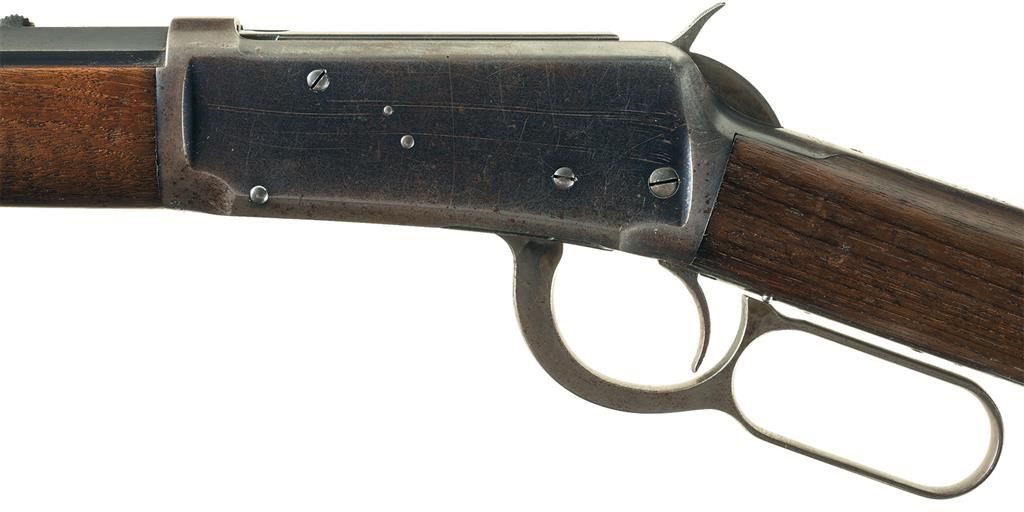 Fine. The rifle retains 60% thin original blue finish with edge wear and some areas of smooth gray patina. The hammer retains most of the original faded case colors, and the lever, forend cap and buttplate have a mottled gray patina with some minor spotting on the buttplate and flashes of original case colors in protected areas. The wood is good with a hole on the belly of the stock where a sling swivel has been removed, and overall scattered minor dents, dings and scratches. The markings are clear. The action is fine.