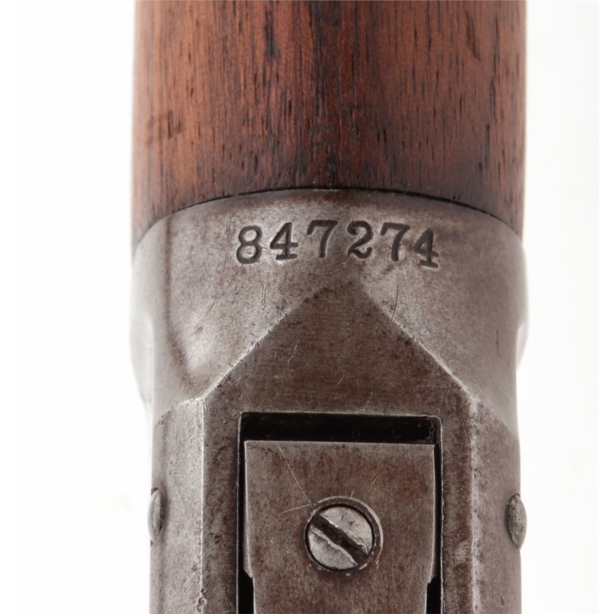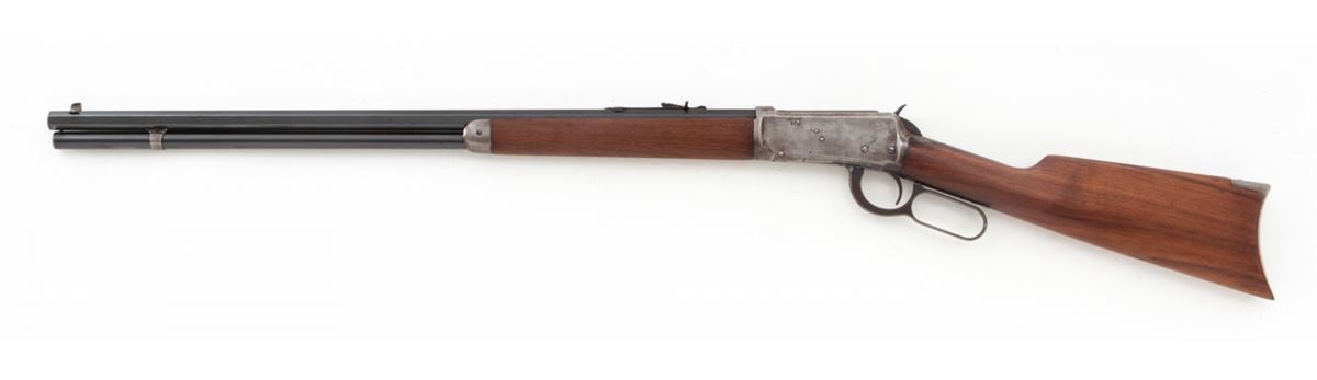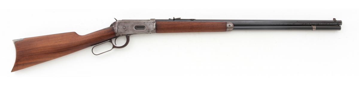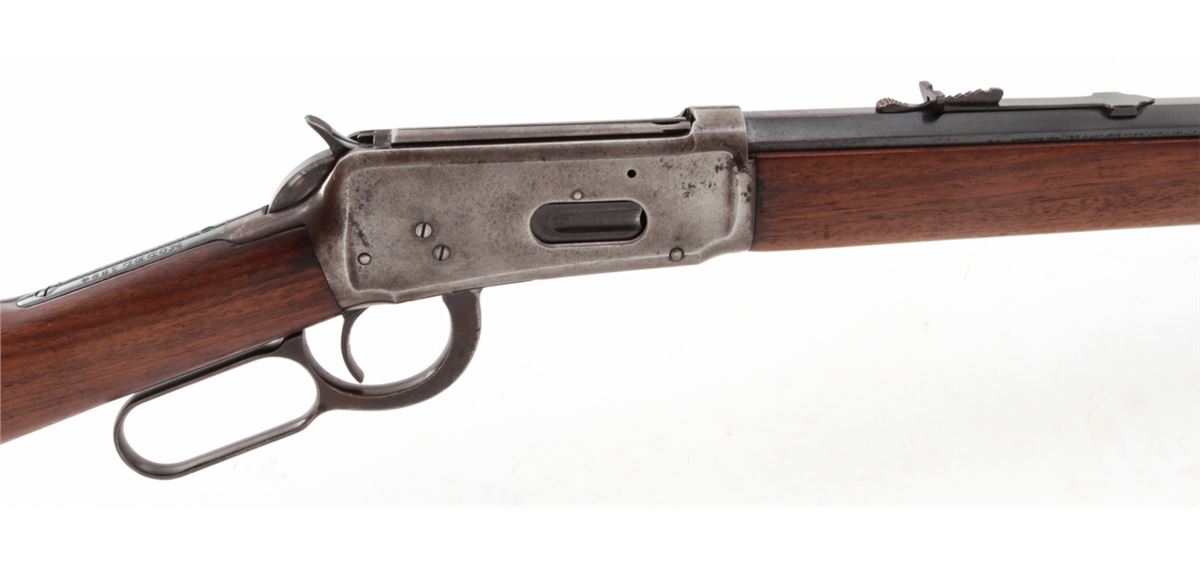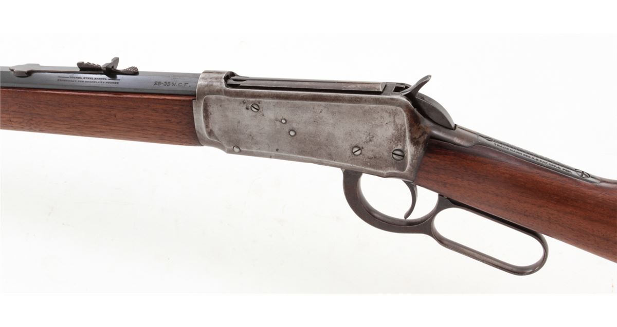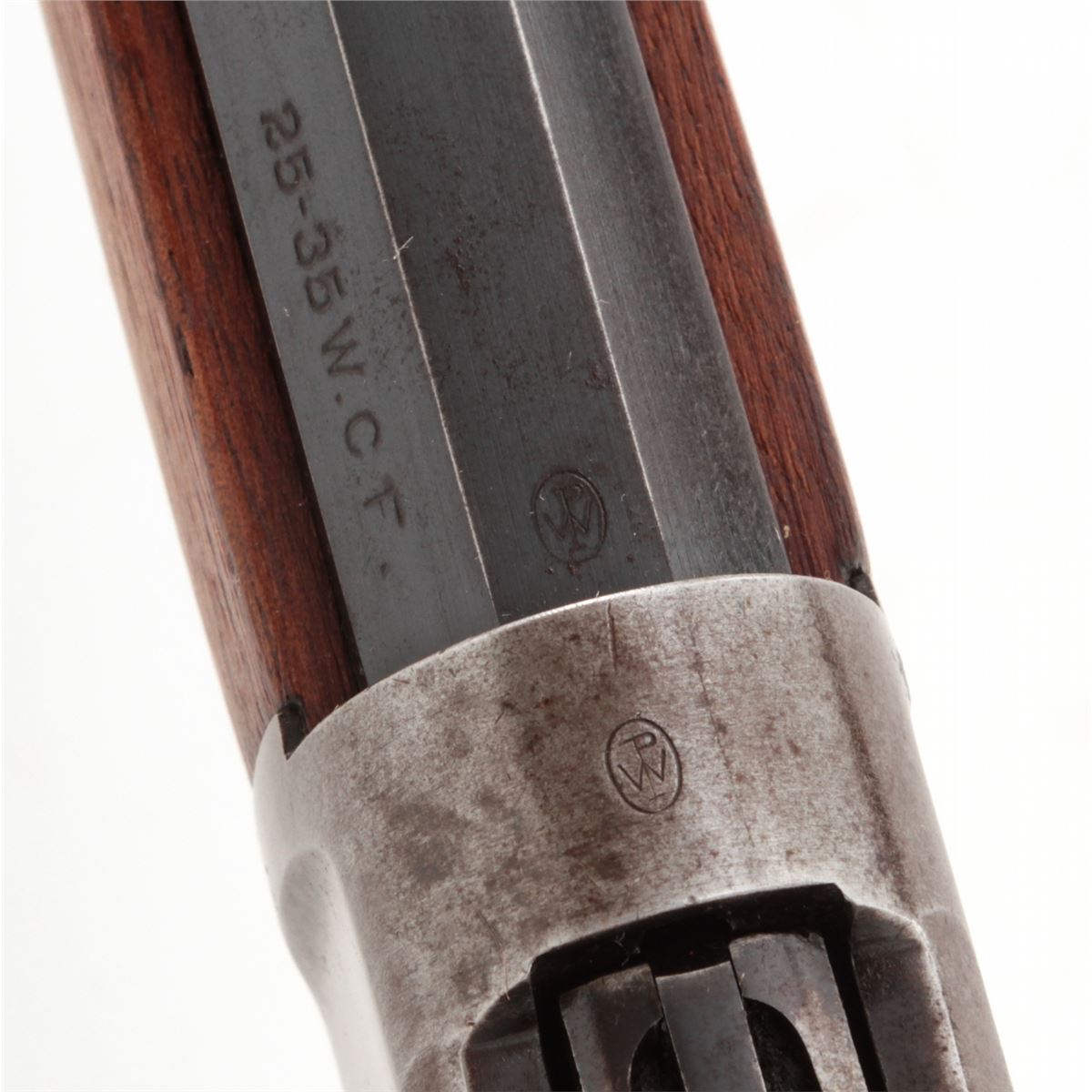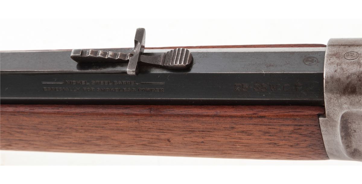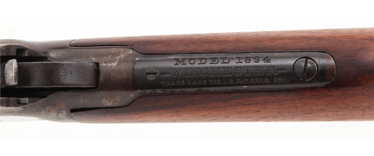 Winchester Model 1894 Lever Action Rifle, #847274, .25-35 cal., 26'' octagonal barrel, blue finish, walnut stock and forend. Mfg'd 1919. Condition is about fine. Barrel and mag tube retain approx. 96% lightly thinning blue. Receiver has flaked about bright with some minor traces of blue. Tang area remains vibrant with evidence of a now removed tang sight. Stock with light sanding and minor loss to forward left top corner of stock at upper tang. Action is good, bore is bright. Est.: $750-$1,000. (C&R)