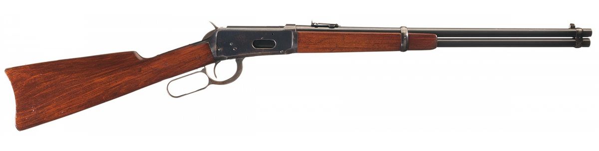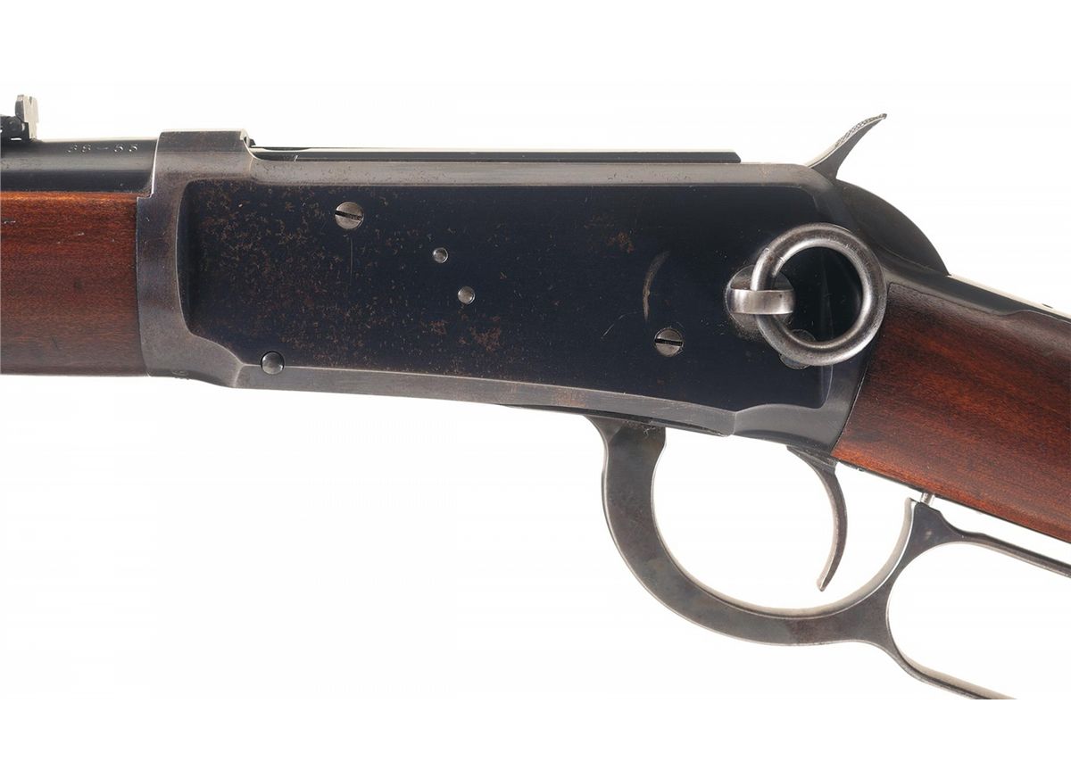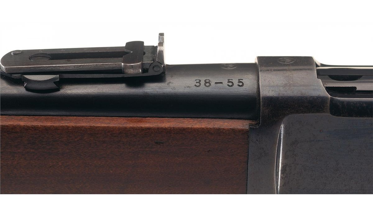 Manufactured in 1908. The top of the barrel is marked with the two line address/1894 patent date ahead of the rear sight and "38-55" on top at the breech. The Winchester oval proof is stamped on top of the barrel and receiver at the breech. The three line maker, model, patent date appear on the upper tang and the serial number on the bottom of the frame. Pinned blade front sight with bead, carbine folding leaf rear sight. Full length magazine tube and saddle ring stud and ring mounted on the left side of the receiver. Blue finish with casehardened lever, trigger and hammer, and mounted with a smooth walnut forearm and straight grip stock with carbine buttplate.