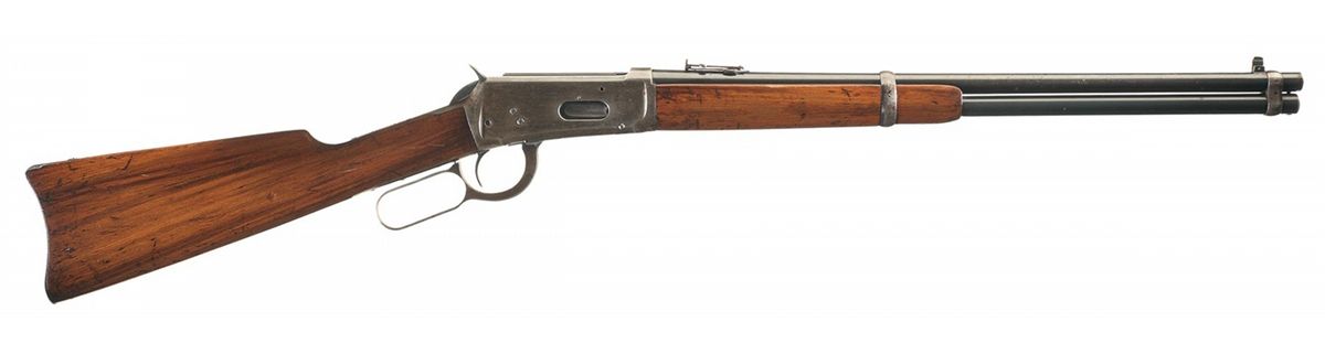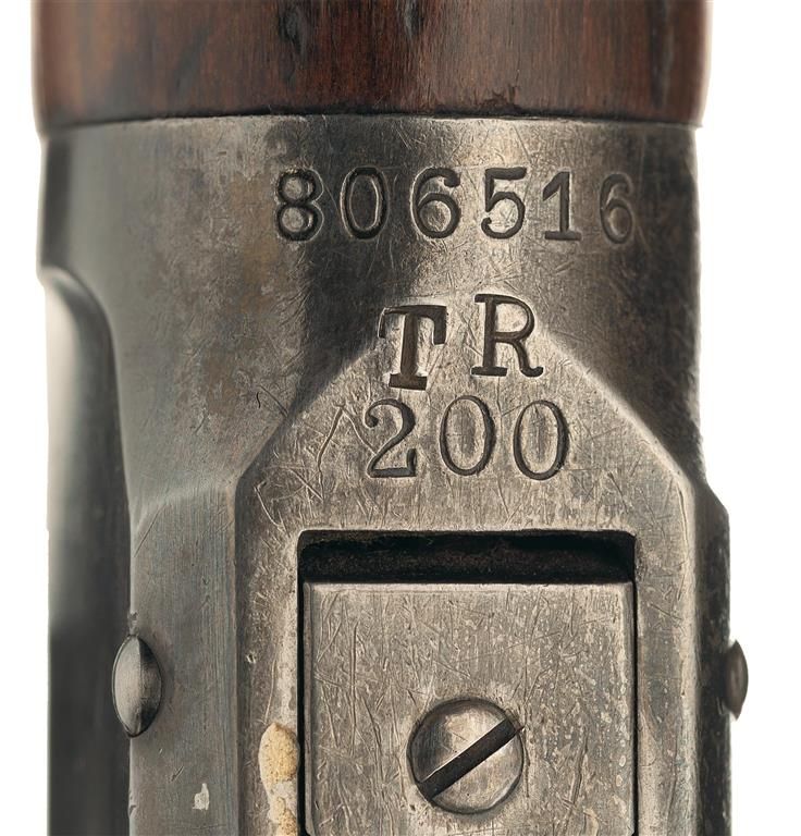 Manufactured in 1916. Marble beaded blade front sight and folding ladder rear carbine sight graduated to 200 yards. The left side of barrel is marked with the two line address/1894 patent date ahead of the rear sight, the two line nickel steel/smokeless powder marking next to the rear sight and "30 W.C.F." at the breech. The upper tang is marked with the model, maker, patent information and the serial number is on the bottom of the receiver. Directly below the serial number is marked "TR/200", significants unknown. Blue finish, saddle ring and stud on the left side of the receiver and mounted with a smooth walnut forearm and straight grip stock with a steel carbine buttplate.