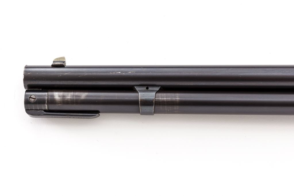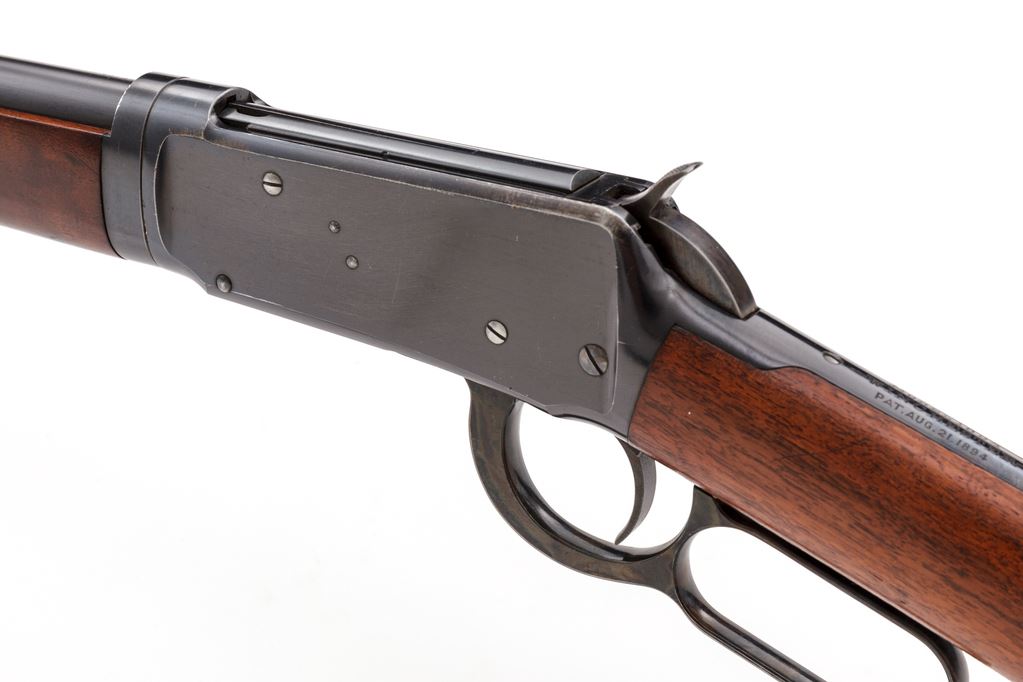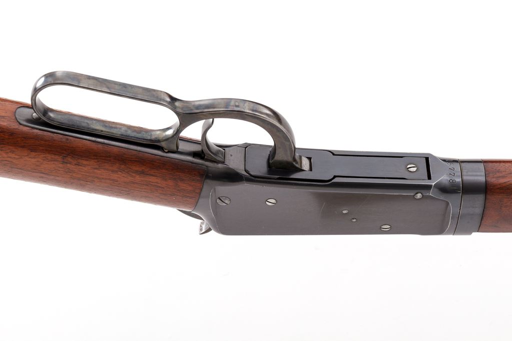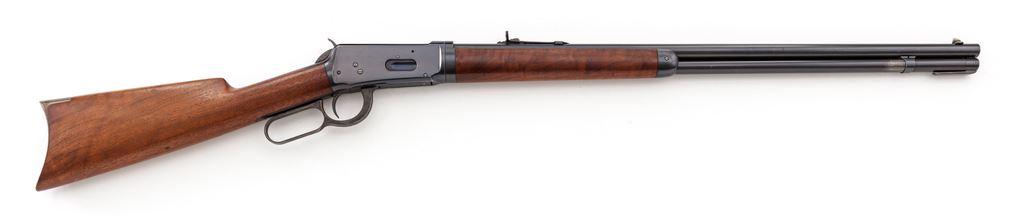 Winchester Model 1894 Lever Action Takedown Rifle, #15778, .32-40 cal., 26'' round barrel, blue finish, smooth straight walnut stock and forend, with standard front and rear sights.  Mfg'd 1895.  This antique Winchester rifle remains in fine+ condition retaining approx. 93% original factory blue, with scattered scratches and some thinning to barrel.  Mag tube with losses in action areas; frame with edgewear at wide point of receiver extension and some minor flaking along top edge, both sides with light scratching.  Case colors to lever and hammer are almost completely present.  Stock has never been sanded and fits proud to both upper and lower tang, as well as buttplate area.  Buttstock shows lovely feathered effect as grain has raised slightly over time; several small scratches and light knackering near comb are present.  Original forend of somewhat nicer figured wood shows moderate impressions as well. Buttplate has mostly silvered out except for the tang, with scattered dark spotting along the edges.  Magazine tube ring is missing its drift pin.  Crisp action, mirror bright bore.  Est.:  $4,000-$6,000. (Antique)