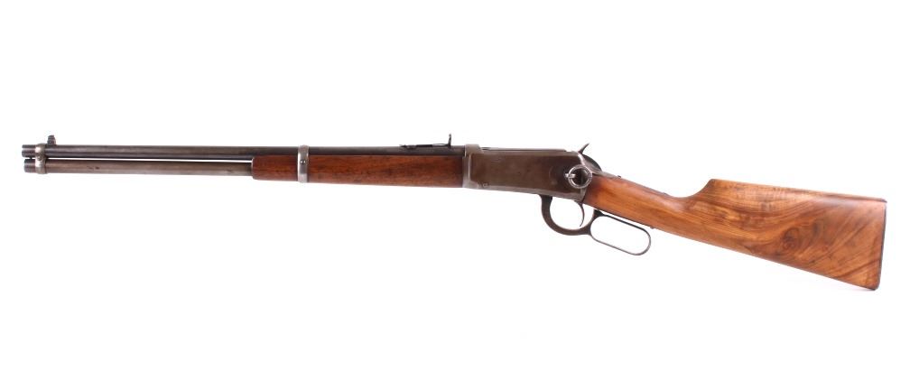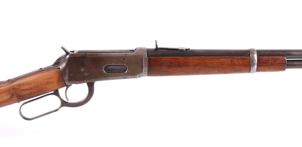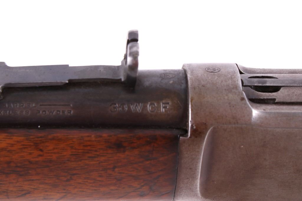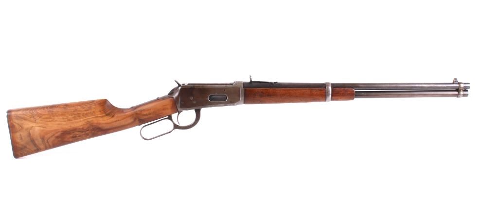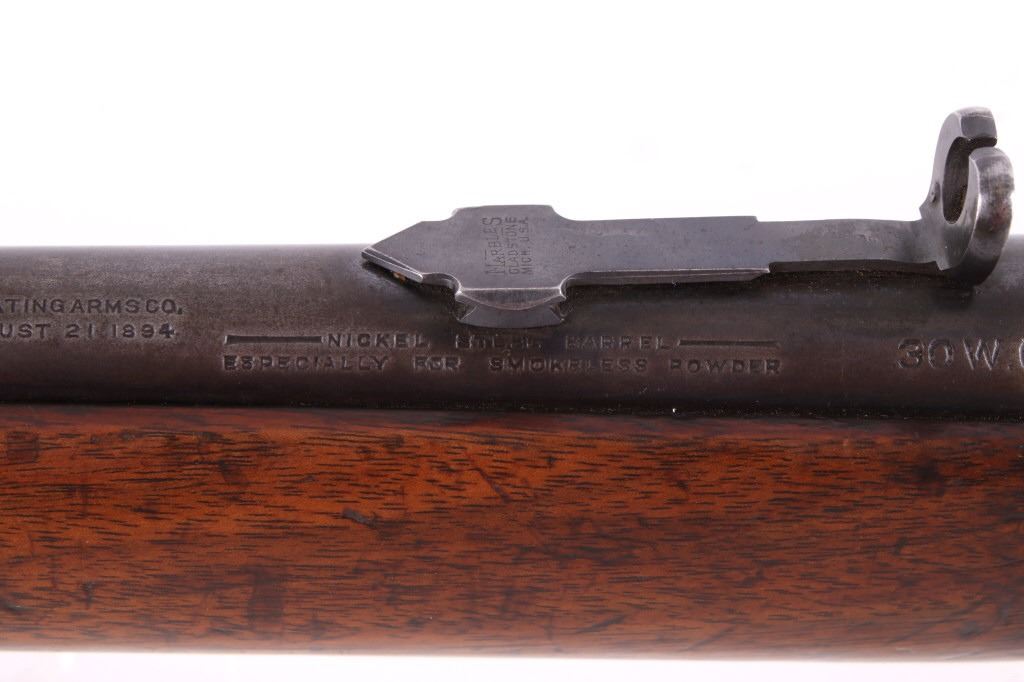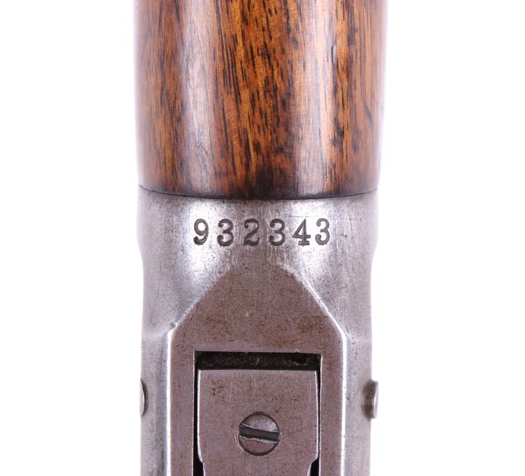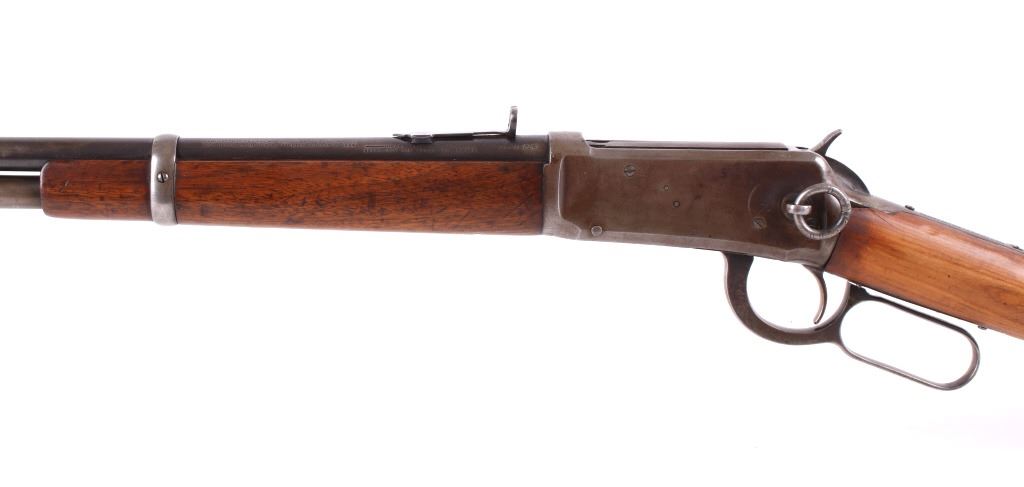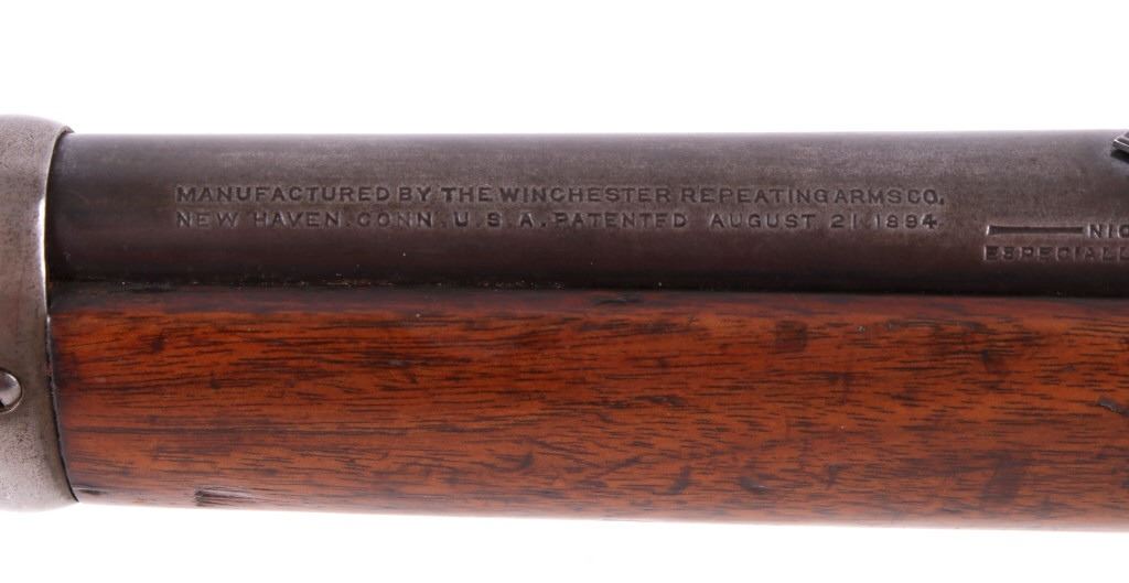 Offered for your consideration in this lot is a Winchester Model 94 Lever-Action saddle ring carbine, chambered in .30 Winchester Center Fire (WCF). The rifle dates to manufacture year 1921, and features a 20" round barrel, walnut fixtures, and an adjustable Marbles rear sight, paired with a Marbles brass front sight. The barrel is marked "Manufactured by the Winchester Repeating Arms. Co. - New Haven Conn. U.S.A. Patented August 21 1984 - Nickel Steel Barrel - Especially for Smokeless Powder - 30 W.C.F." The Winchester 94 became one of the most famous and popular hunting rifles of all time - Designed by the renowned John Browning in 1894, and was the first rifle to chamber smokeless powder .30 WCF - otherwise known as the .30-30. The Model 1894 has been referred to as the "ultimate lever-action design" by firearms historians such as R. L. Wilson and Hal Herring. The Model 1894 is the rifle credited with the name "Winchester" being used to refer to all rifles of this type. Overall, the rifle shows good condition, with fair blueing remaining on the barrel, and a nice even patina to the receiver, and magazine tube. The fore girp walnut fixtures show very-good condition, and the buttstock has been replaced. The top of the tang is marked "Model 94 -Winchester Trade Mark." The action is smooth, and the bore is bright with strong rifling. Serial Number: 932343. This firearm qualifies as a Curio & Relic, and requires FFL Transfer or NICS Background Check.
