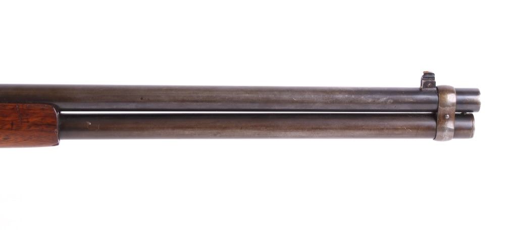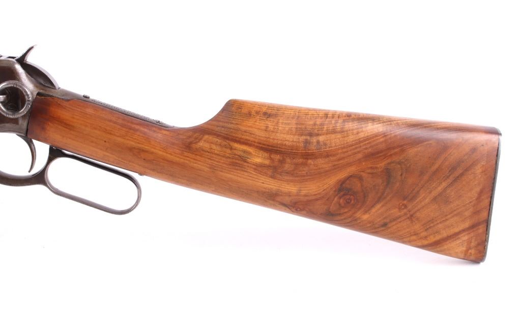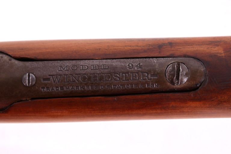 Offered for your consideration in this lot is a Winchester Model 94 Lever-Action saddle ring carbine, chambered in .30 Winchester Center Fire (WCF). The rifle dates to manufacture year 1921, and features a 20" round barrel, walnut fixtures, and an adjustable Marbles rear sight, paired with a Marbles brass front sight. The barrel is marked "Manufactured by the Winchester Repeating Arms. Co. - New Haven Conn. U.S.A. Patented August 21 1984 - Nickel Steel Barrel - Especially for Smokeless Powder - 30 W.C.F." The Winchester 94 became one of the most famous and popular hunting rifles of all time - Designed by the renowned John Browning in 1894, and was the first rifle to chamber smokeless powder .30 WCF - otherwise known as the .30-30. The Model 1894 has been referred to as the "ultimate lever-action design" by firearms historians such as R. L. Wilson and Hal Herring. The Model 1894 is the rifle credited with the name "Winchester" being used to refer to all rifles of this type. Overall, the rifle shows good condition, with fair blueing remaining on the barrel, and a nice even patina to the receiver, and magazine tube. The fore girp walnut fixtures show very-good condition, and the buttstock has been replaced. The top of the tang is marked "Model 94 -Winchester Trade Mark." The action is smooth, and the bore is bright with strong rifling. Serial Number: 932343. This firearm qualifies as a Curio & Relic, and requires FFL Transfer or NICS Background Check.