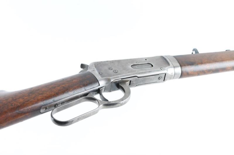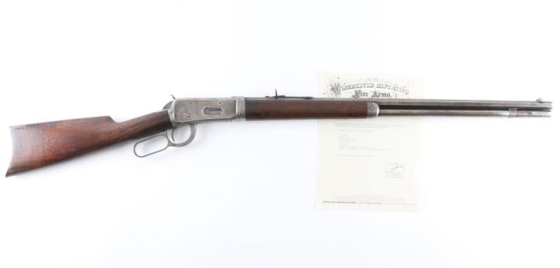 'Take Down' Early production rifle manufactured circa 1895. Features 26" octagon barrel, full length magazine tube, dovetailed blade front sight, buckhorn rear sight, smooth walnut forend & straight wristed buttstock, steel crescent buttplate. Bore is fair to good condition, dark grooves, lightly frosted throughout, strong rifling. Metal surfaces are thin brown patina colored, smooth textured, with mostly silver color on receiver, some darker color blue retained in small areas (rear sight, bolt & locking block, receiver scallops). Areas of light pinprick patina across rear of receiver. Bare metal on mag tube where it slides forward during takedown. Wood is good condition, light shrinkage or erosion at tang and toe, oil stained where wood touches metal, dented throughout. Included factory letter confirms this rifle caliber, octagon barrel, takedown. Condition is NRA Good *** Antique Firearm *** [From the Jim Sigmon Collection]