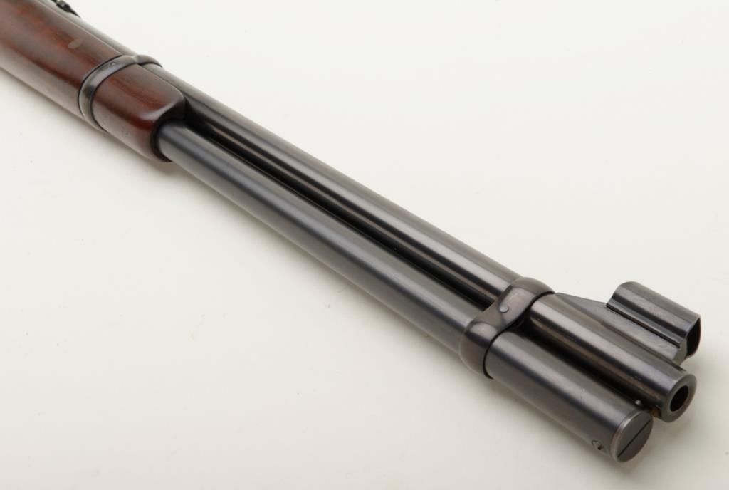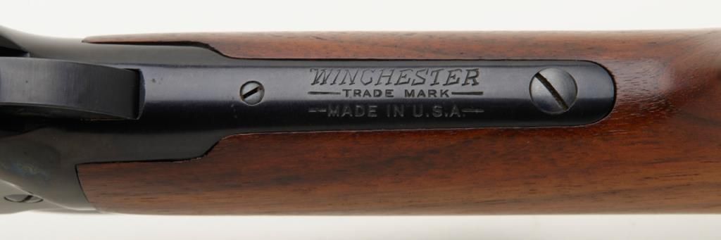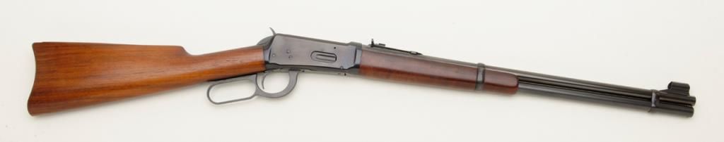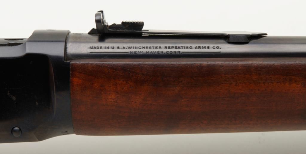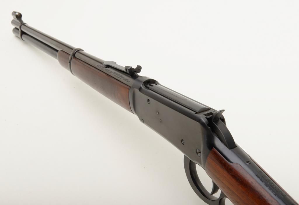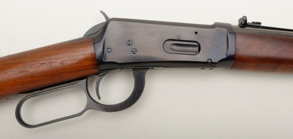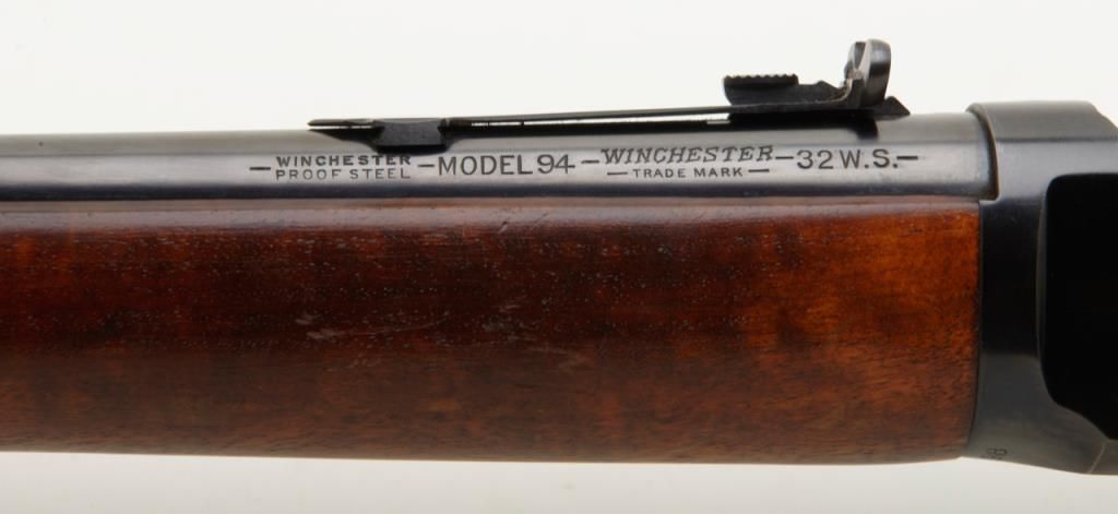 Winchester Model 1894 eastern carbine in .32 Winchester special caliber remaining in fine to excellent original condition, serial number 1101498. The carbine shows early style bands and carbine butt plate. Approximately 95% original bright blue remains just aging slightly with a few smudges and slight losses. The stocks are very good plus to near fine with just minor imperfections. The action is very tight and the bore is excellent. A strong 9 on a 1 to 10 scale. Est.: $750-$1500