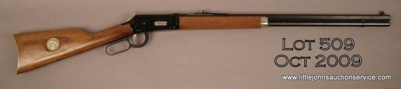 Winchester Model 1894 lever action Buffalo Bill Commemorative rifle, 30-30 cal., 26” octagon barrel, blue finish, wood stocks, #WC62622. This gun is in excellent condition showing little handling, approx. 99% original finish, fine bore,sharp markings, crisp action, excellent wood with Cody inset coin on right side of butt stock. No box. Est.: $300-$500.