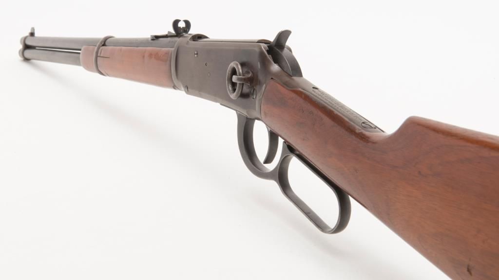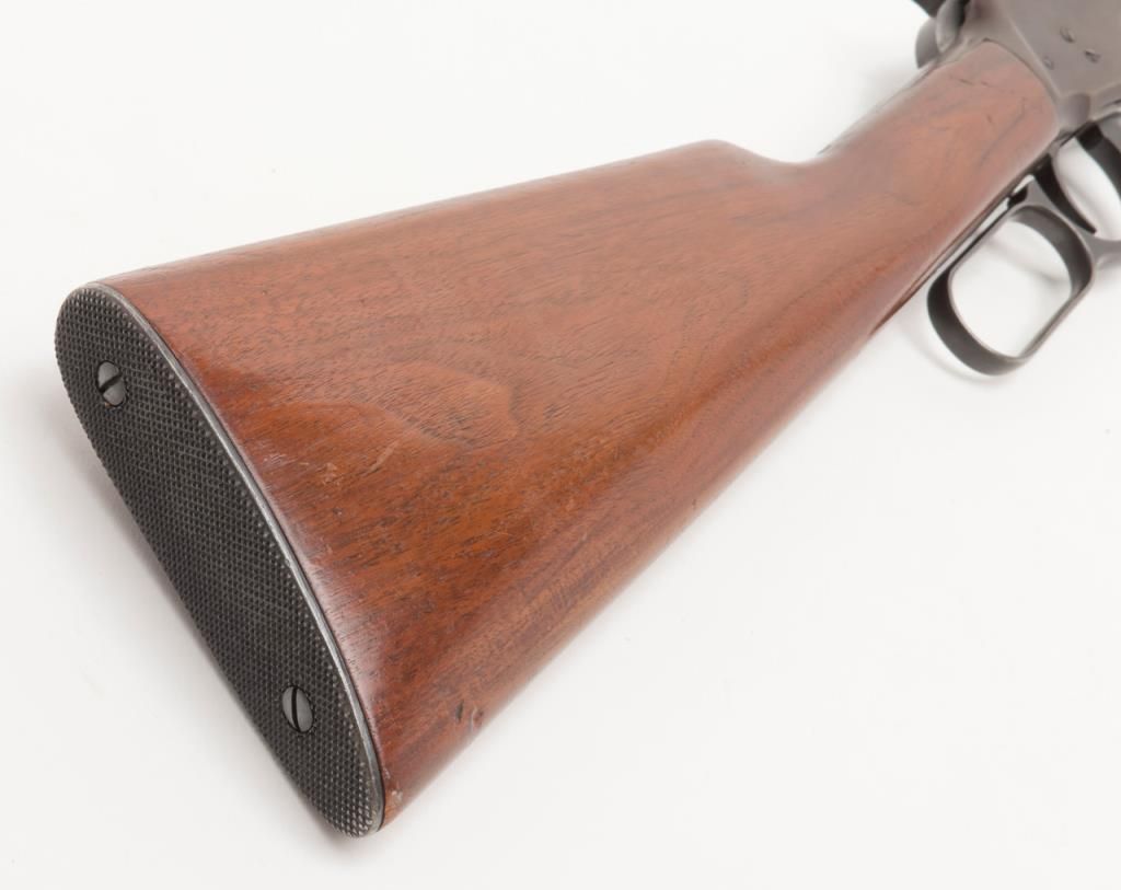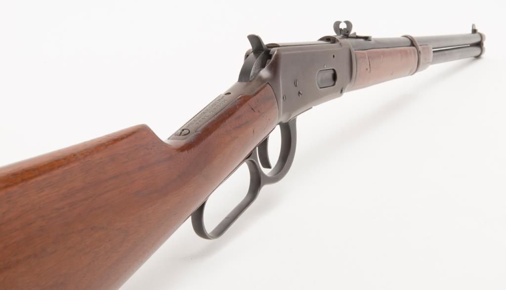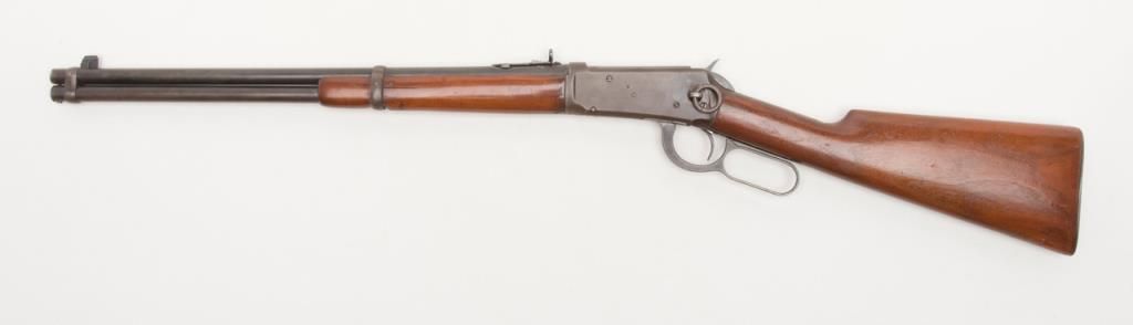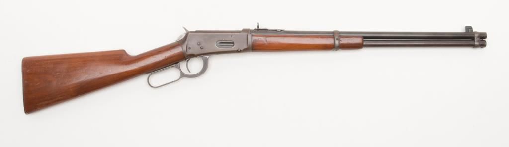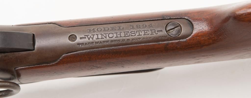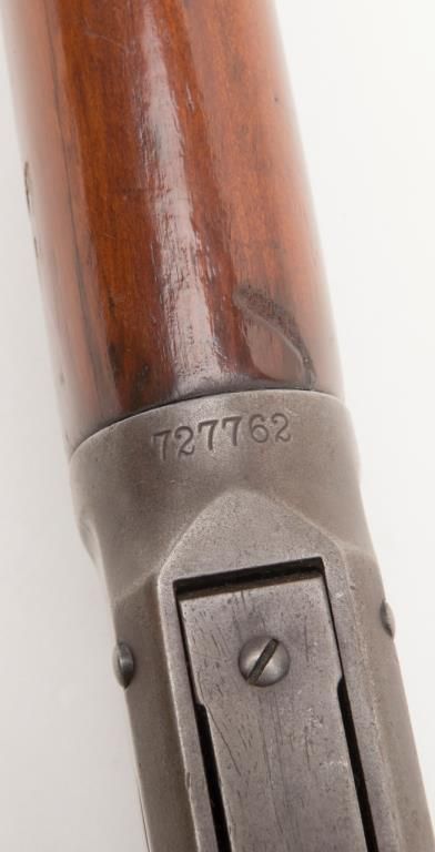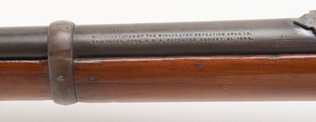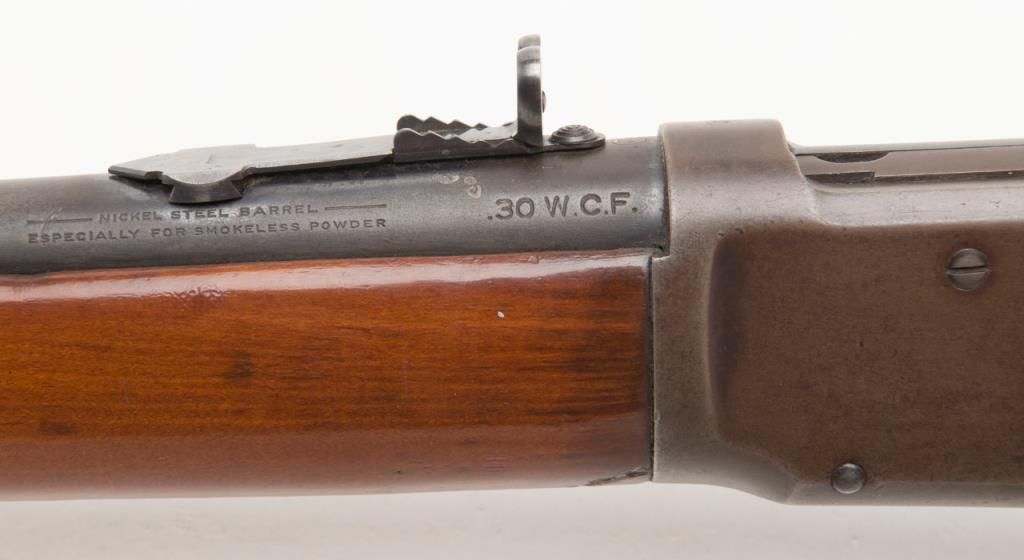 Winchester Model 1894 lever action SRC, .30 WCF cal., 20” barrel, blue finish, wood stocks, #727762. This gun is in overall very good condition showing muted blue finish with balance gone to a pleasing brown patina, good bore, crispaction and good markings, wood is overall good showing an old re-finish ; shotgun butt with checkered steel butt plate. Est.: $500-$750.