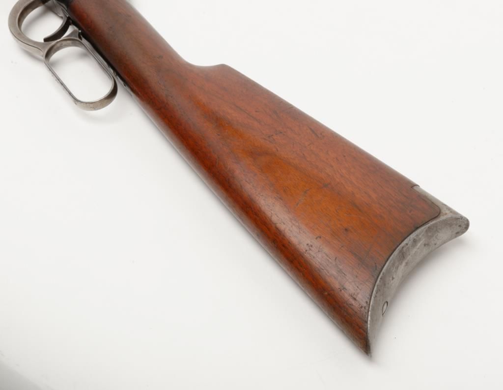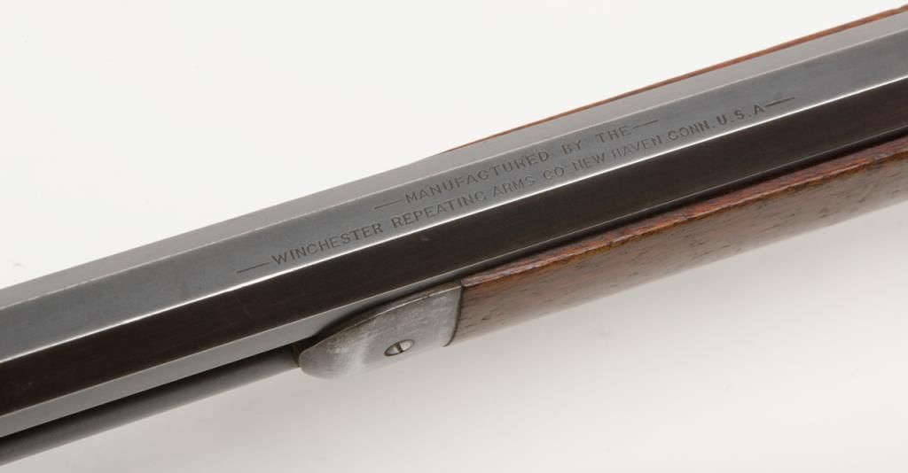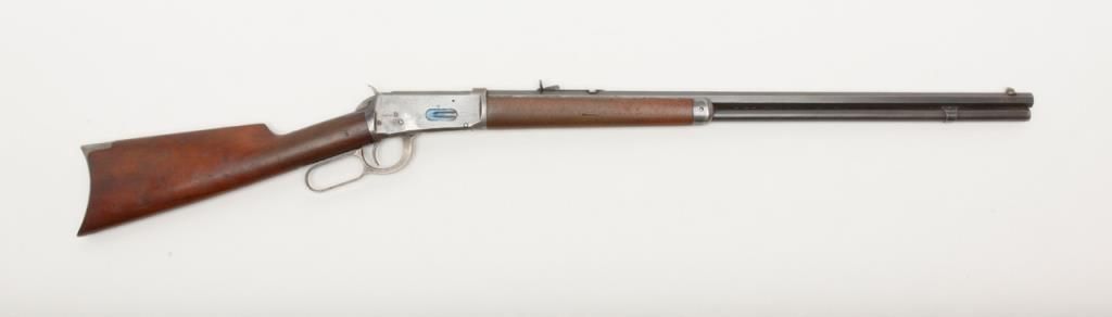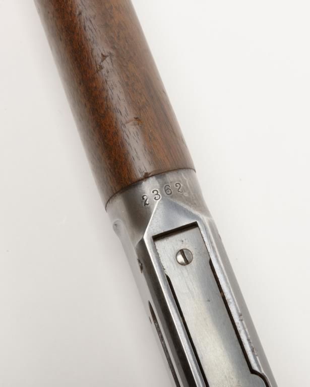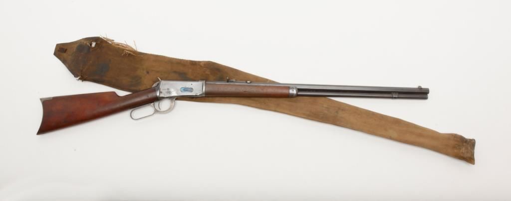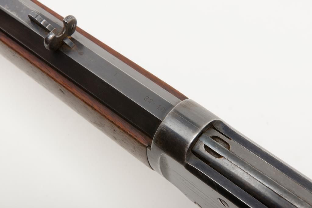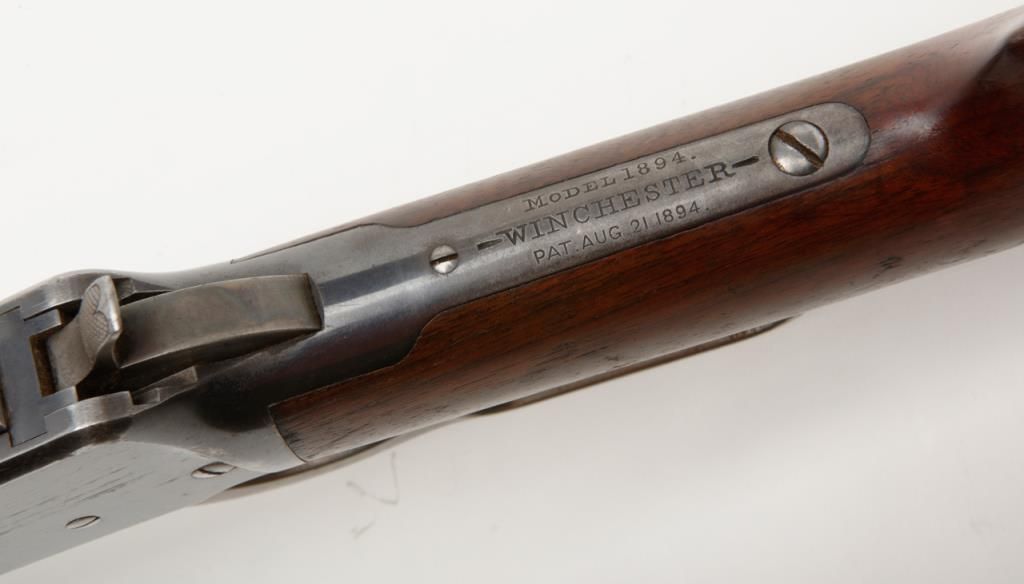 Winchester Model 1894 lever action rifle, 1st year of production, .32-40 cal., 26” octagon barrel, blue finish, wood stocks, correct sights, #2362 in overall very good to fine condition showing the majority of its original blue finish with evenconsiderable original niter blue finish on the loading gate, crisp action, sharp markings, good to very good bore, good to very good wood with old scattered mars and scratches from carry and storage; accompanied by an old well-worn canvasboot. (Antique). Est.: $2,000-$4,000.