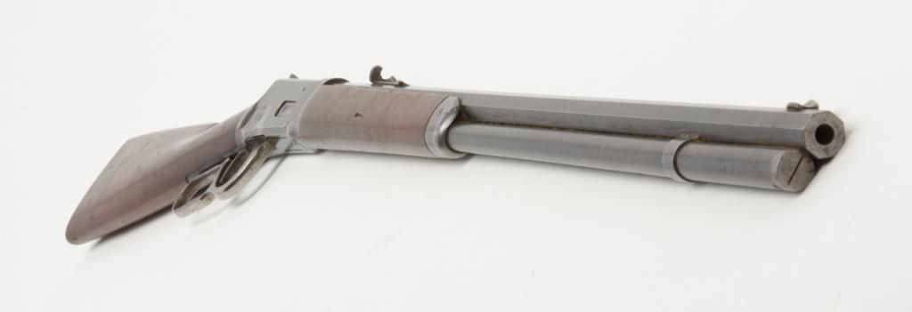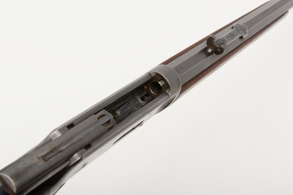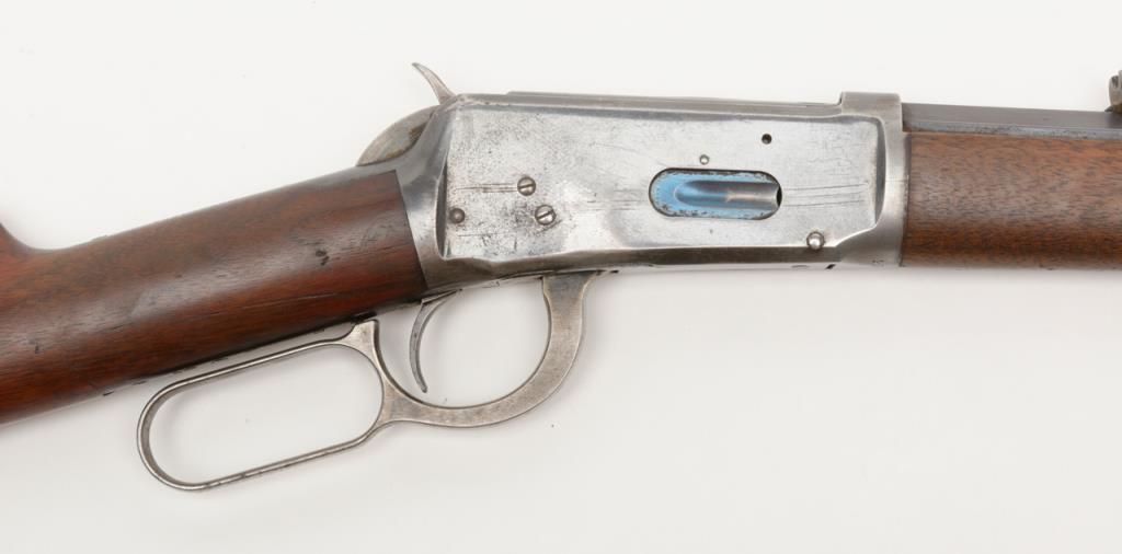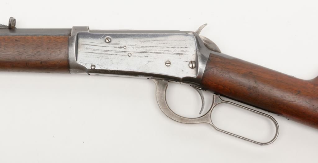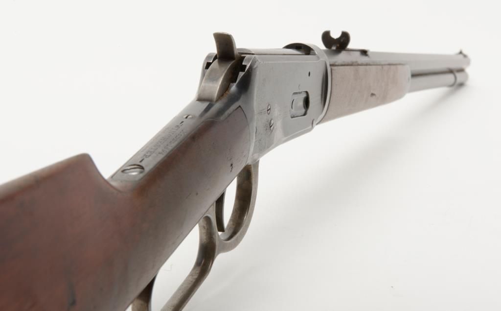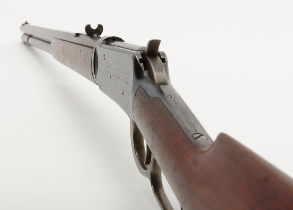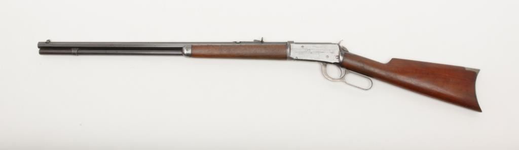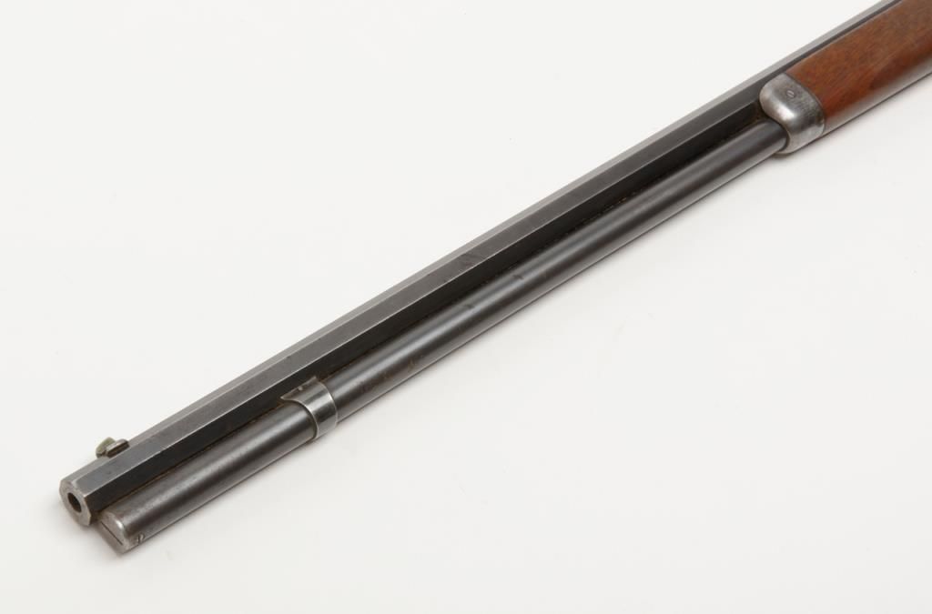 Winchester Model 1894 lever action rifle, 1st year of production, .32-40 cal., 26” octagon barrel, blue finish, wood stocks, correct sights, #2362 in overall very good to fine condition showing the majority of its original blue finish with evenconsiderable original niter blue finish on the loading gate, crisp action, sharp markings, good to very good bore, good to very good wood with old scattered mars and scratches from carry and storage; accompanied by an old well-worn canvasboot. (Antique). Est.: $2,000-$4,000.