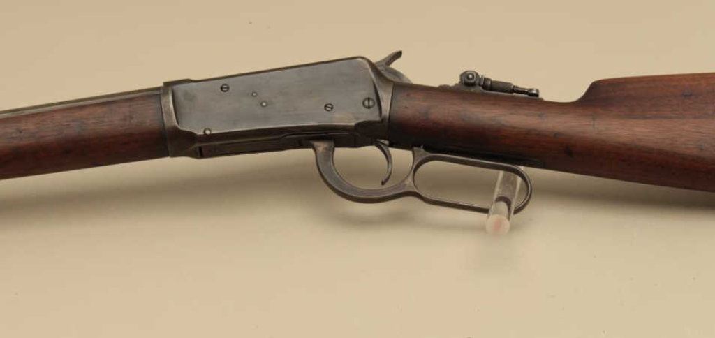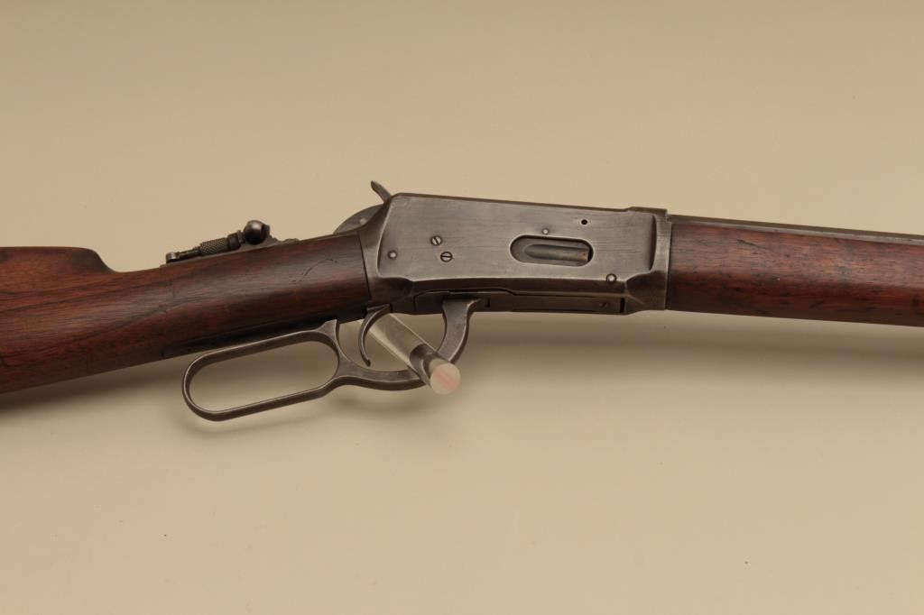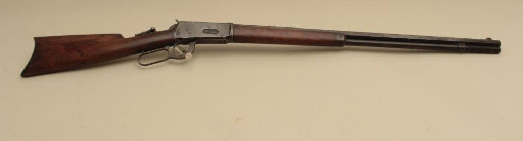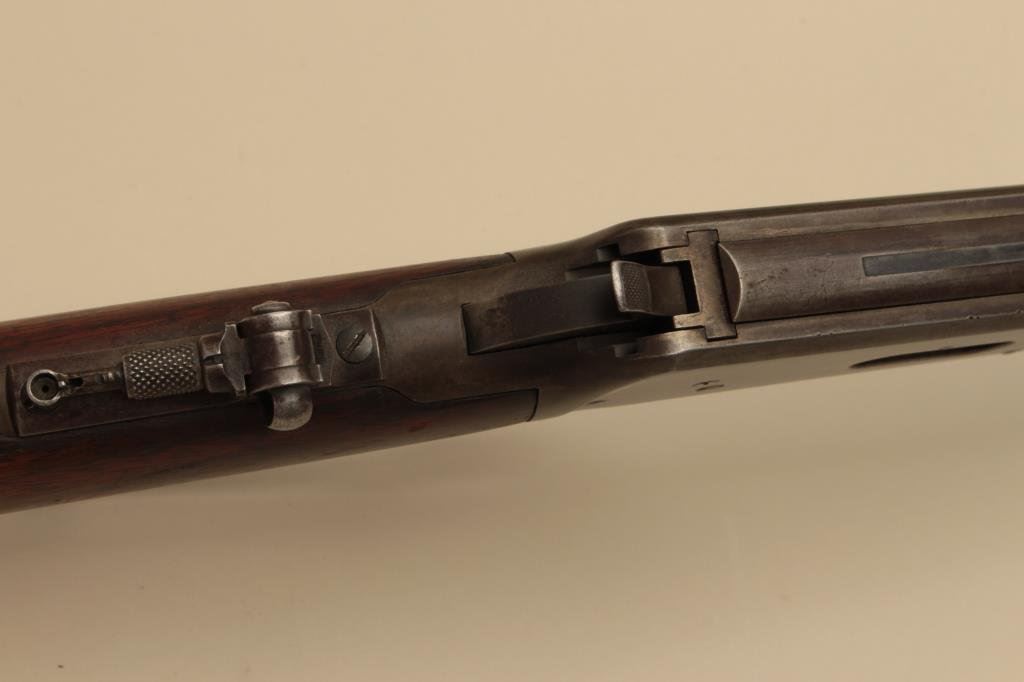 octagon barrel, blued finish, wood stocks, S/N 223820, in overall good + condition with original blue in protected areas with balance gone to a brown patina, bore is good, markings are good, rear sight dovetail has been filled, adjustable tang sight present, overall good wood displaying normal aging and wear. (C&R). Est.: $700-$1,400.