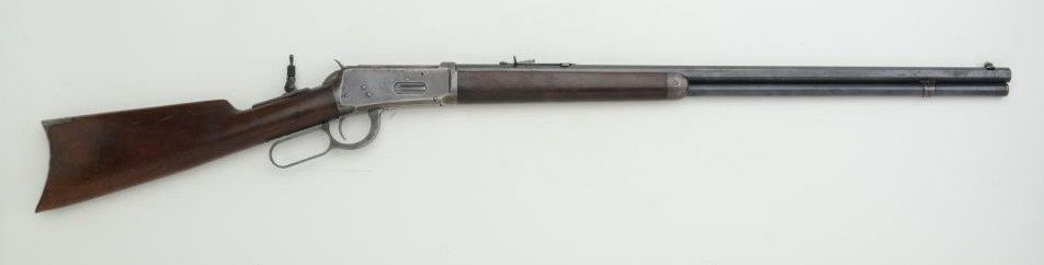 Winchester Model 1894 lever action rifle, .30 W.C.F. cal., 26” octagon barrel, blue finish, wood stocks, #436699. This gun is in overall very good to fine condition showing the majority of its original finish on thebarrel assembly and strong traces of original finish on the receiver; very good bore, action, markings and wood stocks; Lyman adjustable tang sight. From an old estate. Est.: $300-$600.