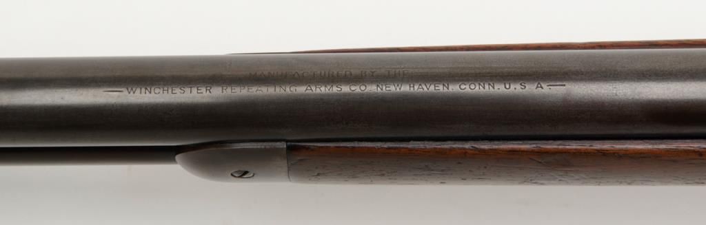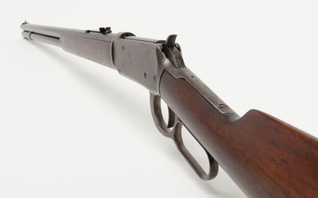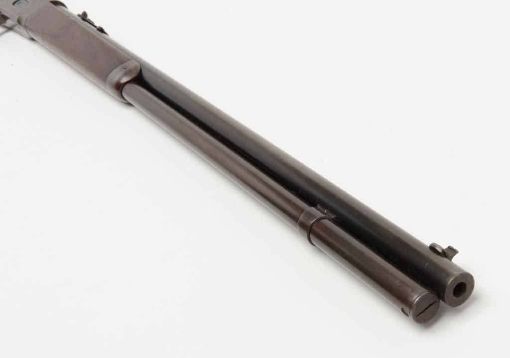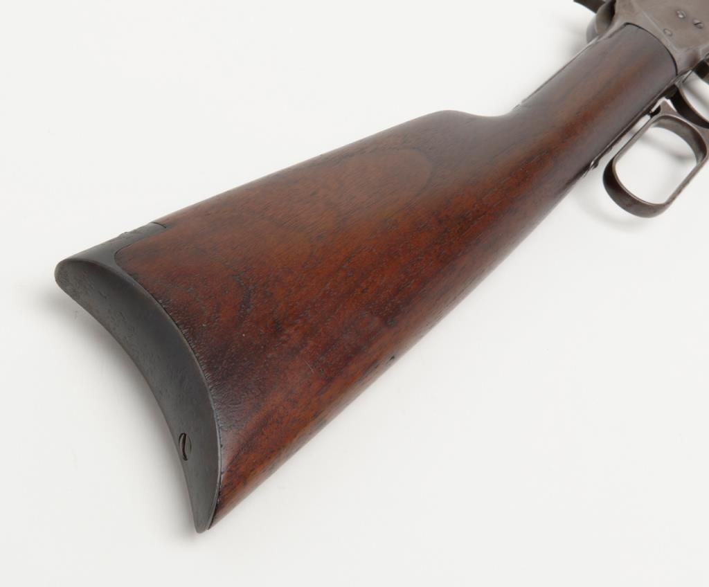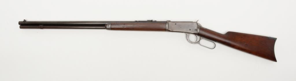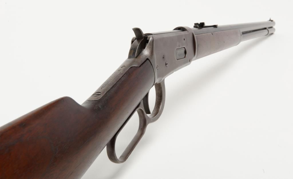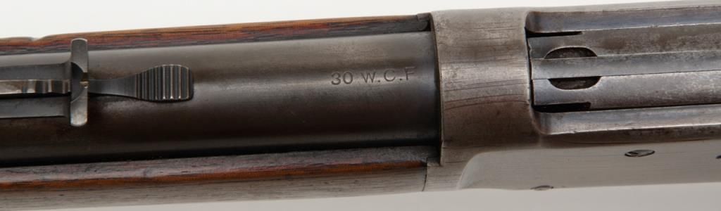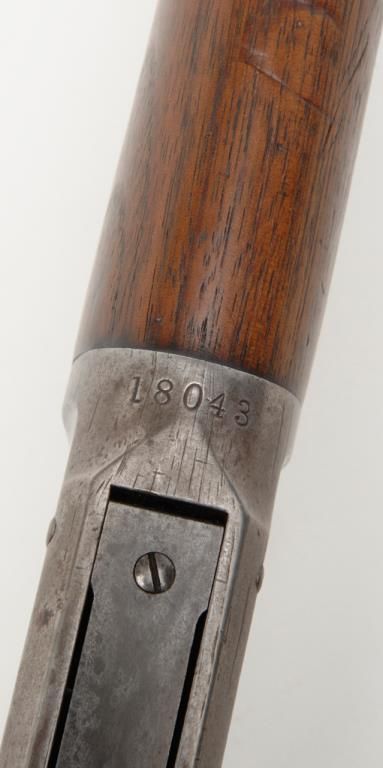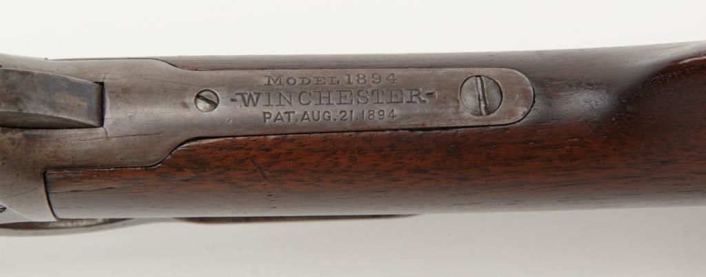 Winchester Model 1894 lever action rifle, .30 W.C.F. cal., 26” round barrel, blue finish, wood stocks, #18043 in overall very good condition showing considerable muted original blue finish mixed with plum patina on barrel and tube, greypatina on receiver, very good bore, crisp action, very good markings and wood; a nice early ’94 rifle. (Antique). Est.: $1,000-$2,000
