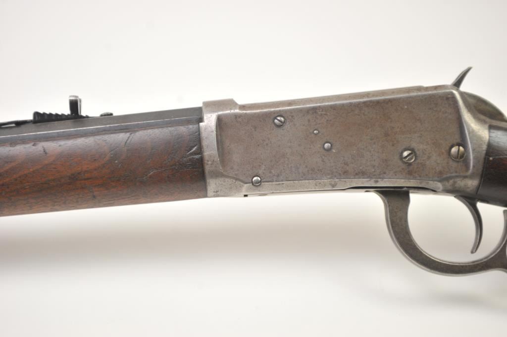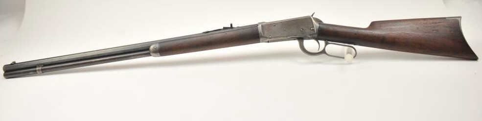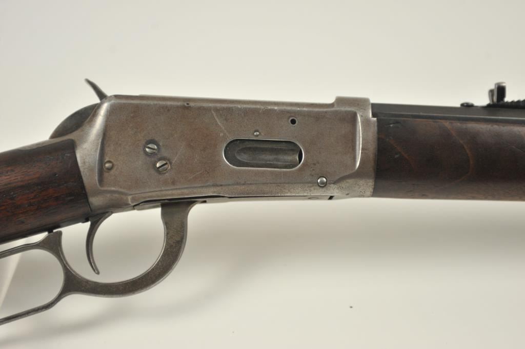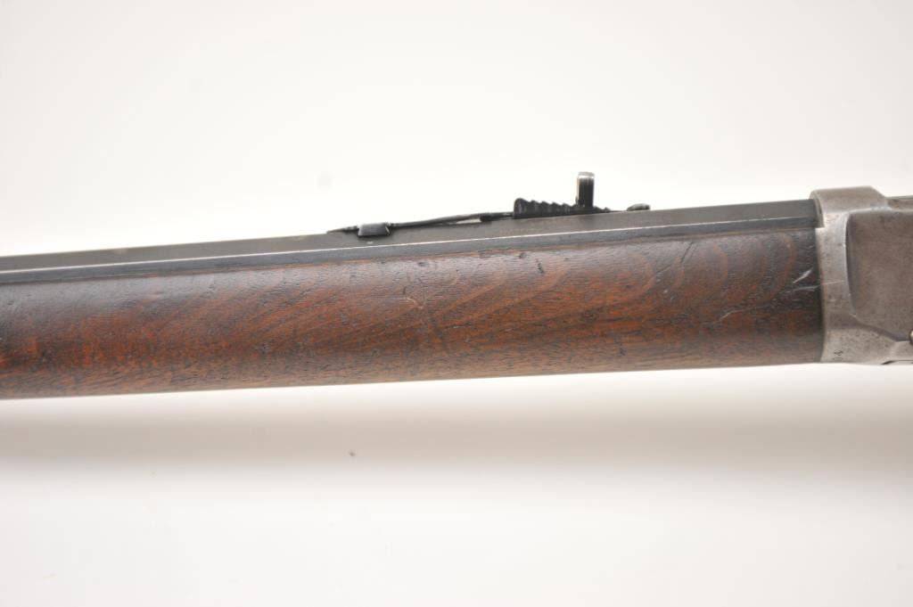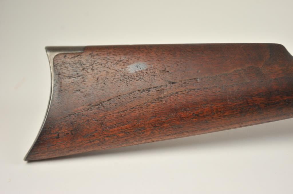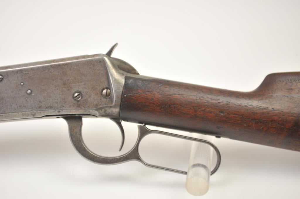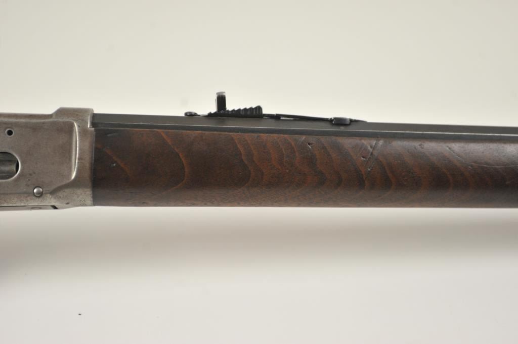 Winchester Model 1894 lever action rifle, .30 WCF caliber, Serial #263004. The rifle is in very good overall condition with a 26” octagon barrel with a full-length magazine. The barrel and tube retain a significantamount of toning blue finish drifting to dark patina with a King’s buckhorn sight added. The edges are sharp and there is high point edge wear. The receiver has gone to grey/brown patina with traces of old blue inthe protected areas. The hammer and lever still have some muted case coloring evident. The smooth wood stock is in good condition with mars and dents from carry and use. The bore is fair and the action works well onthis desirable Winchester lever circa 1902. Est.: $600-$1,200. (C+R).