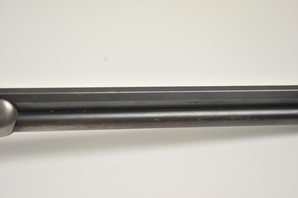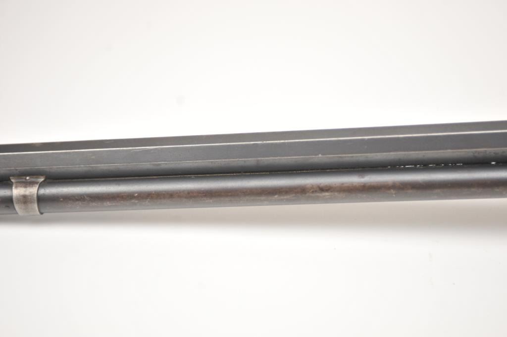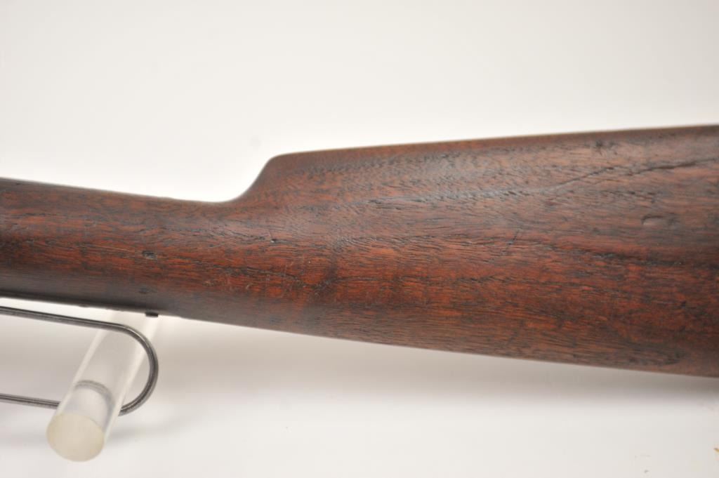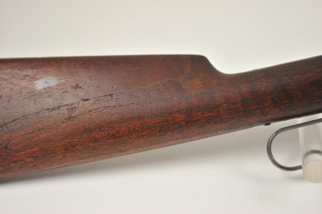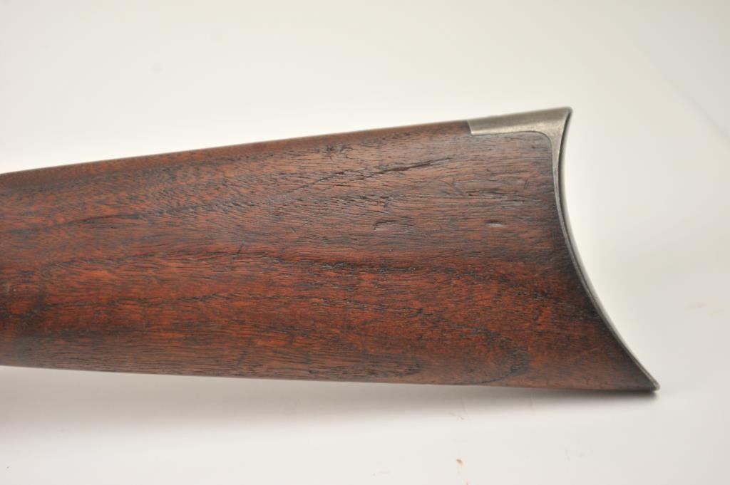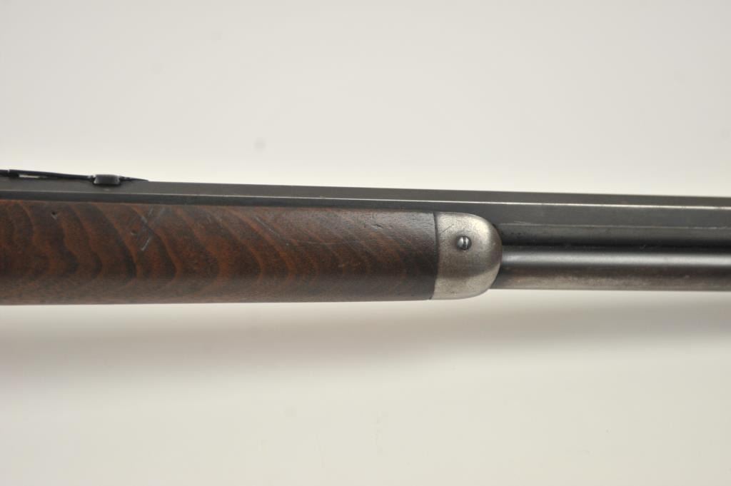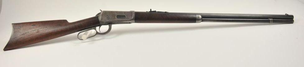 Winchester Model 1894 lever action rifle, .30 WCF caliber, Serial #263004. The rifle is in very good overall condition with a 26” octagon barrel with a full-length magazine. The barrel and tube retain a significantamount of toning blue finish drifting to dark patina with a King’s buckhorn sight added. The edges are sharp and there is high point edge wear. The receiver has gone to grey/brown patina with traces of old blue inthe protected areas. The hammer and lever still have some muted case coloring evident. The smooth wood stock is in good condition with mars and dents from carry and use. The bore is fair and the action works well onthis desirable Winchester lever circa 1902. Est.: $600-$1,200. (C+R).