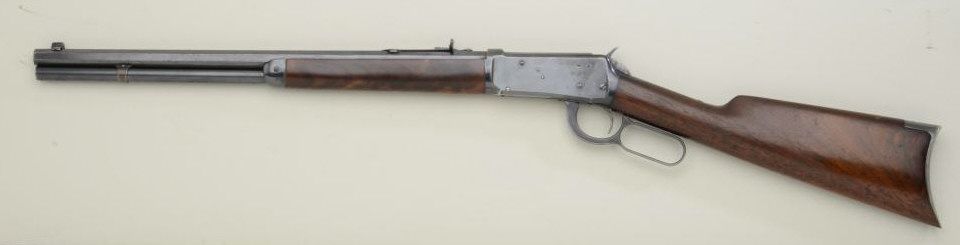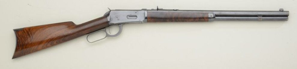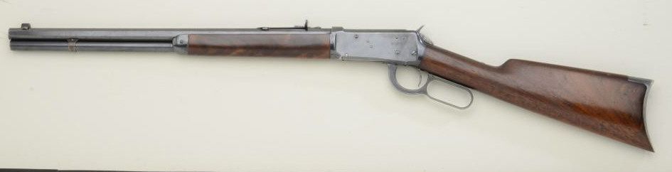 Winchester Model 1894 lever action short rifle, .30-30 Winchester cal., 20" octagon barrel, full magazine, crescent butt, serial #1218217. The rifle retains 90-95% original blue, some drifting at the edges, slighterosion, beginning age and slight losses. The receiver shows 2 plug screws where drilled for Lyman type receiver sight on left side. The stocks show a slightly better than average grain and are possibly 1X with20-40% original varnish, even loss, slight scratches and normal use. The markings are good, the rear sight is marked patented February 22, 1927 in the original dovetail, and a Lyman type front sight is in the frontdovetail. The action is good, the bore is near excellent. A fine quality and scarce original short rifle. Est.: $1,750-$3,500
