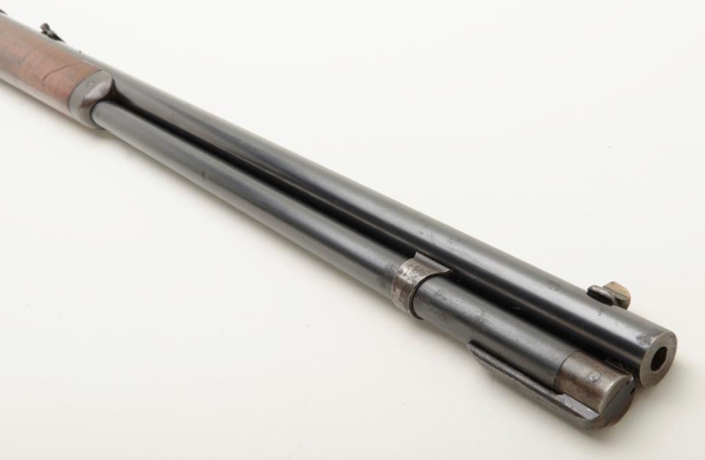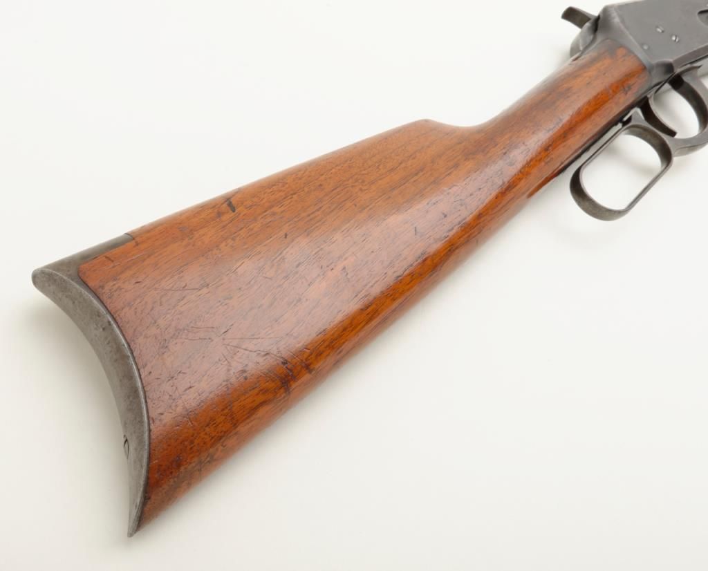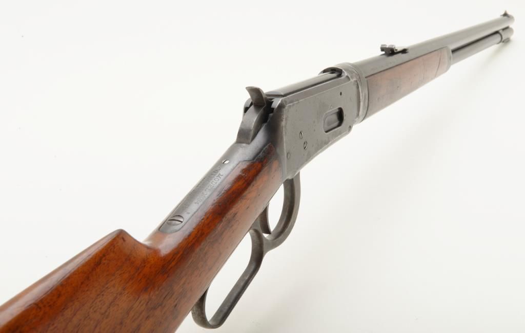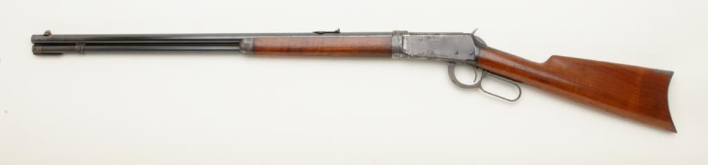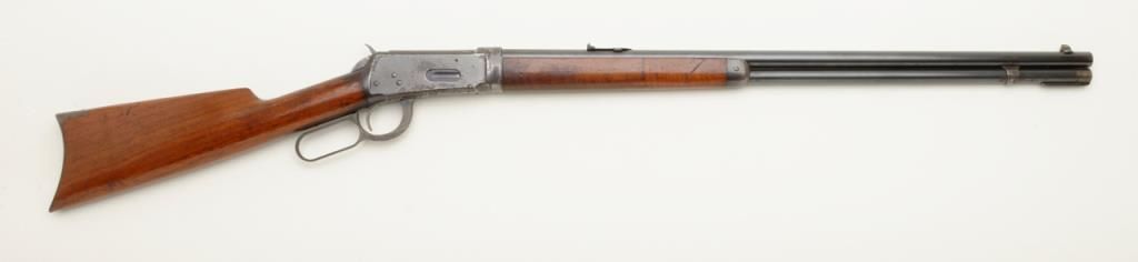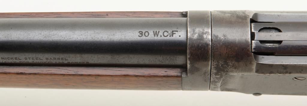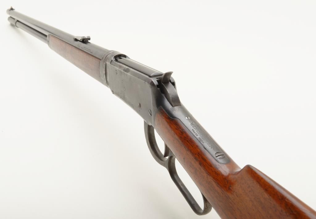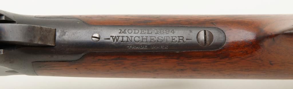 Winchester Model 1894 lever action takedown rifle, .30 W.C.F. cal., 26” round barrel, blue finish, wood stocks, #239742; 85%-95% original bright blue finish, very good + wood, 3 leaf rear sight, strong case colors on the hammer and trigger; some slight pitting in a few areas. (C&R/PPT). Est.: $1,400-$2,800.