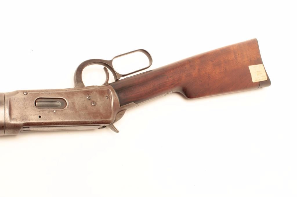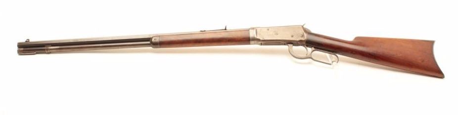 Winchester Model 1894 lever action takedown rifle, .30 W.C.F. caliber, 26” octagon barrel, blued finish, wood stocks, S/N 146118, in overall good condition with majority of muted blued finish on barrel,balance of gun gone to a brown patina; good bore, action and markings, good to very good wood stocks. (Antique) Est.: $900-$1,800.