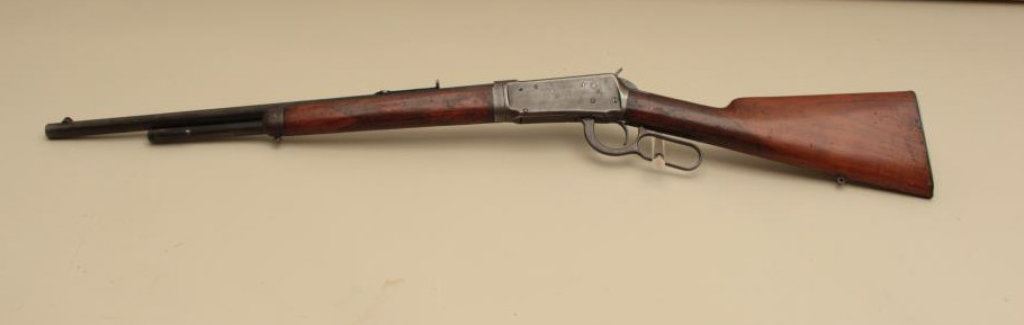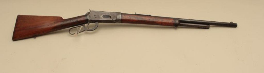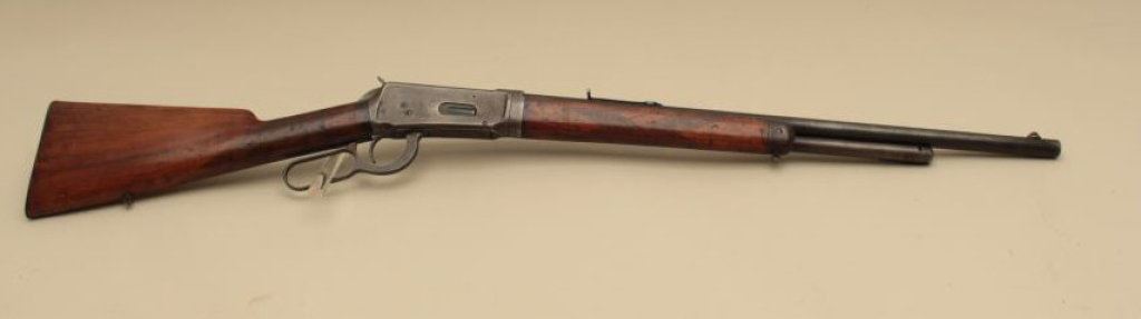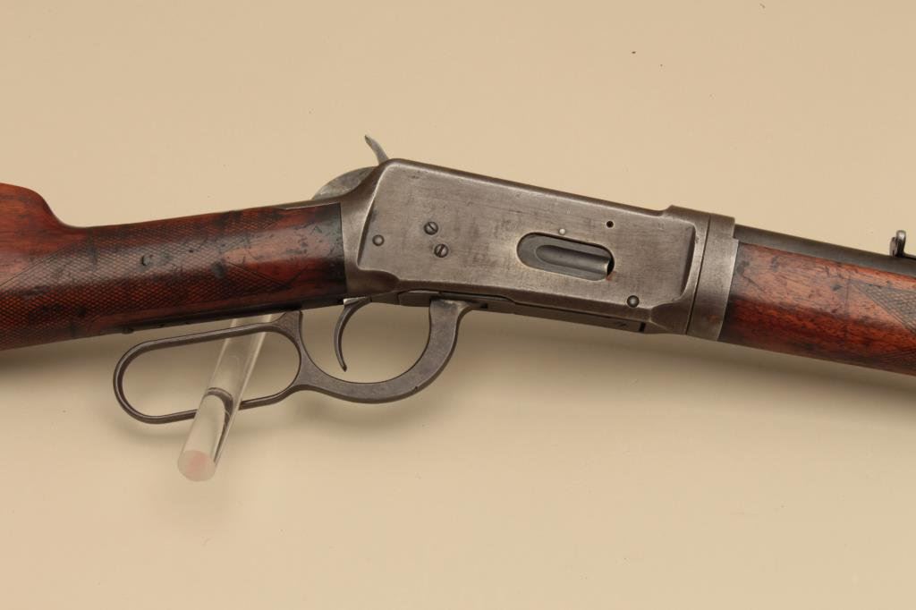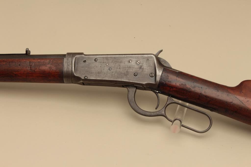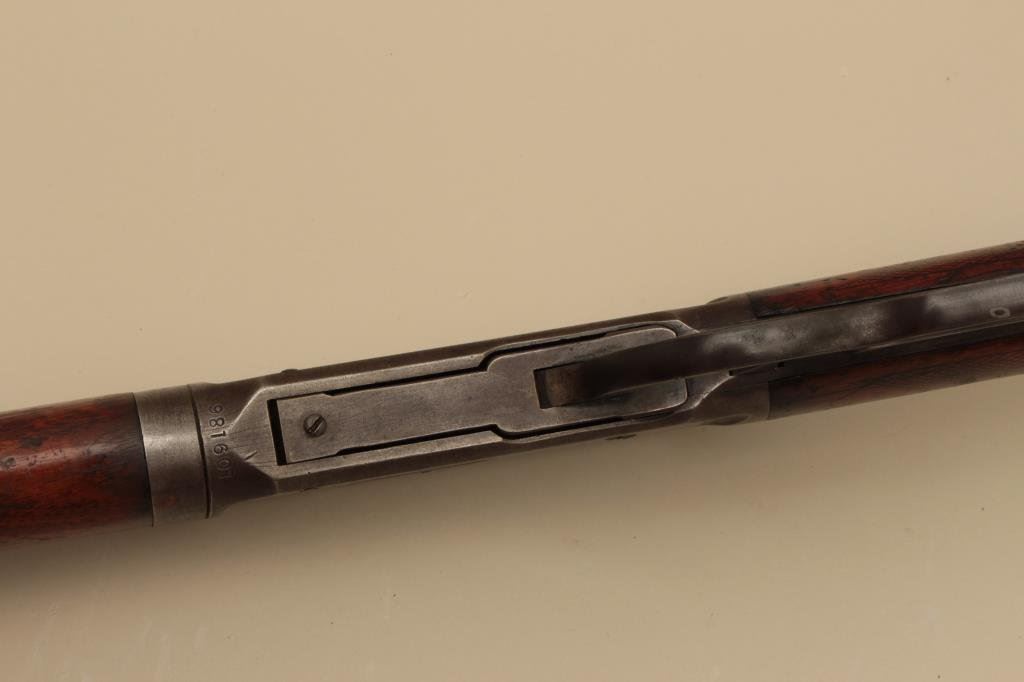 barrel reduced to 22” with ¾ magazine, wood stocks with old hand done light checkering, shotgun butt plate, S/N 109186, in overall good condition as modified; good action, fair to good bore, good markings, good wood; left side of receiver tapped for sight mounts. (C&R). Est.: $500-$1,000.