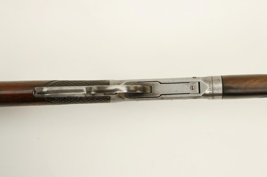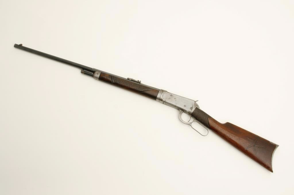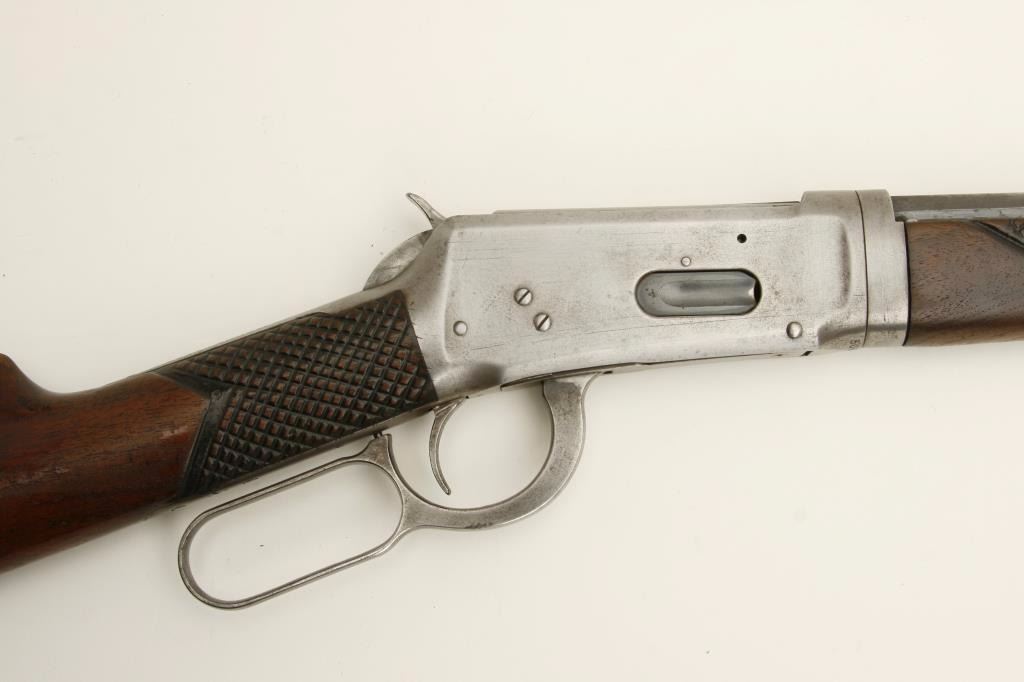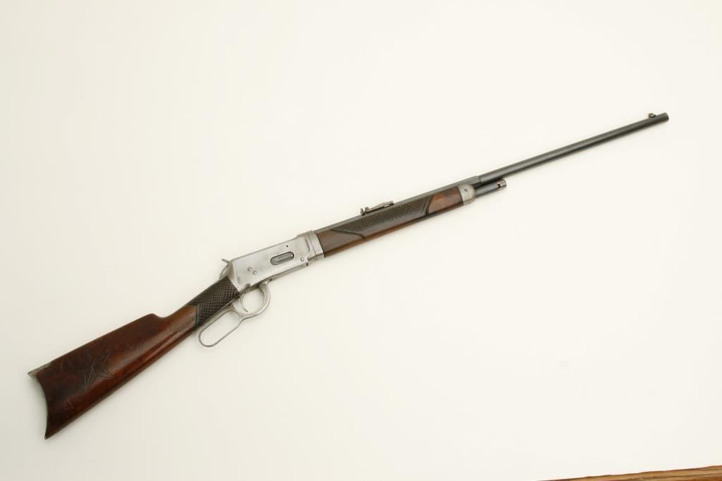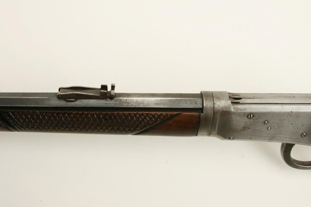 Winchester Model 1894 lever action takedown rifle, .32 W.S. caliber, special order 26” half round/half octagon barrel plus special order half magazine, blued finish, non-factory checkering to wood stocks, S/N506871; overall good to very good condition with considerable original blue on barrel, grey patina to receiver, good bore, action and markings; wood stocks show previously noted non-factory checkering and a carved 5point star on each side of the butt stock. (C&R). Est.: $800-$1,600.