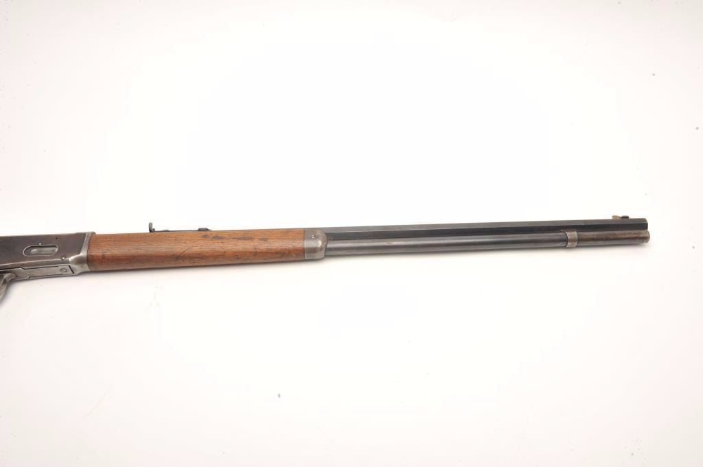 Winchester Model 1894 rifle, .32-40 caliber, S/N 58973 showing early markings and variations and made about 1895. This Winchester remains in very good plus original condition showing 80%-90% original blue onthe octagon barrel and tube. Sharp markings with good edges. 50%-70% original blue on the frame drifting at the edges and tangs. Hints of case colors on the hammer, lever and butt plate but mainly patina. The stocks are ingood to very good condition with a major chip above the marking at the tang and other smaller imperfections. Good action and good bore. This is the era where Winchester advertised the 1894 as “The Klondike Rifle”and many went north to the Alaskan frontier. Large blade added during the period of use to original front base. Glen Hockett’s award winning collection of 94’s had few early specimens this nice as they are very,veryhard to find with some condition. (Antique) Est.: $2,000-$4,000
