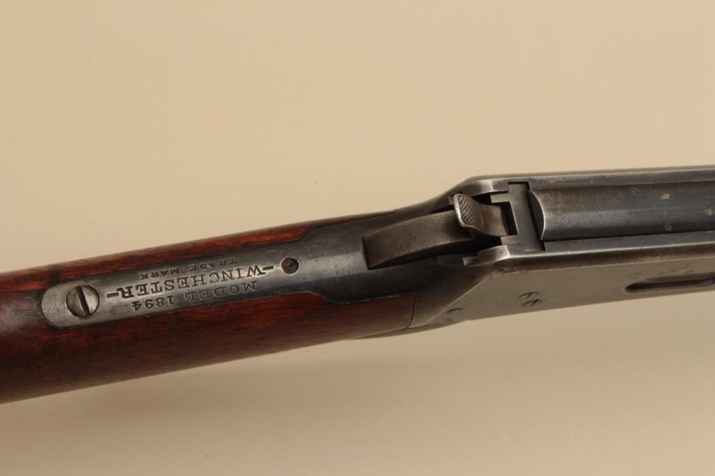 Serial #383483. The rifle is in very good overall condition with a 26” octagon barrel with an interesting see-through front sight. The barrel and full-length magazine retain the majority of their thinning blue finish with high point edge wear and loss of finish at the muzzle. The receiver shows significant old, flaking blue with some muted case hardening still evident on the hammer and lever. The smooth wood stocks show moderate wear with dents and compressions from use and carry. The butt ends with a smooth crescent steel butt plate. The bore is good, the action crisp and markings are sharp on this desirable model 94 (C+R). Est.: $800-$1,200.