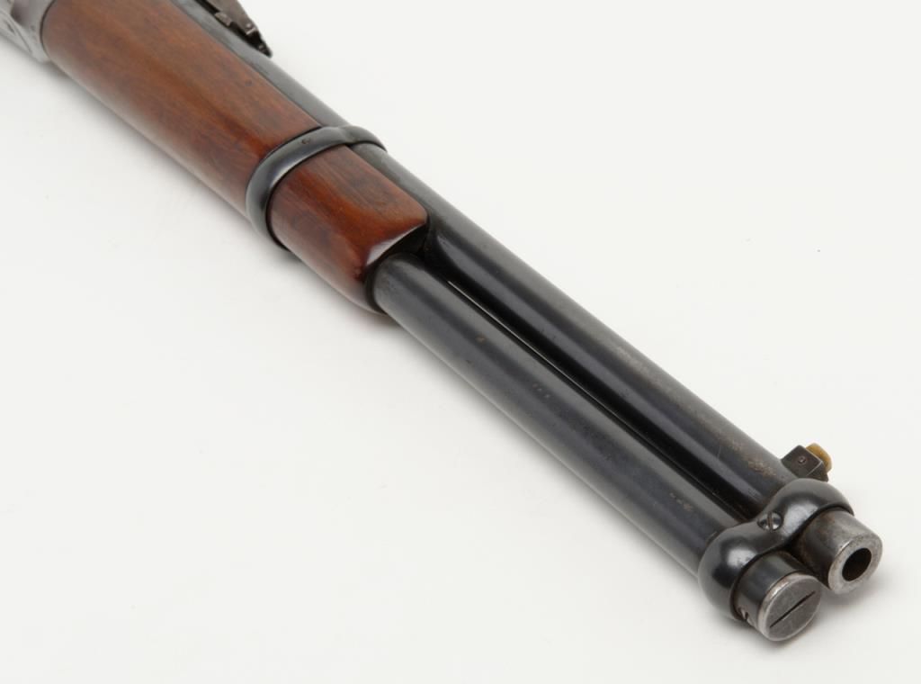 Winchester Model 1894 trappers model saddle ring carbine with factory 15” barrel in .32 Winchester special caliber with special smokeless rear sight, serial number 970044. The barrel and magazine tube show 90% to 95% original blue with someslight losses at the edges and muzzle. The frame shows 20% to 40% original blue drifting at the edges and on the right side. There is some staining and minor erosion also mostly on the right. The hammer and lever show generous tracesof case hardening. The loading gate shows most of its original blue. The stocks are good to very good with some minor handling marks and just normal aging. The action is working well and is tight and the bore is bright. Trapper models arescarce in .32 special. On ATF approved list. Est.: $4500-$9,000
