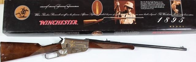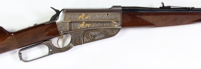 lever action rifle with 24" barrel, deluxe checkered stocks, beartifully engraved and inlaid with gold big game animals, remains unfired condition, several light storage marks to rear stock otherwise fine. Includes original box andpaperwork. Modern. Est. 750-1500