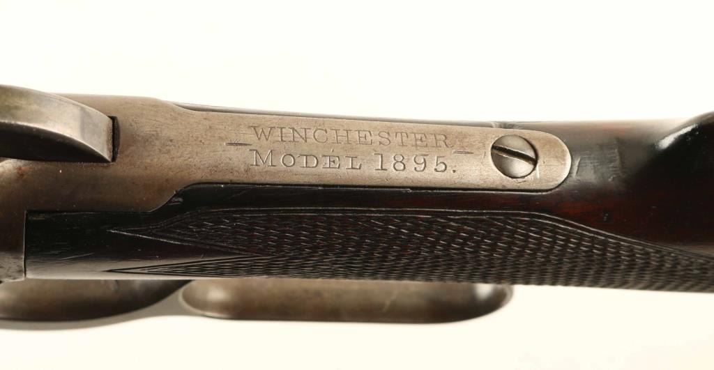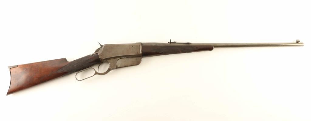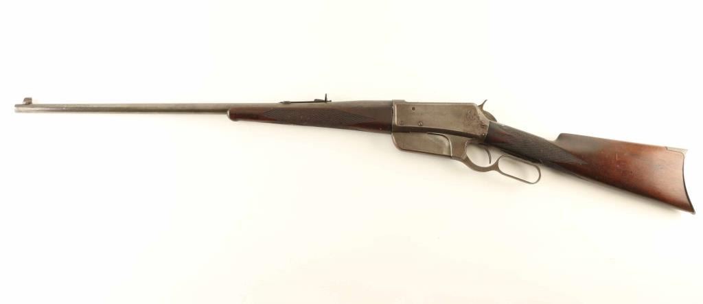 'Flat-Side Sporting Rifle' manufactured circa 1896. Features 24" barrel, buckhorn sights, vertical box magazine, straight wrist, steel crescent buttplate. Deep checkering panels at wrist & forend appear to be post-factory. Bore is fair to good condition, lightly frosted with strong rifling. Metal surfaces have majority coverage of medium brownish gray color finish, with areas of patina on receiver, several sharp strikes to both sides of barrel several inches forward of breech. Chip missing from forend ledge at front left edge of receiver. Buttplate is good condition, fairly smooth with patina brown coloration. Screw slots appear cleaned slightly to correct marring. Wood is fair serviceable condition, dark & stained, with shrinkage or erosion at tang and buttplate. Buttplate fit is poor to fair, and slightly loose. Markings are readable, sharp edged letter with some thinning of two line barrel address and "30 US" caliber marking. Action operates smoothly. Condition is NRA Very Good *** Antique Firearm ***
